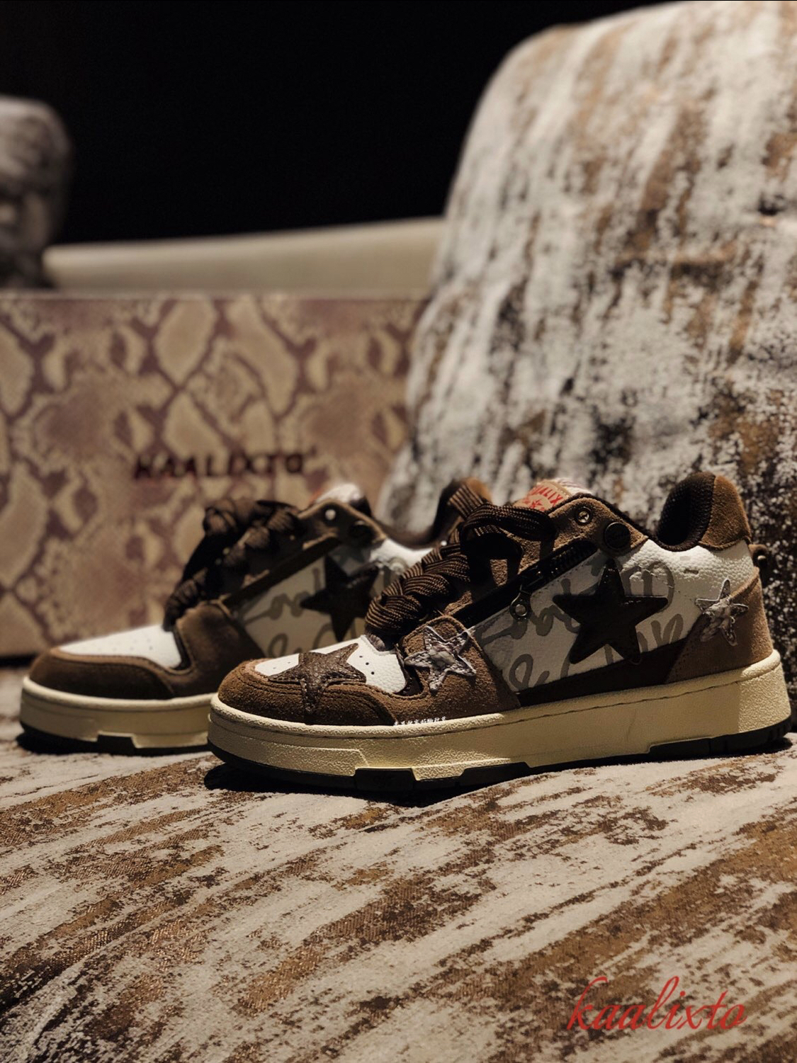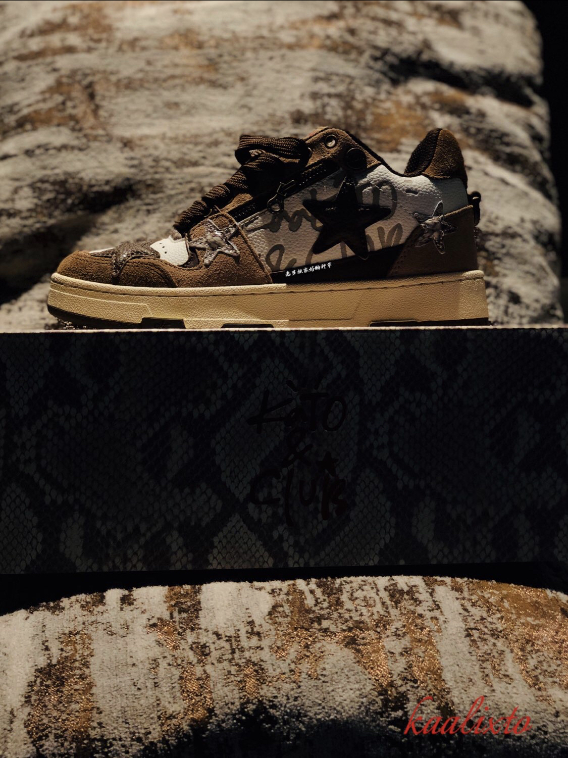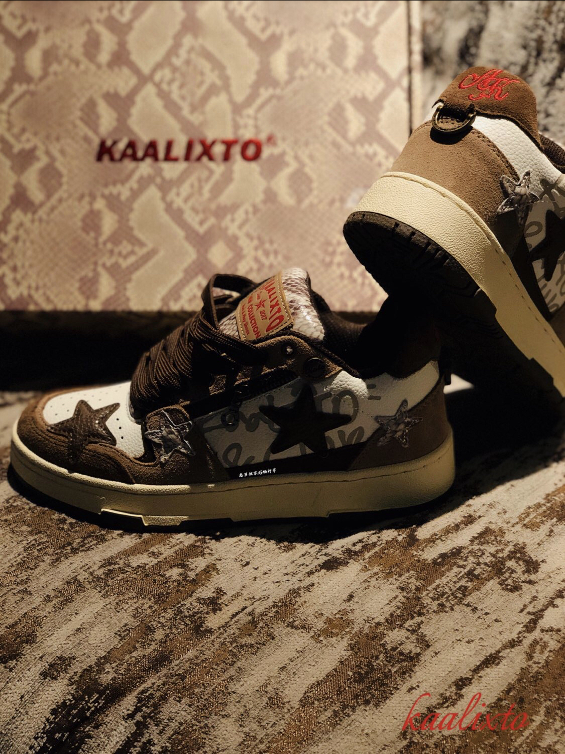 作为国潮 经典的复古滑板鞋型 kaalixto 这次的棕色🏾 王鹤棣 同款 作为鞋狗 很少有人会拒绝 确实有两把刷子 此次 规格如果 要剖析的话 分以下几点: ☝️:包装 可以算是 收藏规格 蟒蛇纹花色 搭配酒红色 logo 印花 其实有大牌气势 ✌️:回到鞋款 规格之上 帮面 材质 使用两种皮革 咖色翻毛皮提升整体质感 白色鞋身以咖色品牌印花 帮面招牌 五角星⭐️ 以咖色皮革 搭...