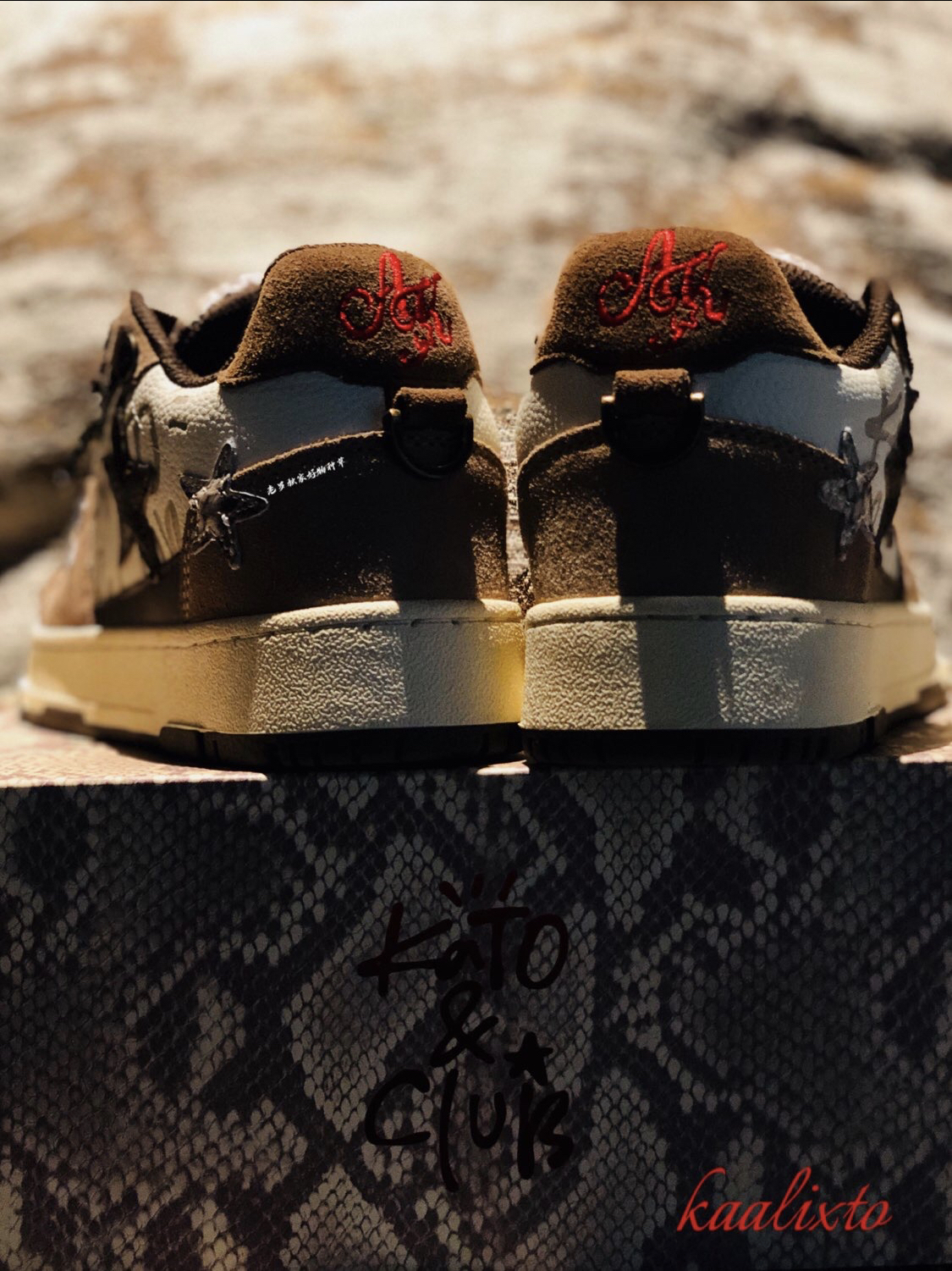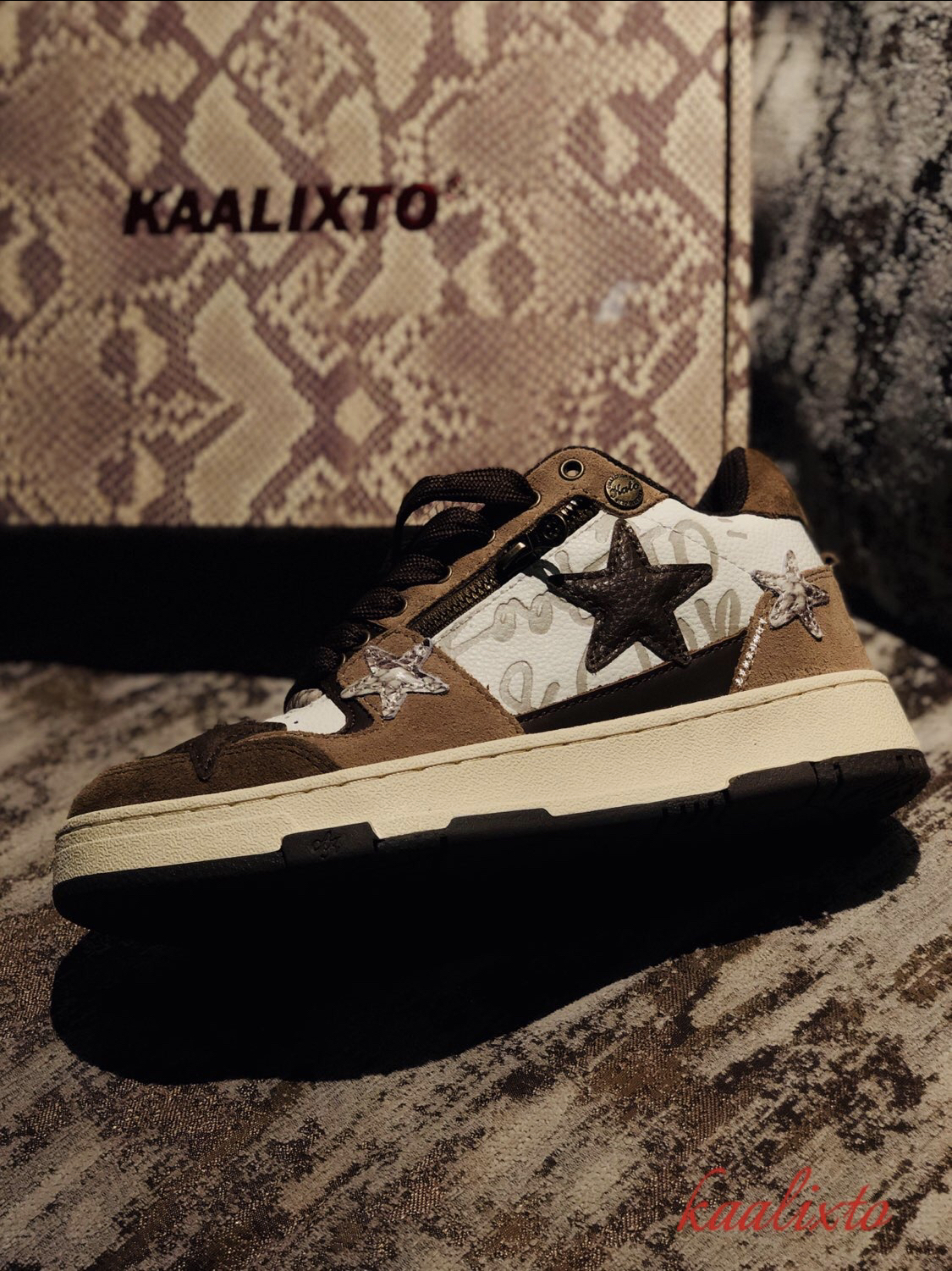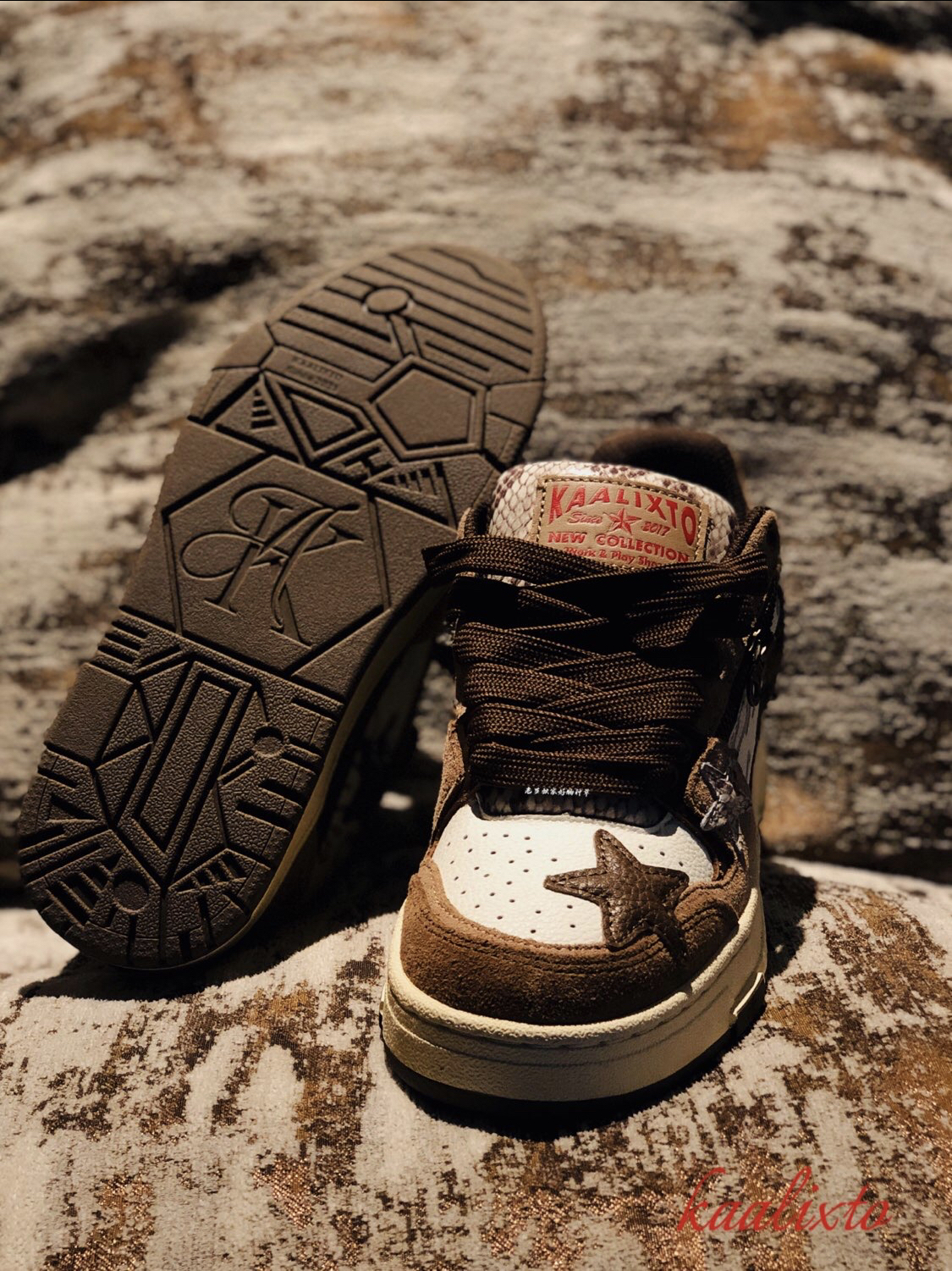 作为国潮 经典的复古滑板鞋型 kaalixto 这次的棕色🏾 王鹤棣 同款 作为鞋狗 很少有人会拒绝 确实有两把刷子 此次 规格如果 要剖析的话 分以下几点: ☝️:包装 可以算是 收藏规格 蟒蛇纹花色 搭配酒红色 logo 印花 其实有大牌气势 ✌️:回到鞋款 规格之上 帮面 材质 使用两种皮革 咖色翻毛皮提升整体质感 白色鞋身以咖色品牌印花 帮面招牌 五角星⭐️ 以咖色皮革 搭...