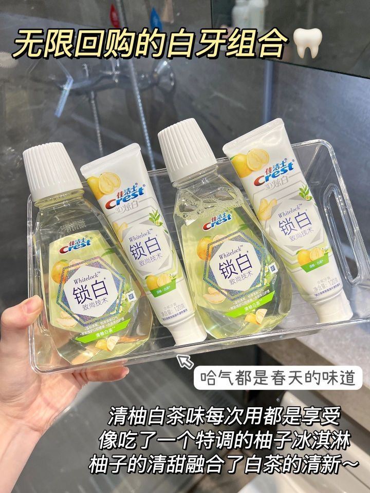 本篇笔记关联了佳洁士 锁白温和不刺激口气清新漱口水 清柚漱口水、Crest/佳洁士 锁白致尚技术含氟牙膏 减少牙垢牙渍清新口气去黄 清柚白茶等商品,为用户提供真实的使用体验和购买参考。