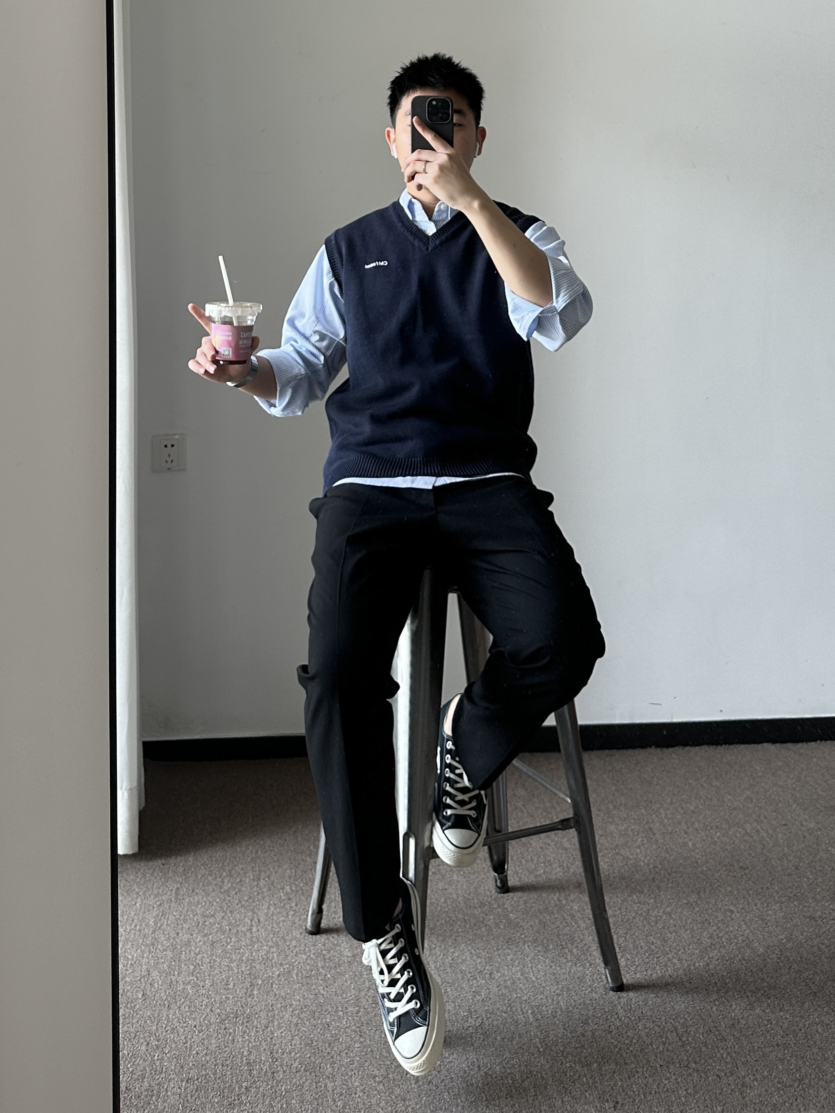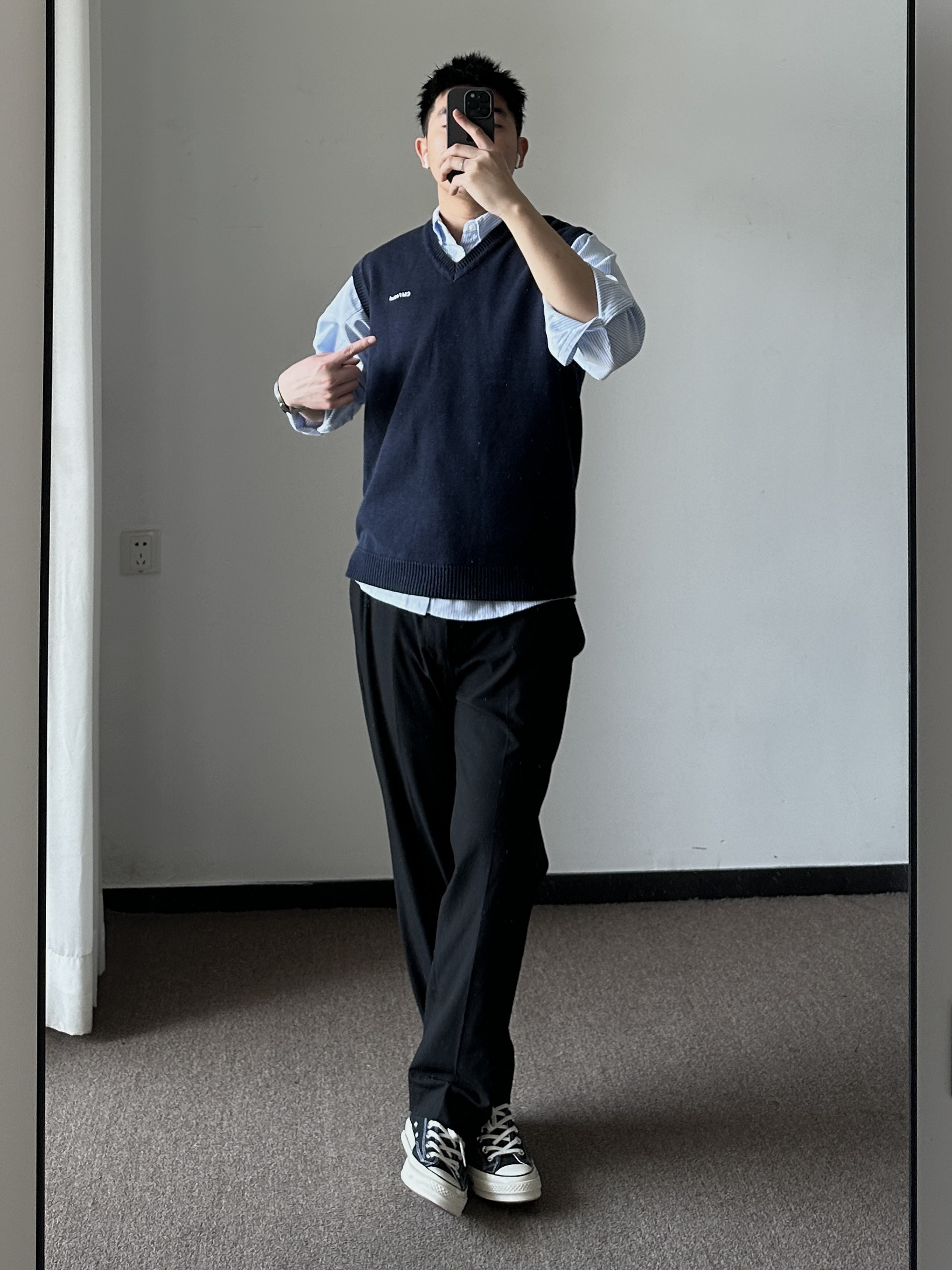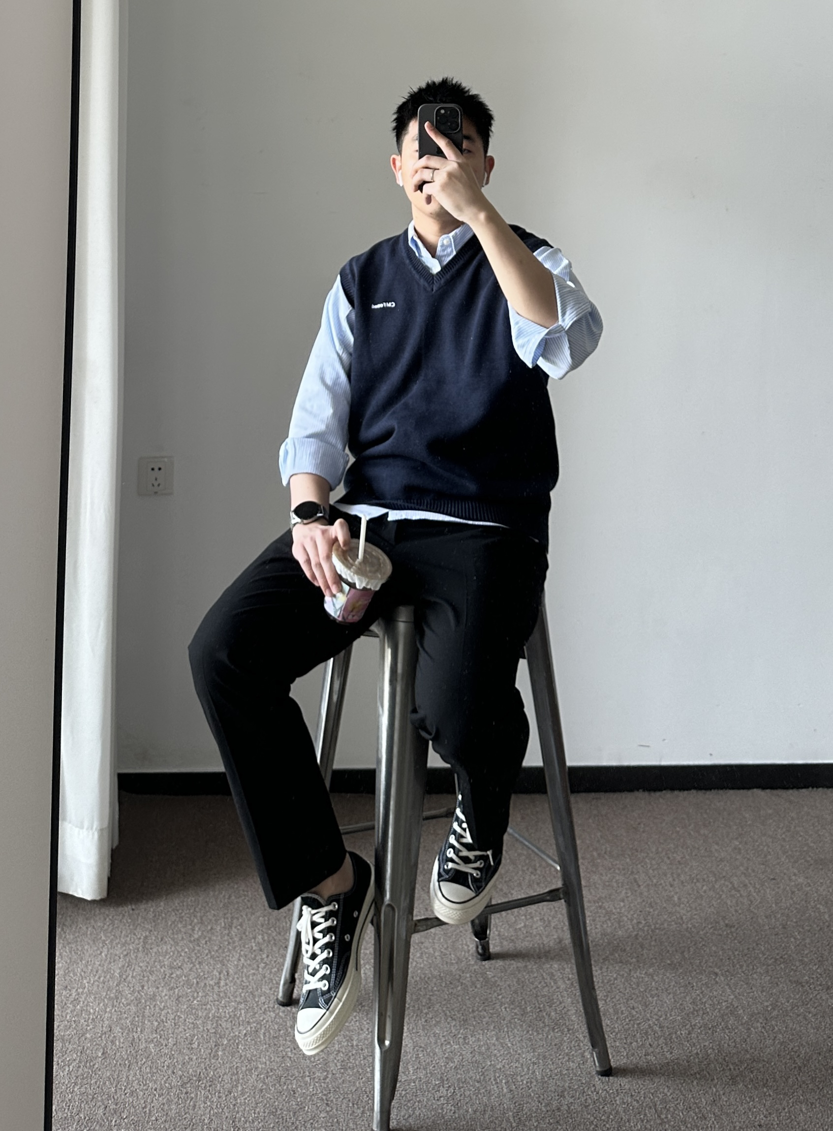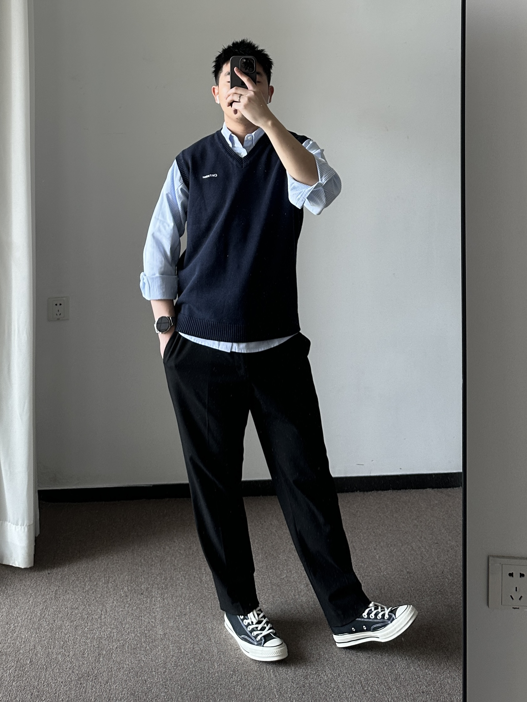 素人也能好看系列~ 174cm/65kg 🧥-衣柜怎么地也要有一件百搭针织毛衣吧,选一个中性、简约款做叠穿。 👖-黑长直西裤。 👟- 经典匡威