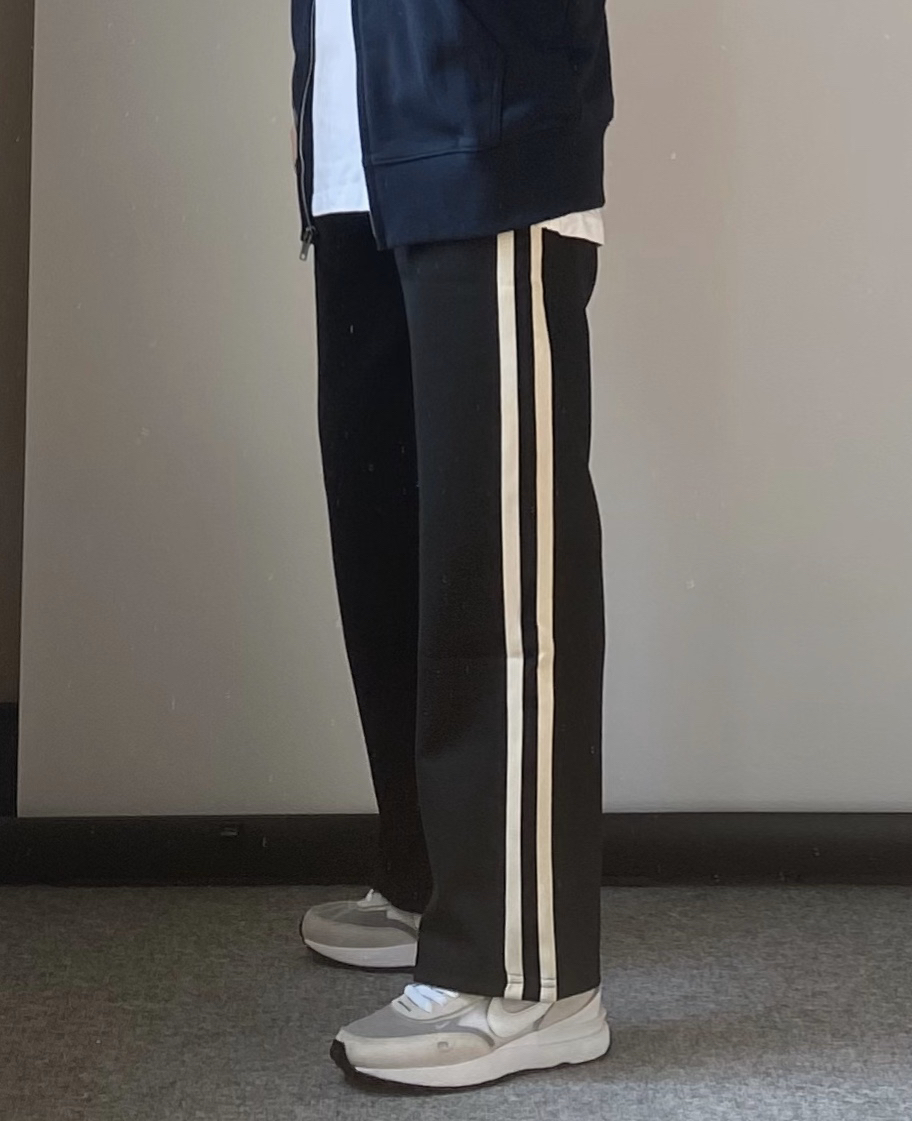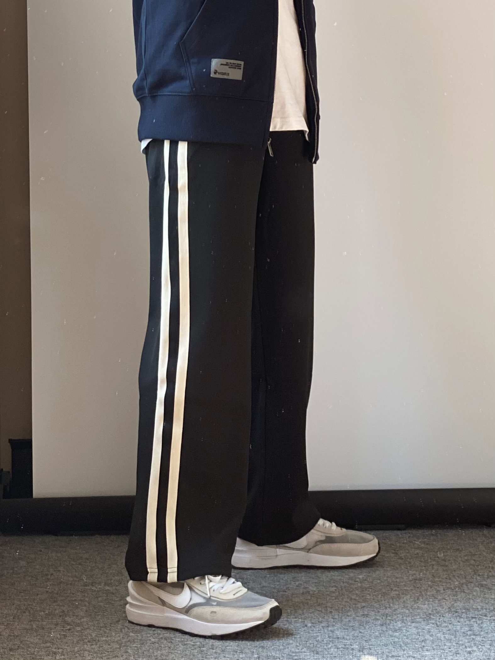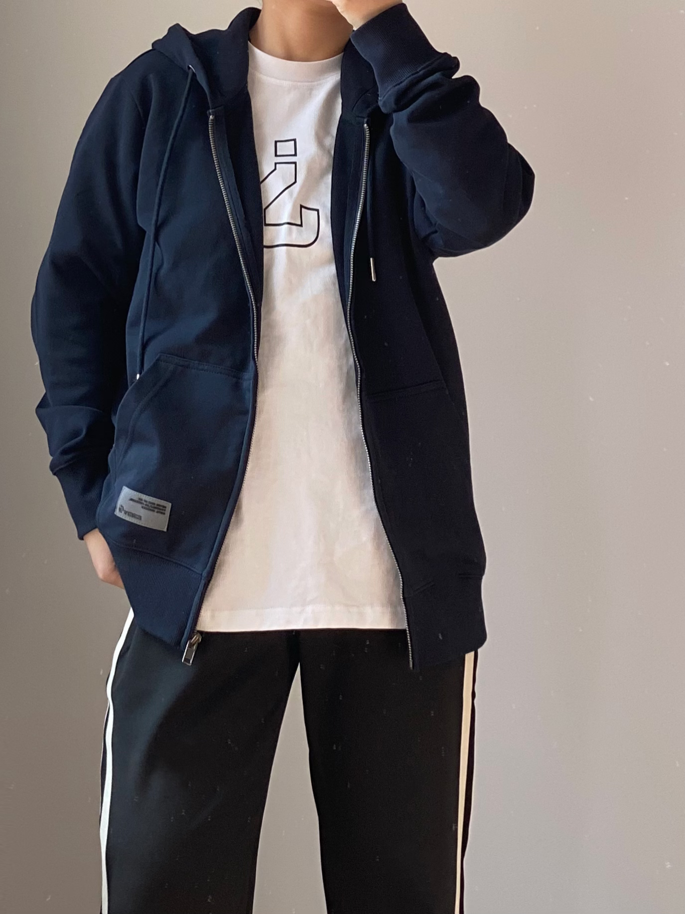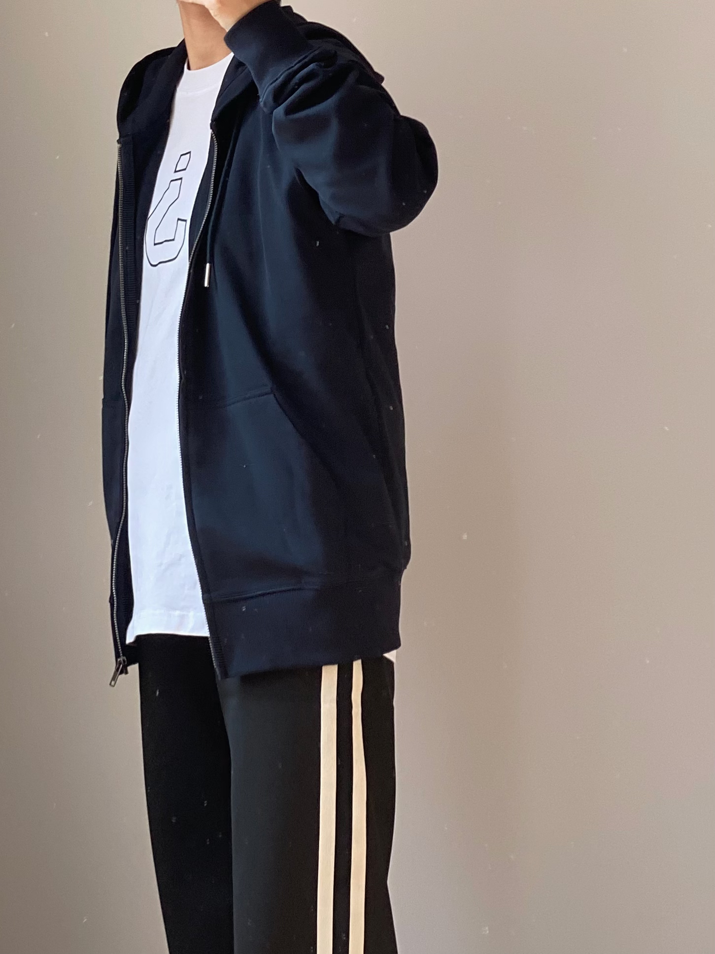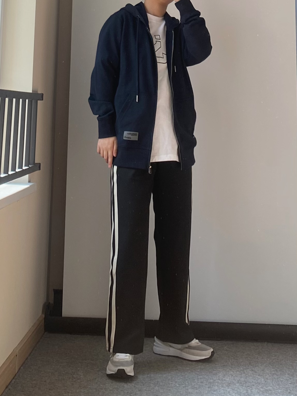 简单干净的纯色系 也可以搭配的很好看 藏青色的连帽开衫外套 侧边白色织带的黑色直筒休闲裤 上身真的超级显高
