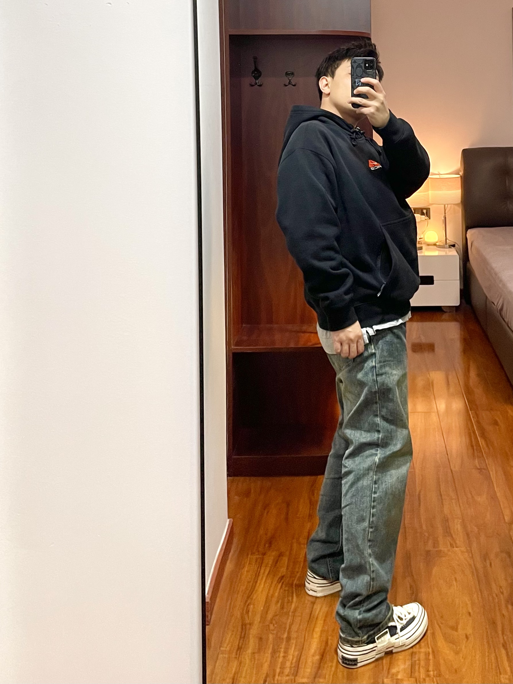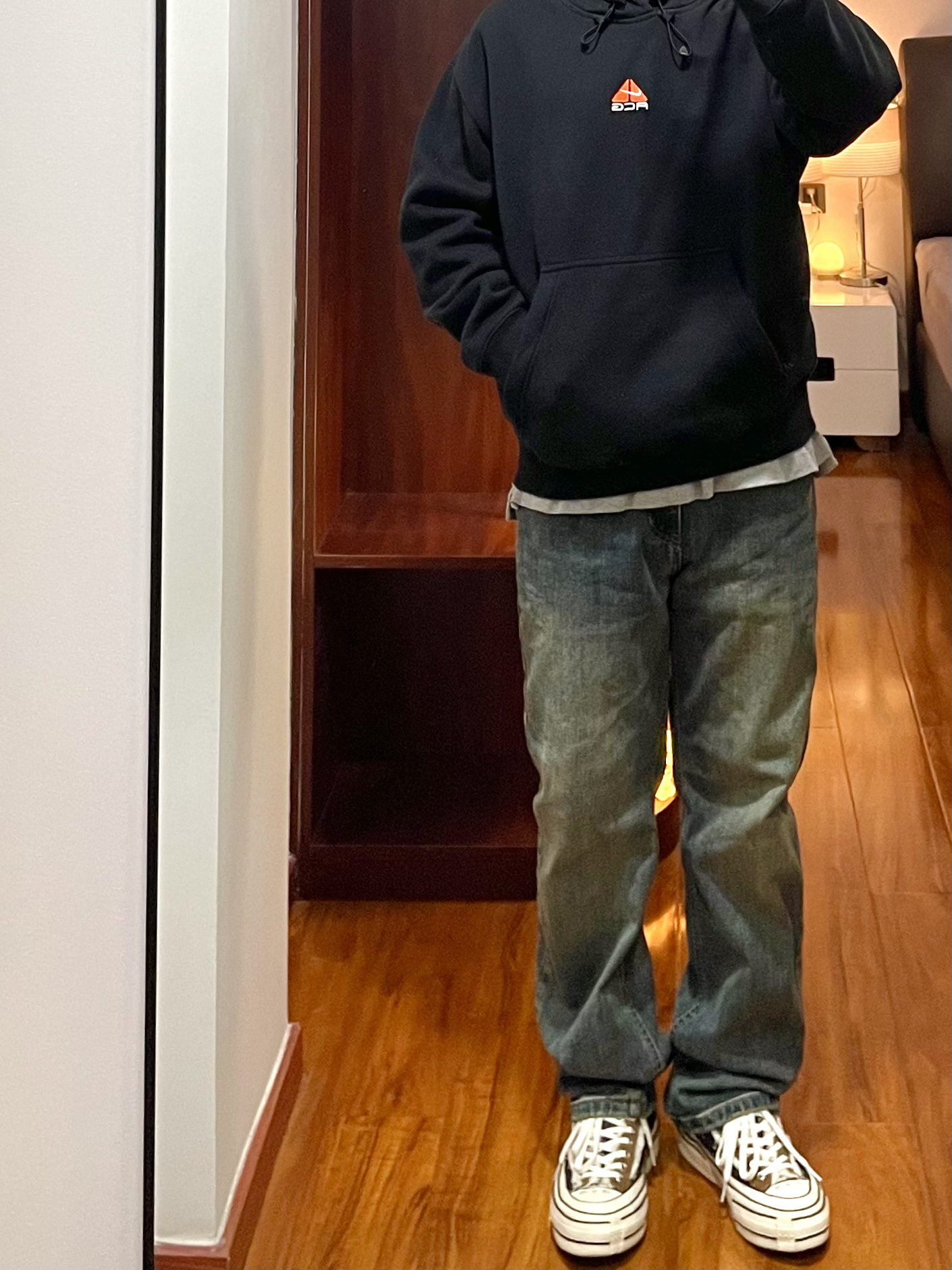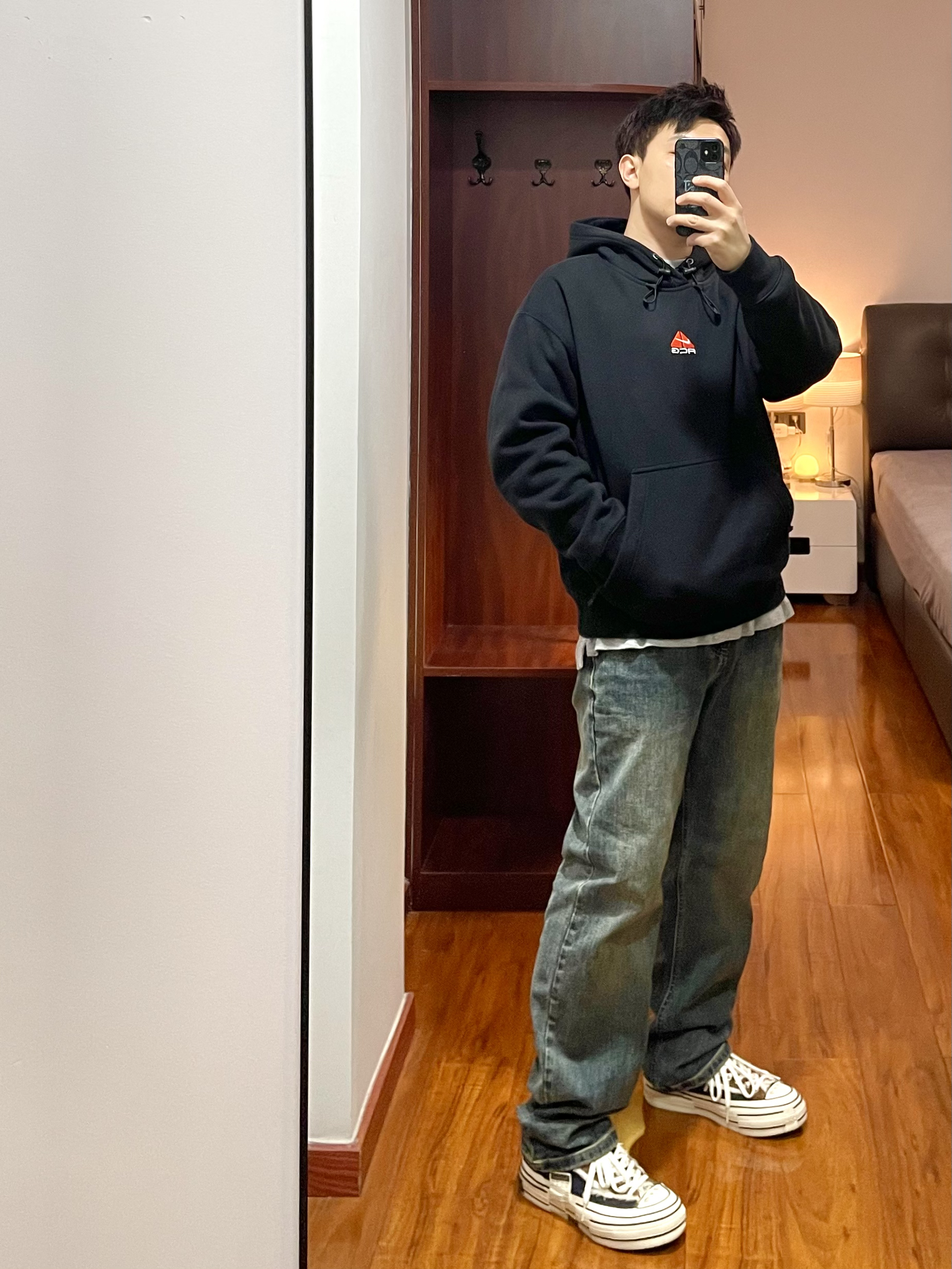 170/135斤 一个普通人的穿搭分享 👔:Nike acg卫衣 ACG卫衣防水透气可以快速排汗,日常简单的户外活动穿着合适,卫衣版型宽松偏厚有温度,春季早上夜晚穿着合适。 👖:复古牛仔裤 微黄做旧的配色,裤型宽松硬朗,裤脚处有依然的堆叠效果。 👟:xvessel 硫化鞋 厚底的硫化鞋,中底部分有软木塞材料,脚感软硬适中有回弹,配色为牛仔拼接。