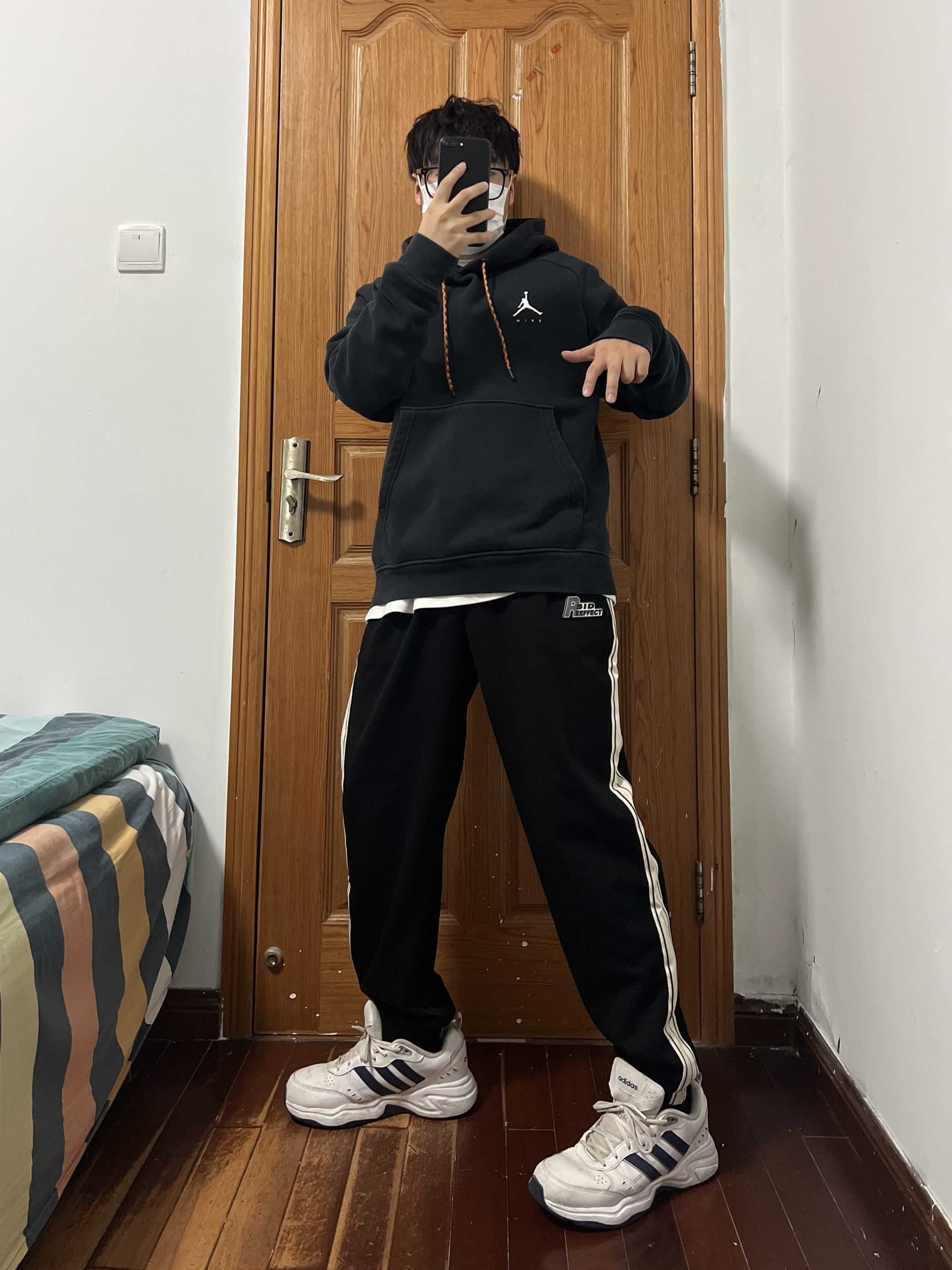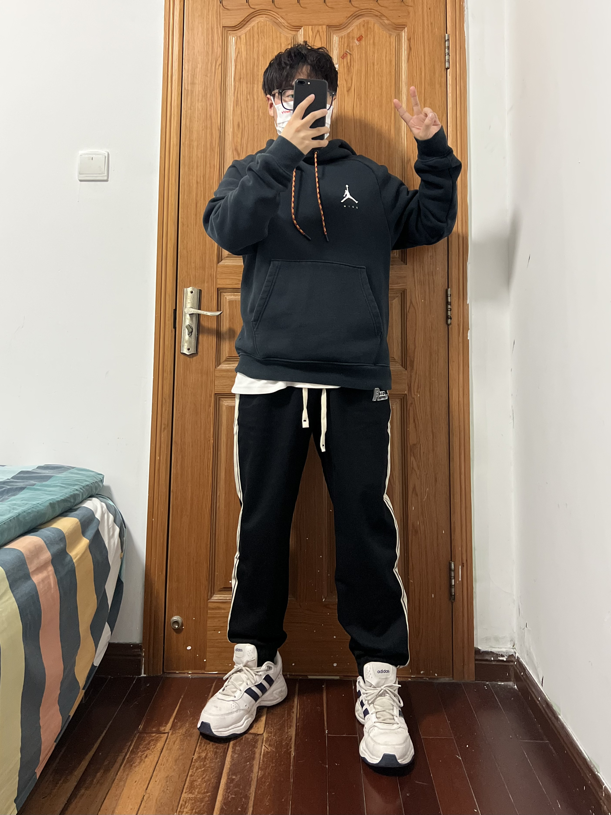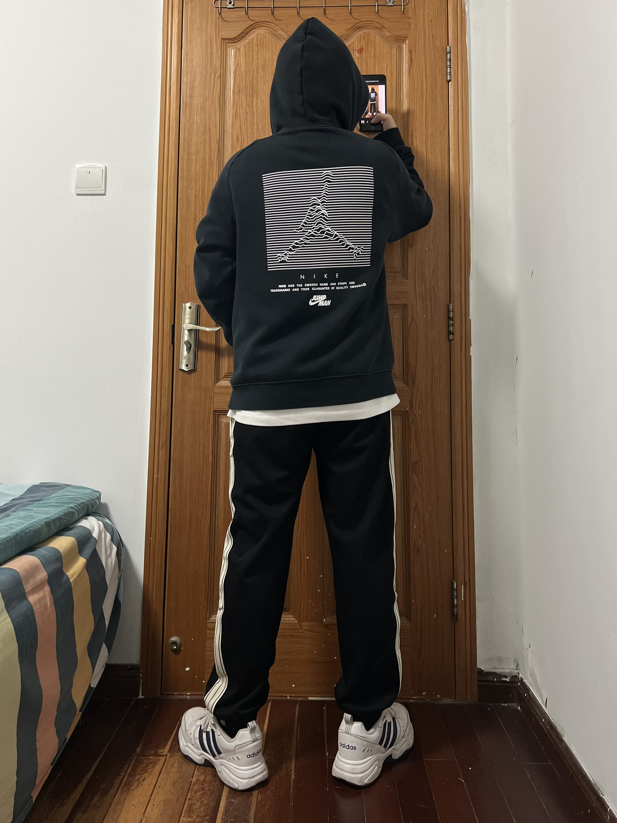 今日份穿搭分享🎉 上衣一件简单的黑色卫衣简单百搭人人爱 裤子是SIDEEFFECT 黑白条纹撞色束脚裤 运动裤那肯定是束脚的好啦,方便运动且修身喽 侧边黑白条纹的设计使得整体裤型更具有运动感 宽松的版型也对各种身材友好上身满满少年感❤️ 显瘦休闲俩不误,这种百搭的裤子怎么穿都帅气 秋冬卫衣外套都🉑️,春夏短袖长袖完美搭配❗️ logo设计是有质感的立体标哦,小细节超喜欢 搭配双阿迪运动鞋,整个就是...