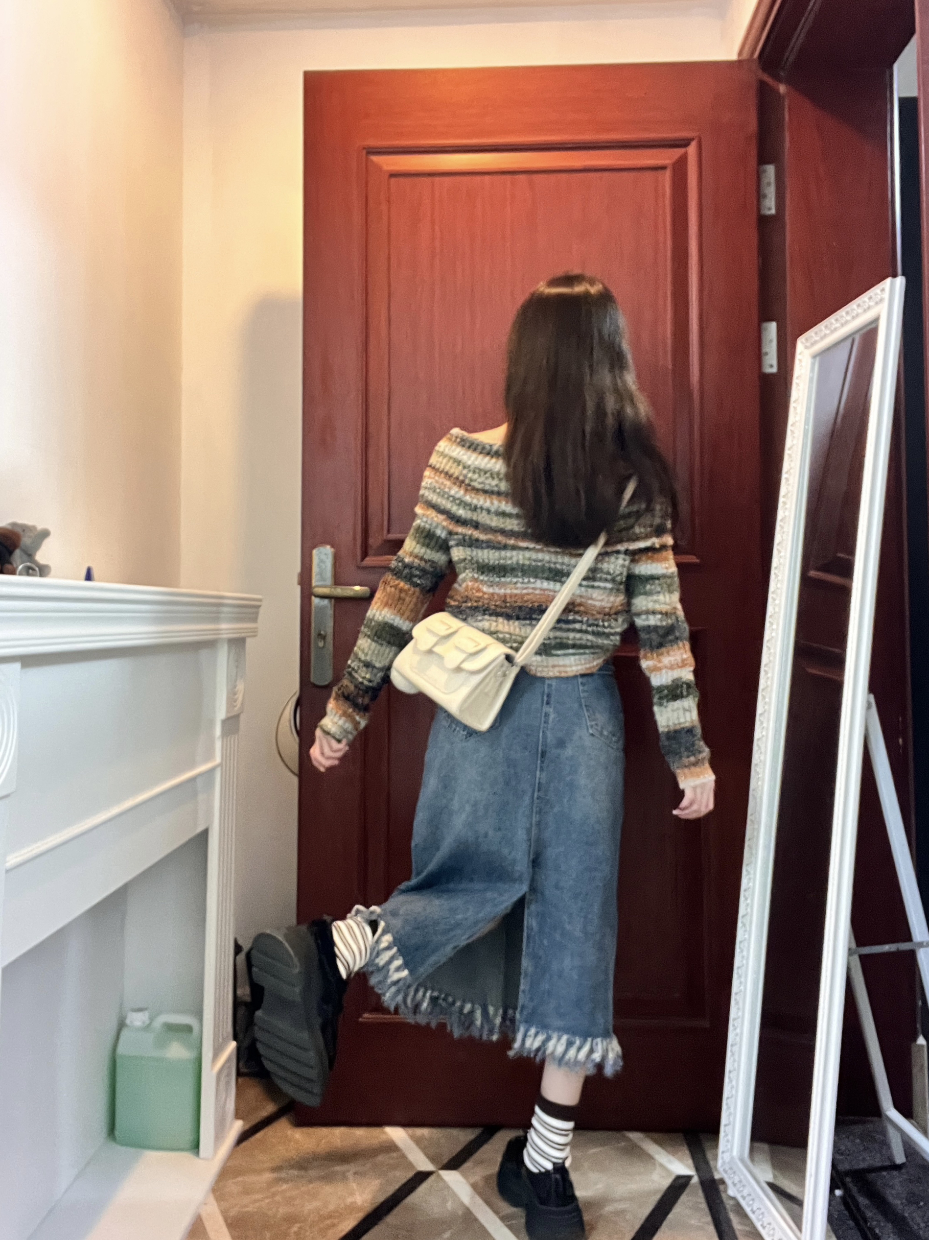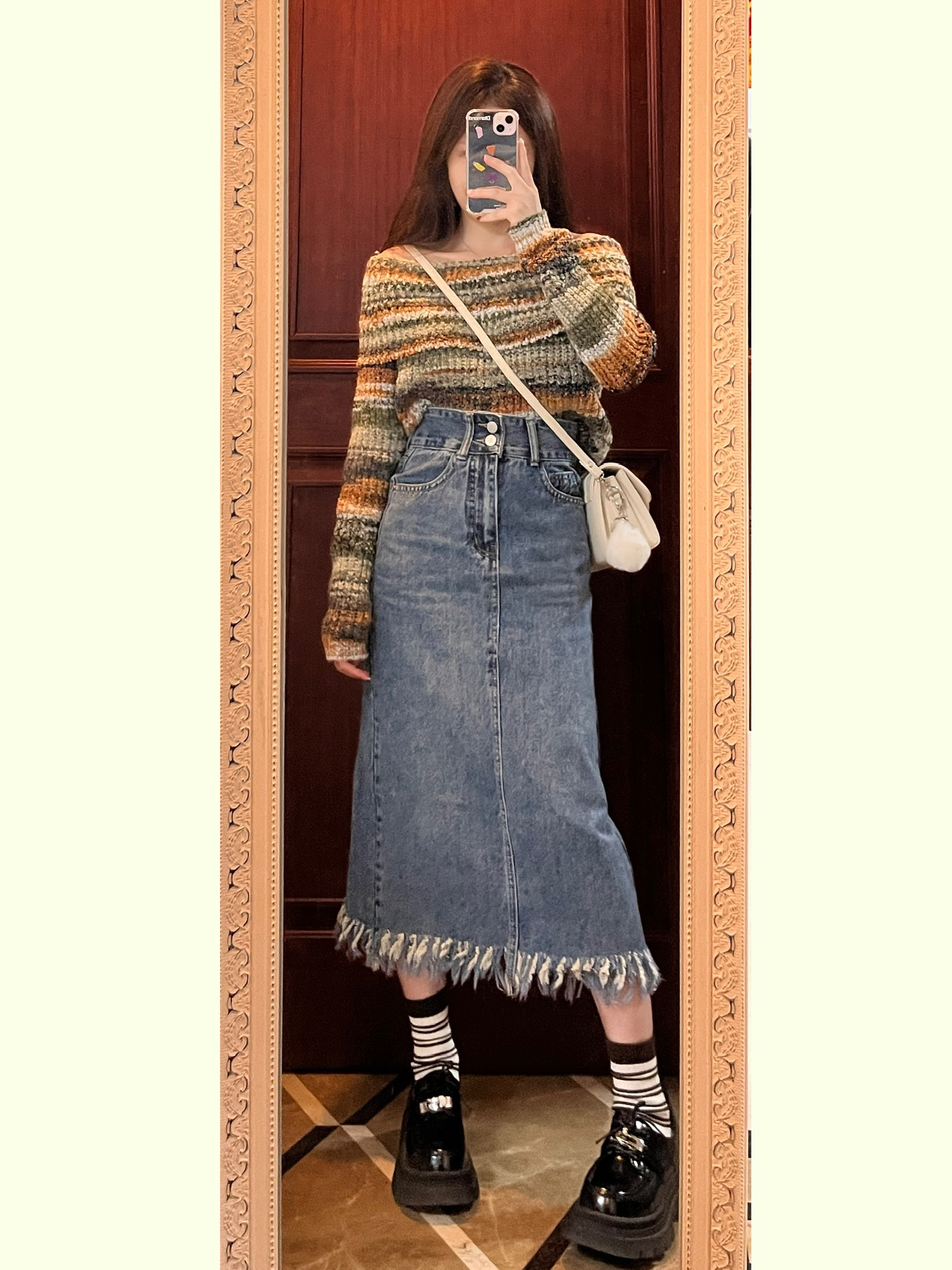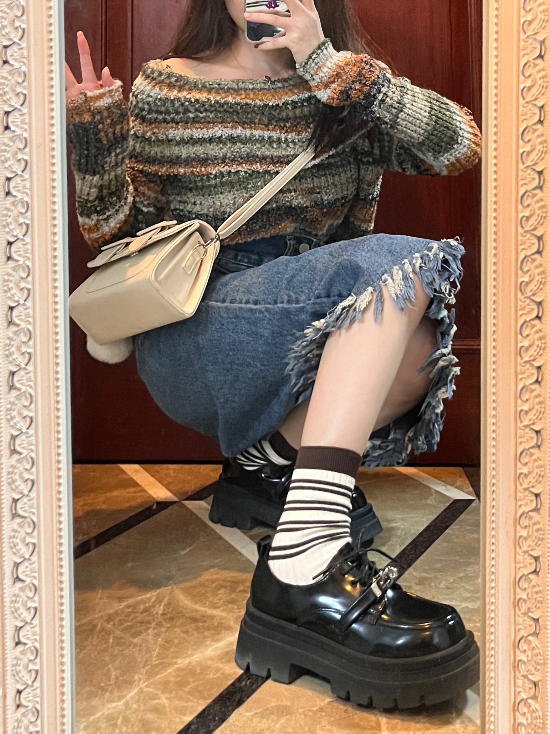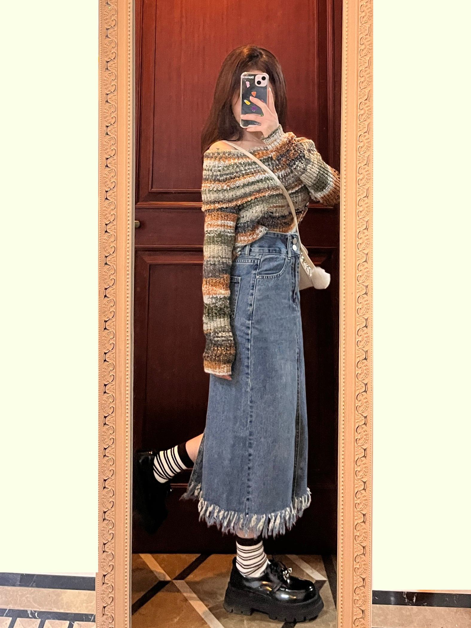 裙长对小个子敲友好~ 一字肩针织毛衣➕流苏裙 搭配厚底鞋 真的很显高~