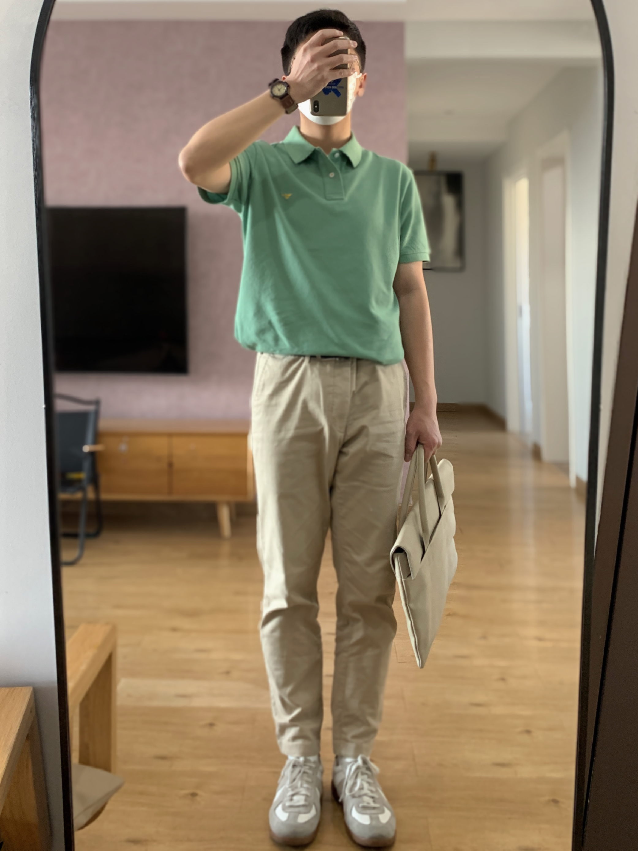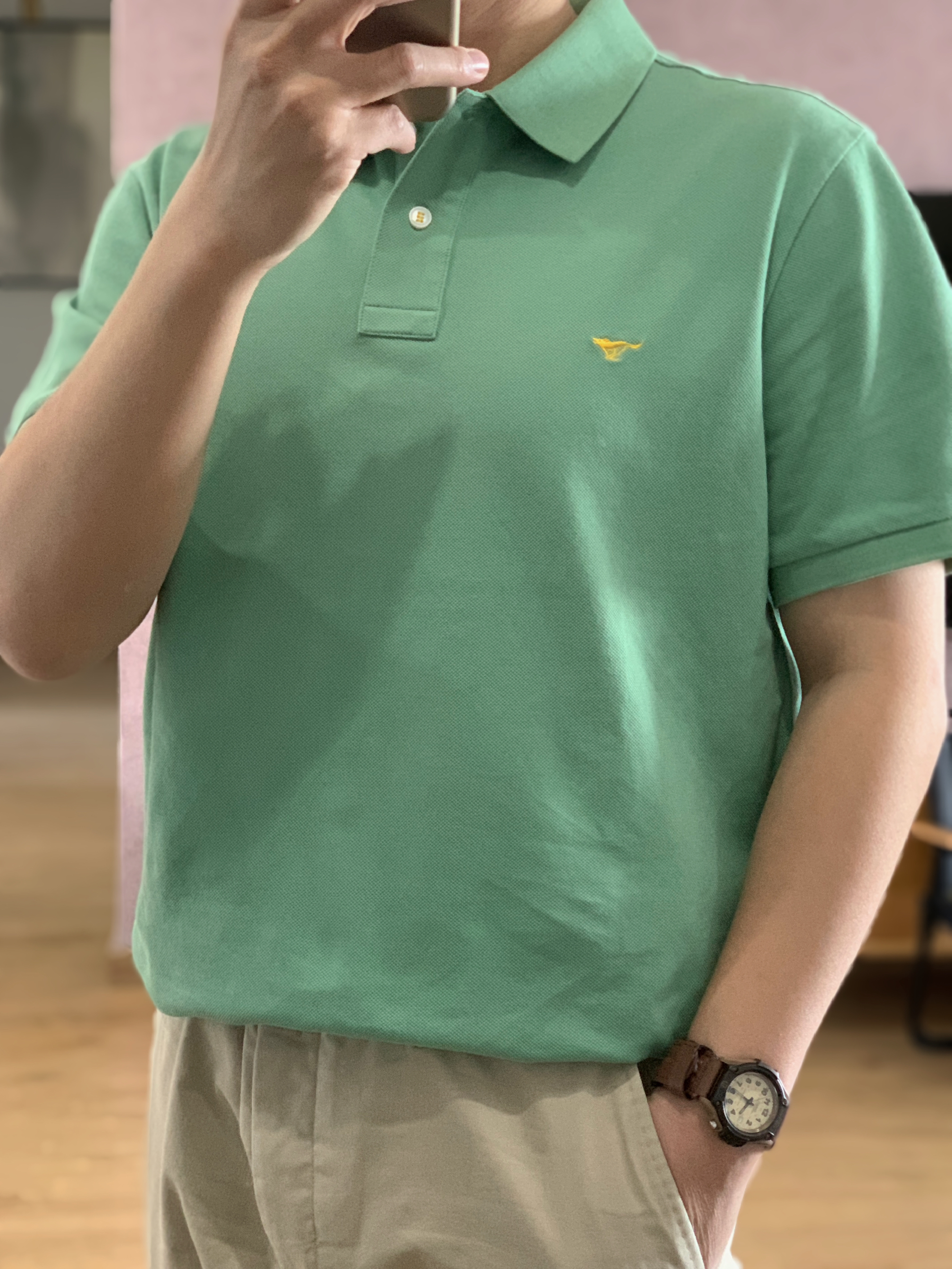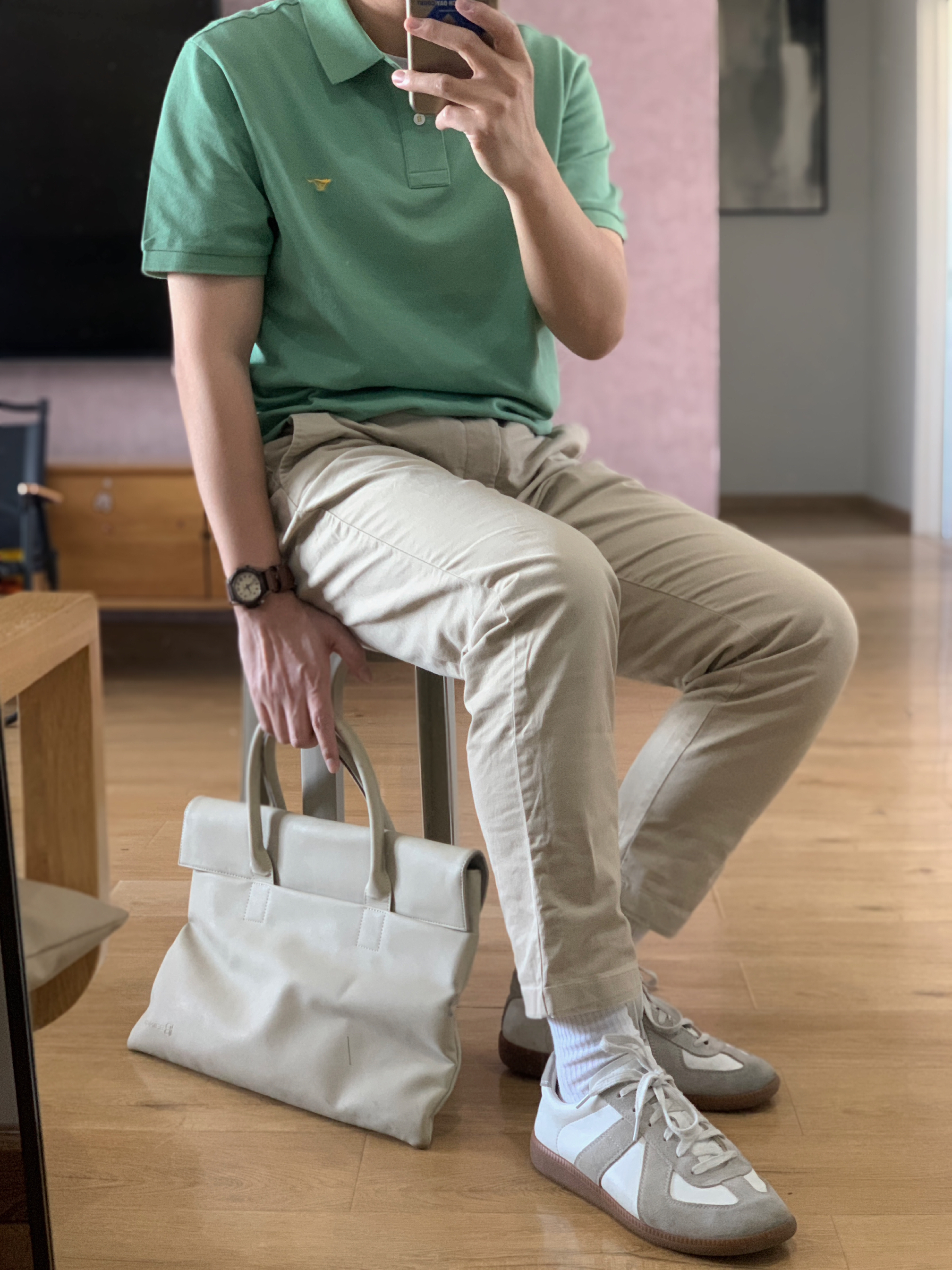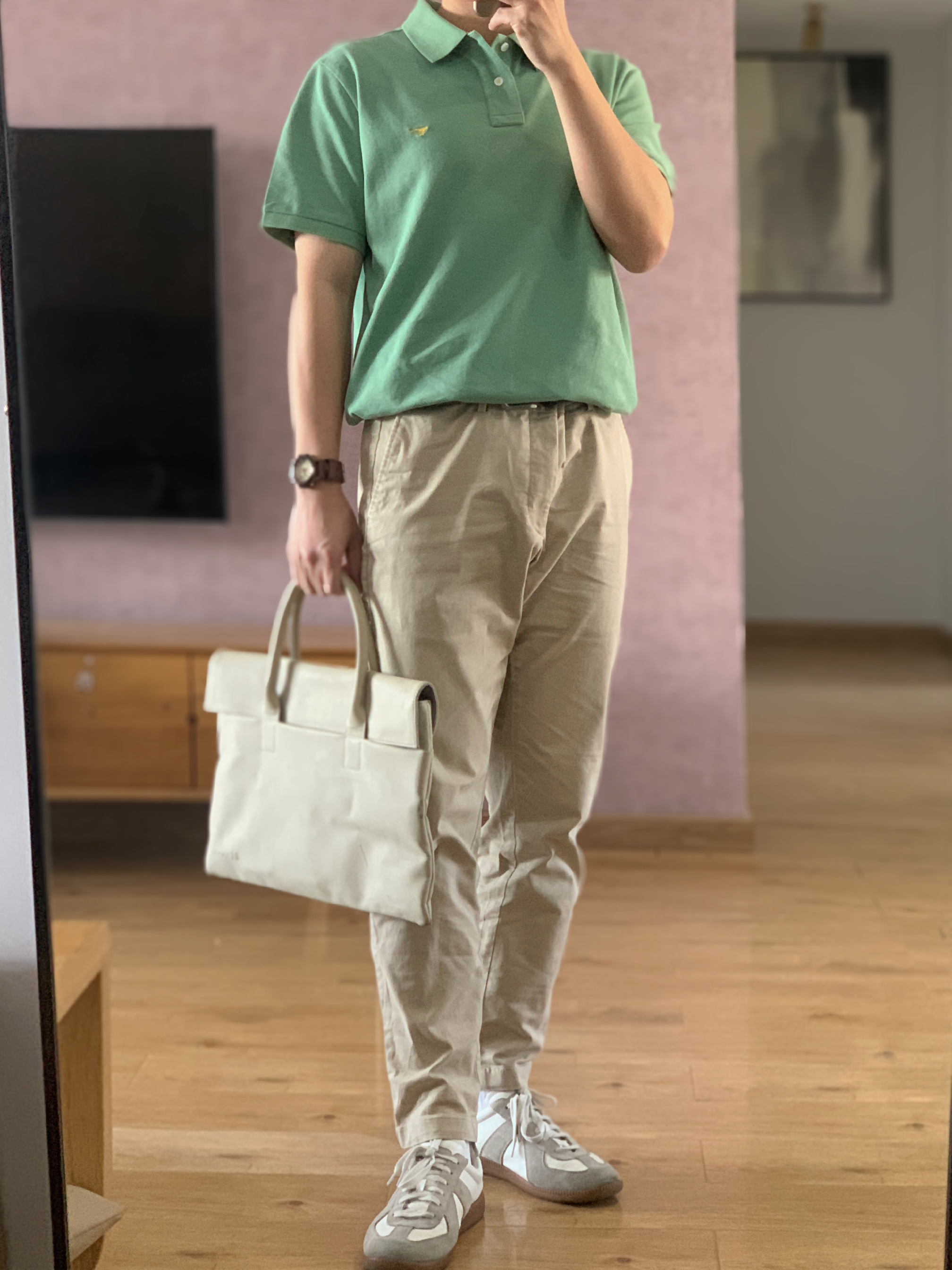 hey 这里是每天记录穿搭的社畜日记😘 之前发体制内穿搭你们总说不够体制 那今天就彻底体制一把[doge] polo衫跟衬衫真的是我们每天通勤必备了 选择了颜色稍微年轻点的灰绿色 灰绿色polo+卡其休闲裤+德训鞋 简简单单的通勤穿搭就是这么容易啦!