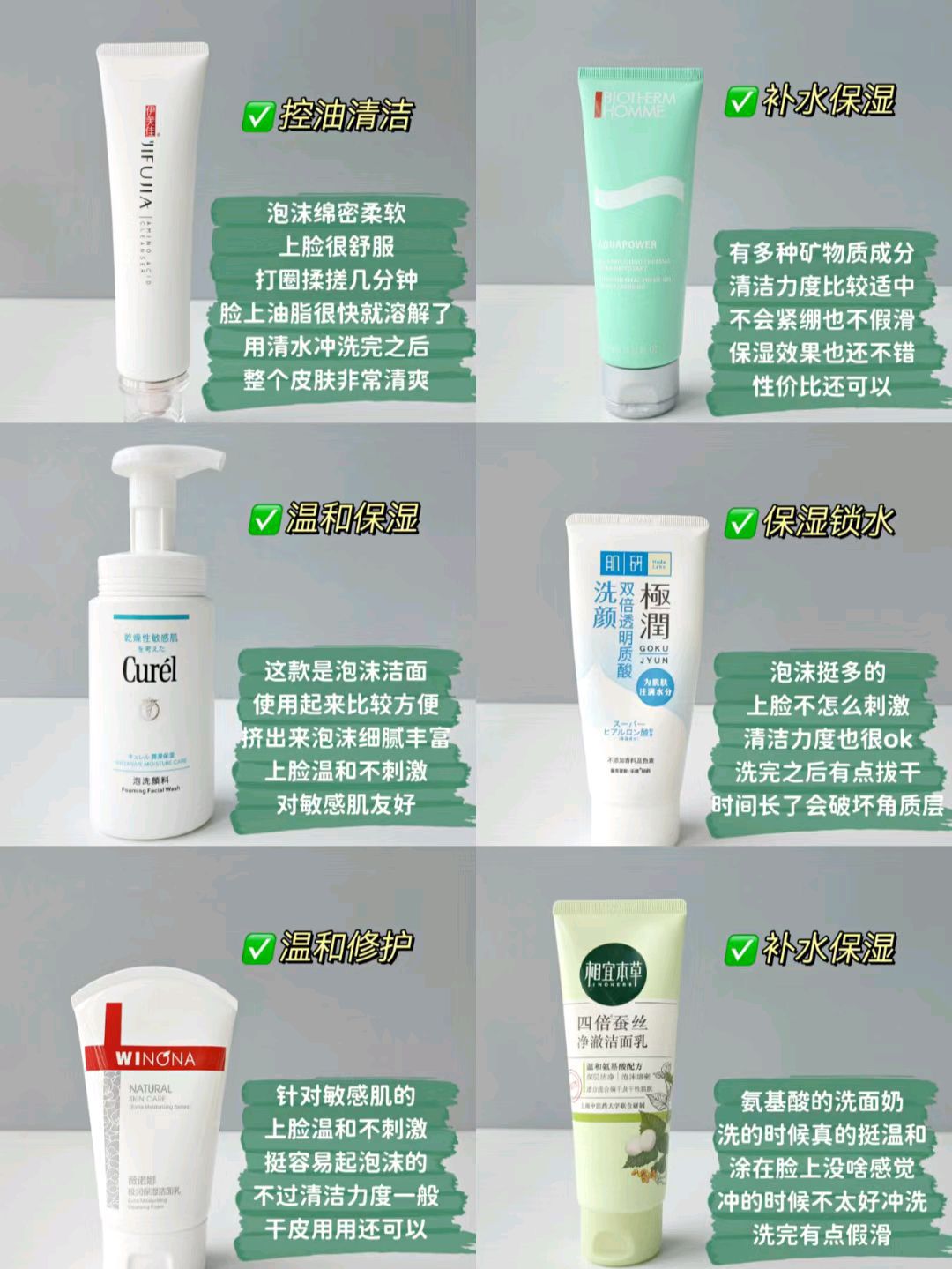 🌈常用洗面奶分享! 今天整理了6款比较常见的洗面奶, 都是个人的真实使用感受, 你们可以作为参考, 但不要偏听偏信哦。 1⃣伊芙佳氨基酸洗面奶 2⃣薇诺娜洗面奶 3⃣肌研洗面奶 4⃣相宜本草洗面奶 5⃣碧欧泉洗面奶 6⃣珂润洗面奶 ✔️一般来说,干皮适用的洁面奶,会选择什么芙丽芳丝啊,什么氨基酸成分的洁面。 ✔️不过我一没钱二还是没钱,就选择了国货相宜本草,大学的时候用过它的基础洁面,是霜状的那种...