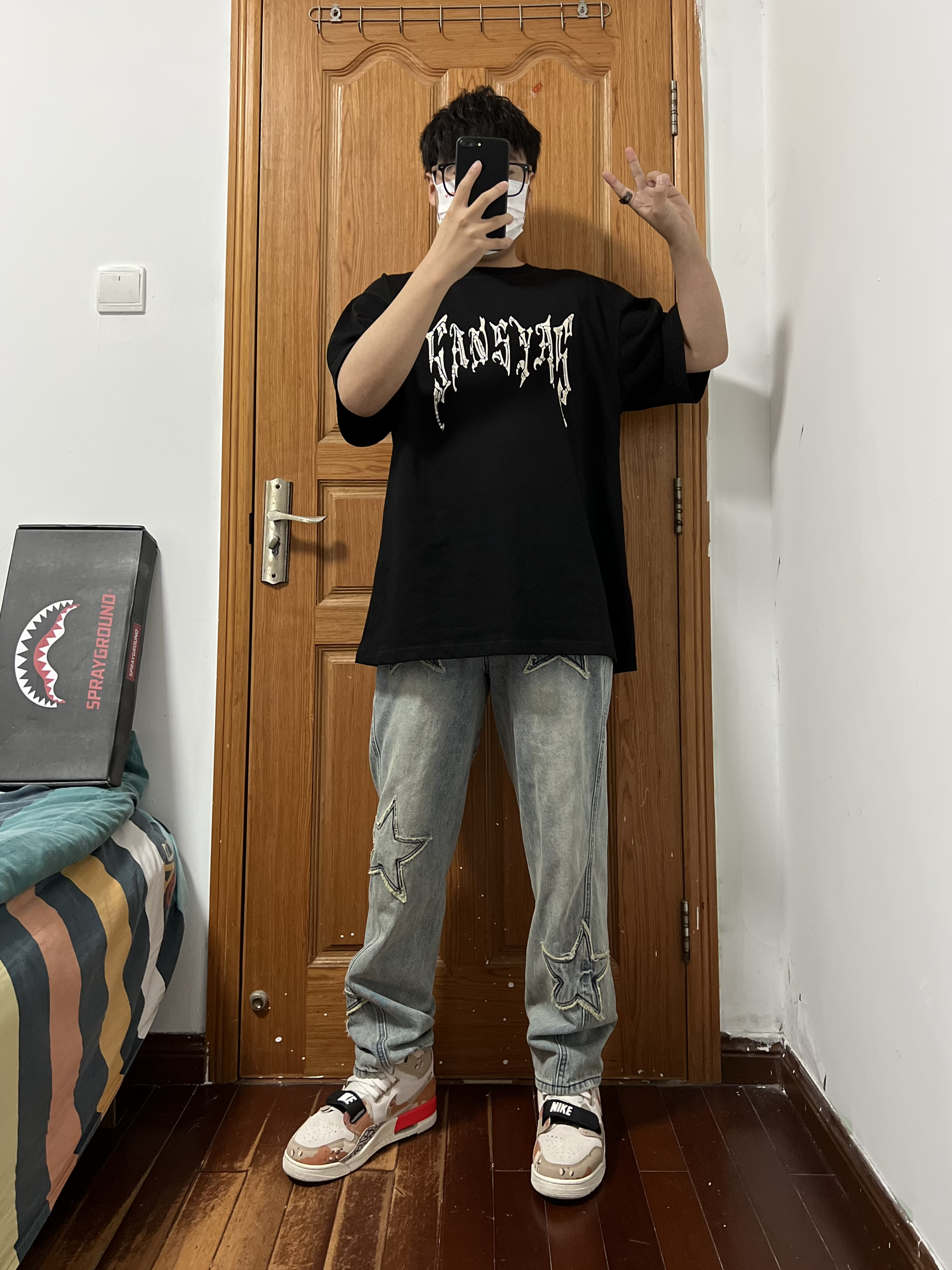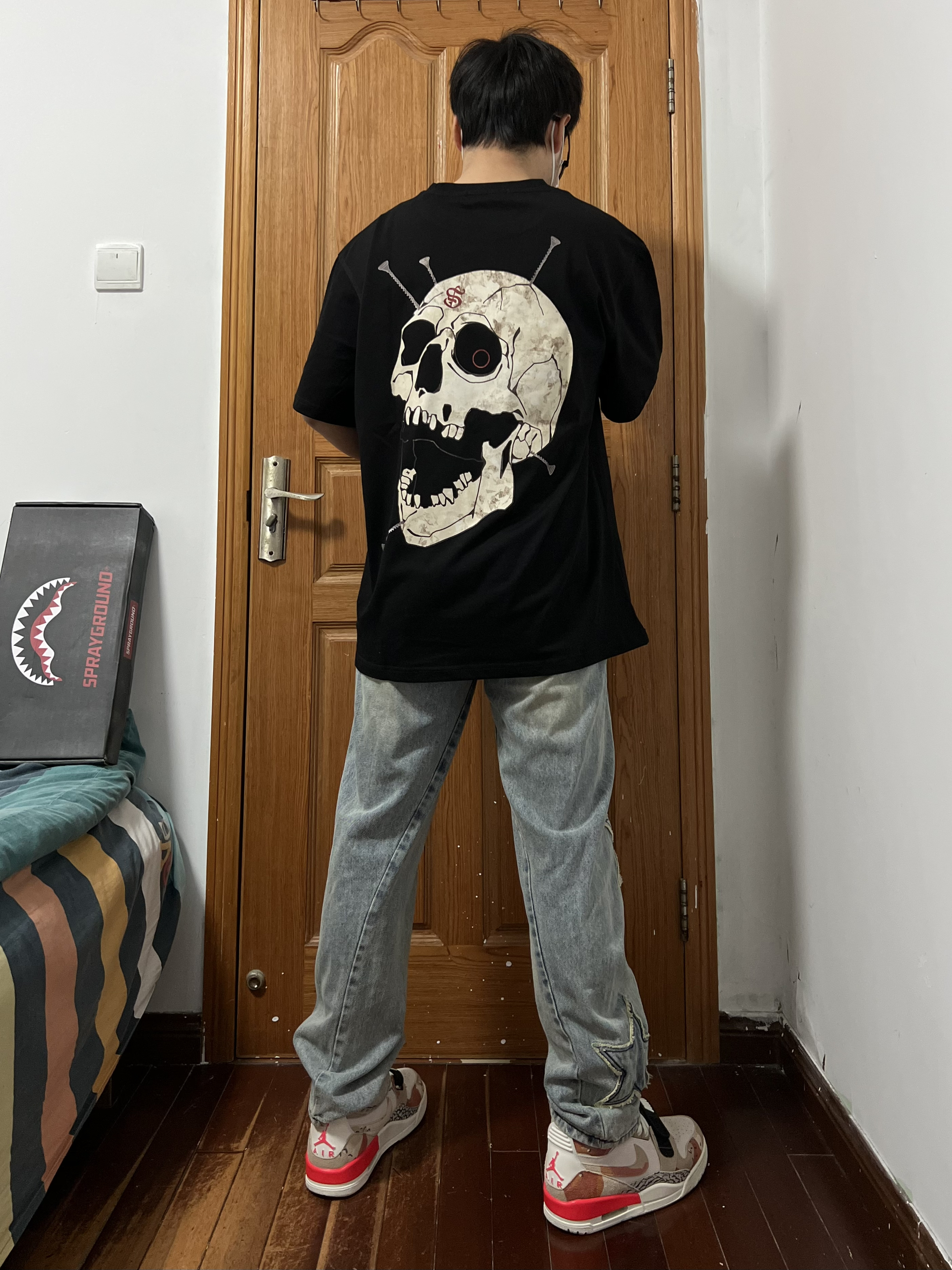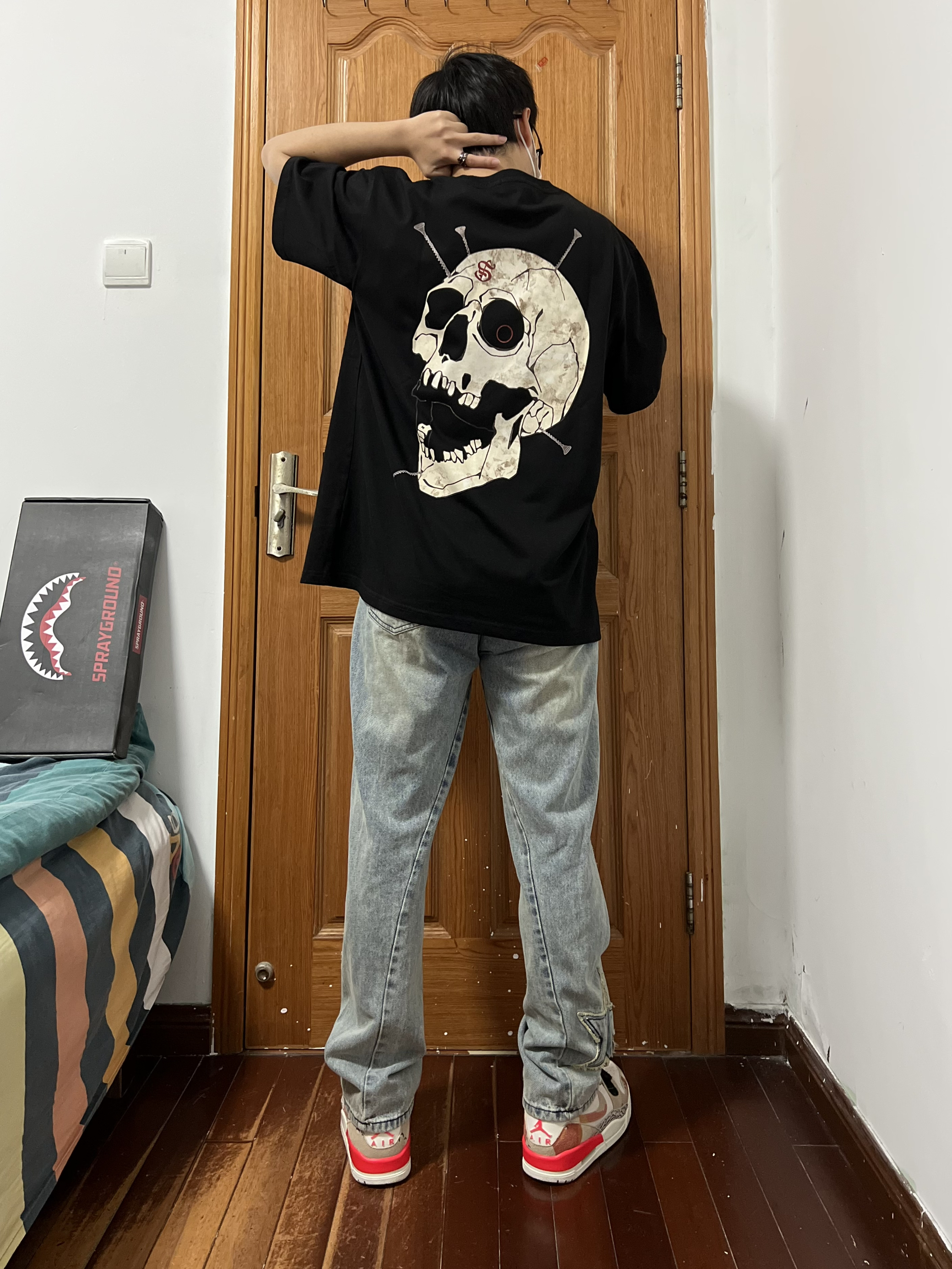 今日份穿搭分享🎉 木村三社 骷髅印花T恤短袖 如果夏天总要有件黑T 那有它就够了❗ ️整体设计非常恰合日漫风作为日式休闲风也合适 前印花为骷髅字母拼接背印花巨大☠️醒目帅气 与进击的巨人真的很像超爱是我夏天的心头爱❤️ 纯棉质感宽松版型很舒服前后印花恰到好处 不管是长裤短裤还是日常生活都帅到不行 搭配一条浅蓝色🌟🌟裤真的显瘦显白帅气 再来一双AJ312沙漠迷彩一整个气质提升潮男🉑️ 👔 木村三...