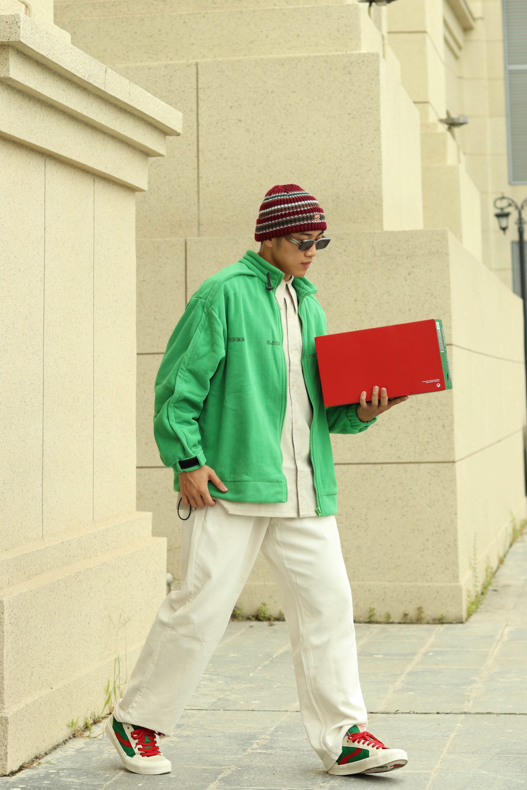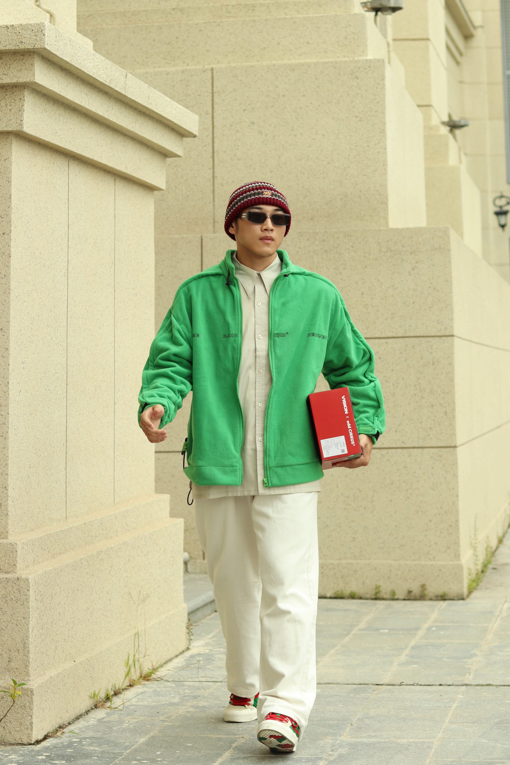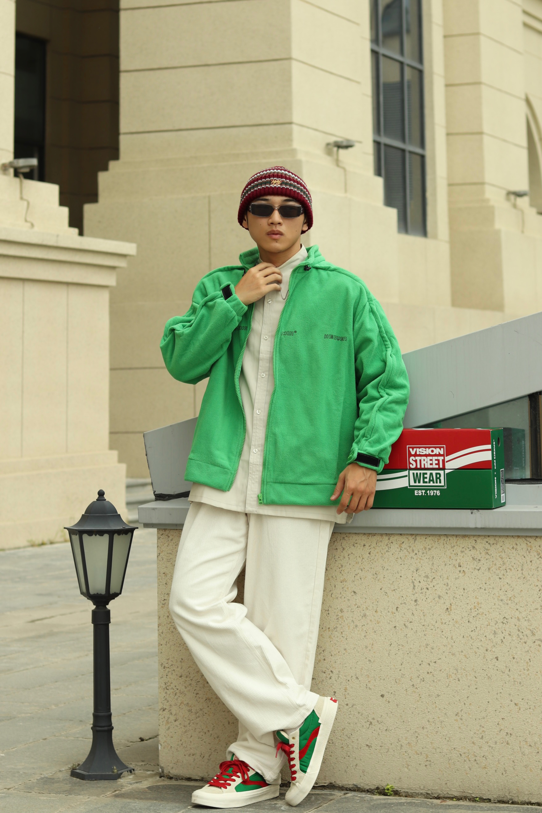 halo大家 这里是不会唱歌的章鱼章鱼哥 今天收到了 vision street wear 和odd 的圣诞联名款滑板鞋 马上来给大家搭配一身穿搭 上身内搭一件灰色衬衫 外穿一件绿色摇粒绒夹克 裤子选择一条米白色灯芯绒长裤 鞋子则搭配红绿撞色滑板鞋 最后来一顶条纹针织帽 穿搭小tips 红绿配色撞色 用米色过渡 内长外短的叠穿增加层次