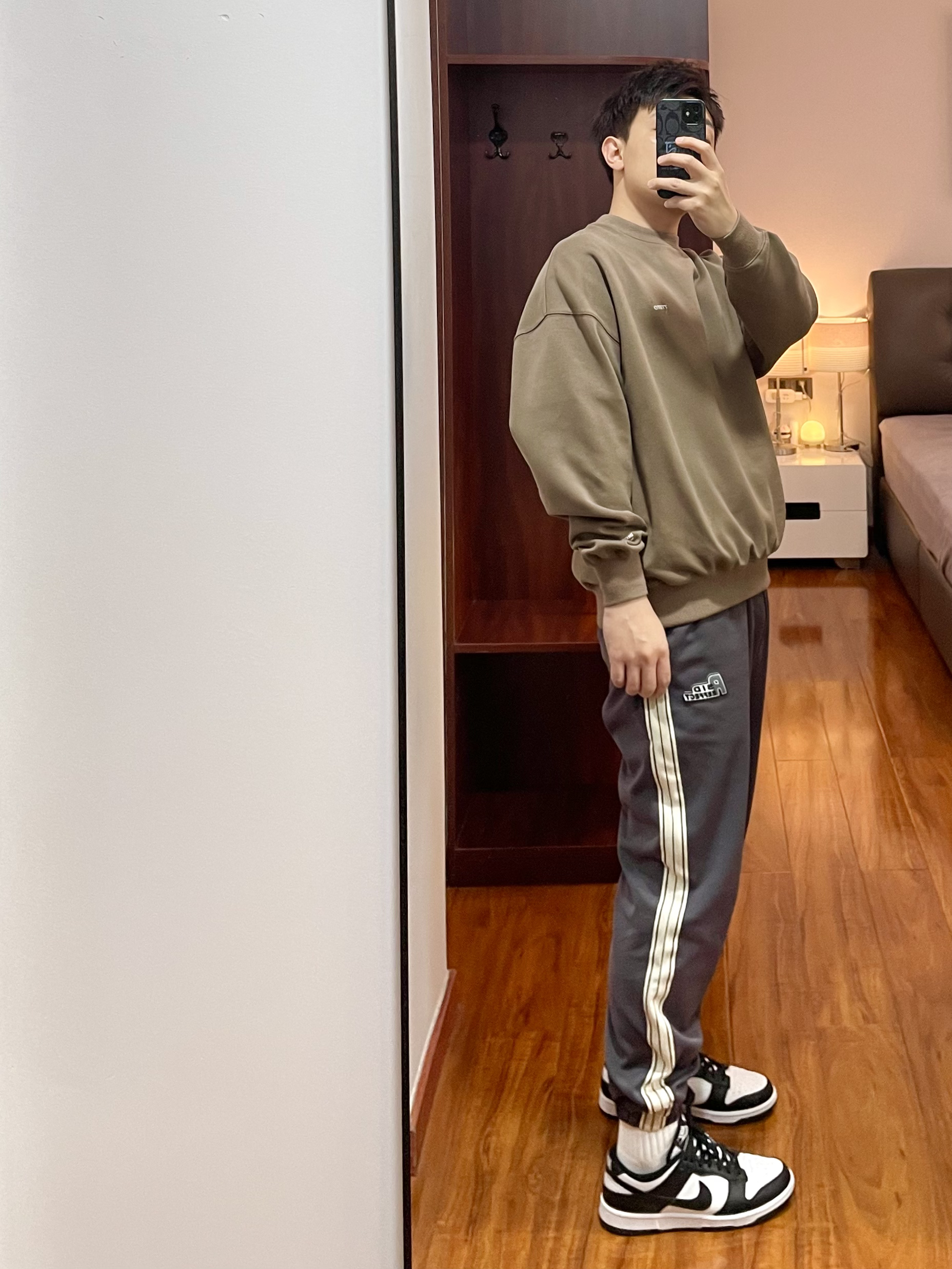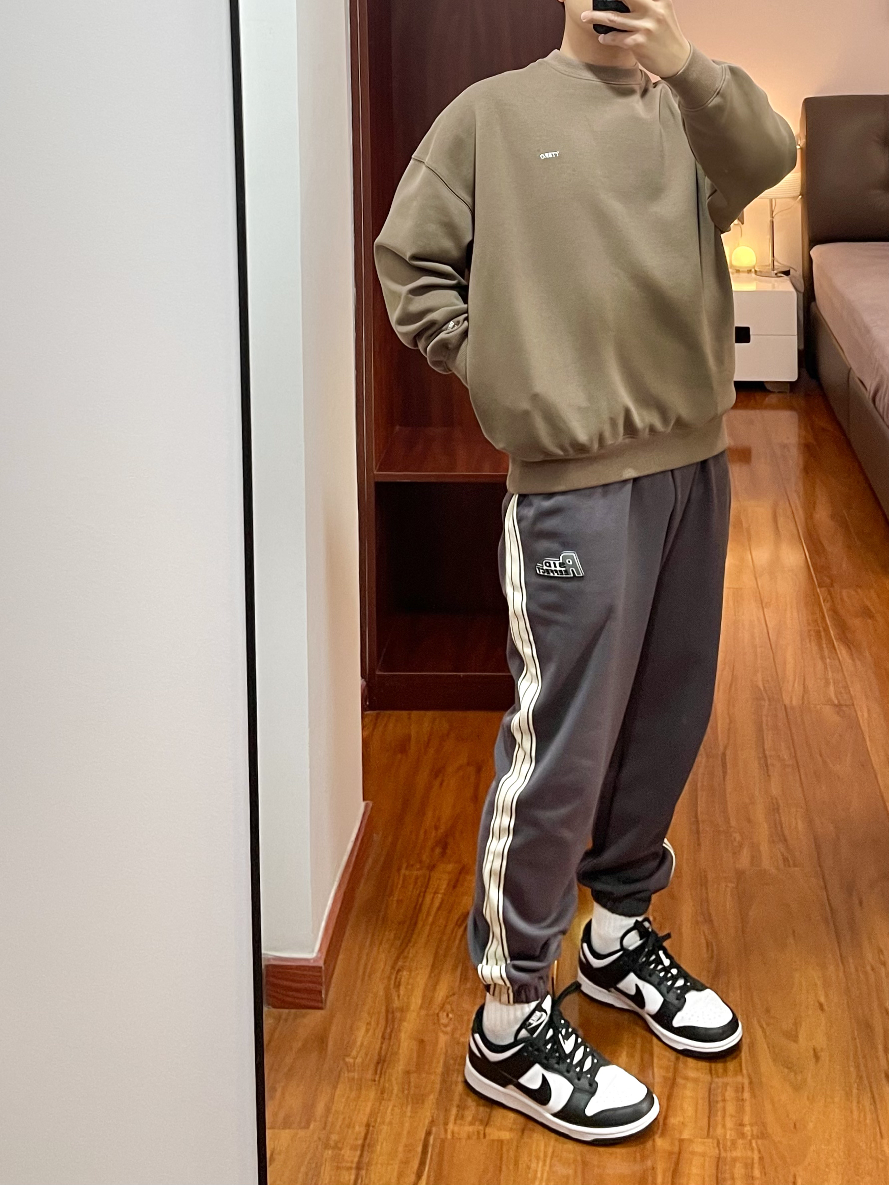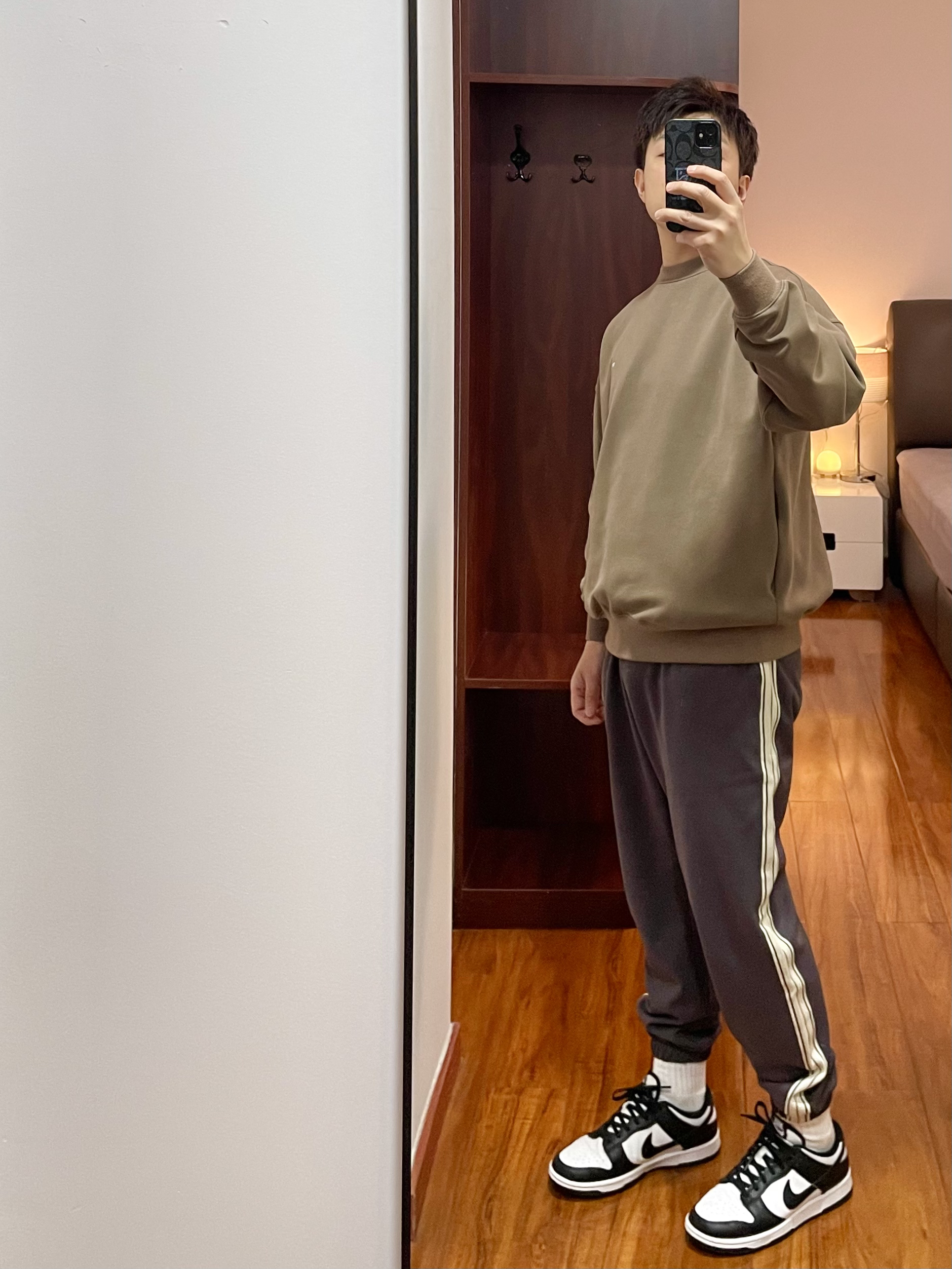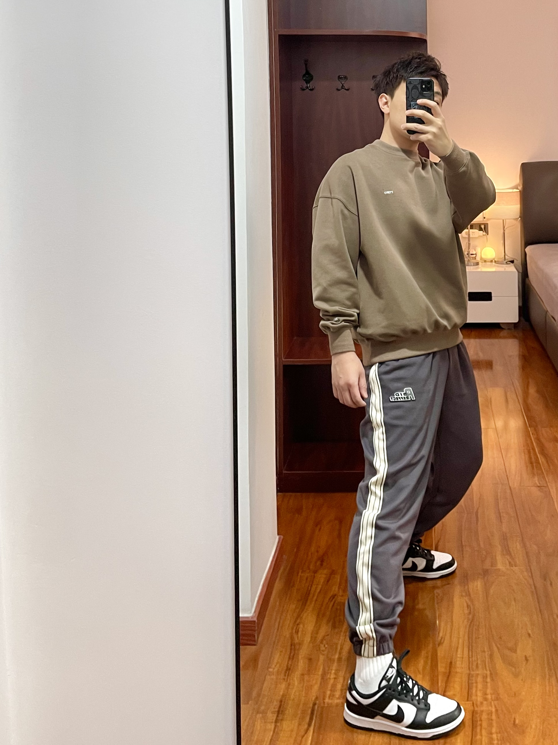 170/135斤 一个普通人的穿搭分享 👔:圆领卫衣 S码 棕色休闲的圆领卫衣,面料厚实领口不易变形,版型宽松袖口位与下摆位的收紧恰到好处紧而不勒。 👖:SIDEEFFECT SID-LK2006 L码 深灰色束脚休闲裤,面料柔软舒服,版型宽松,裤脚口松紧刚好随便一提一拉都有造型感,搭配运动鞋休闲鞋都好看。 👟:Nike dunk 41码 熊猫配色百搭,脚感适中不硬不软,dunk搭配各种裤...