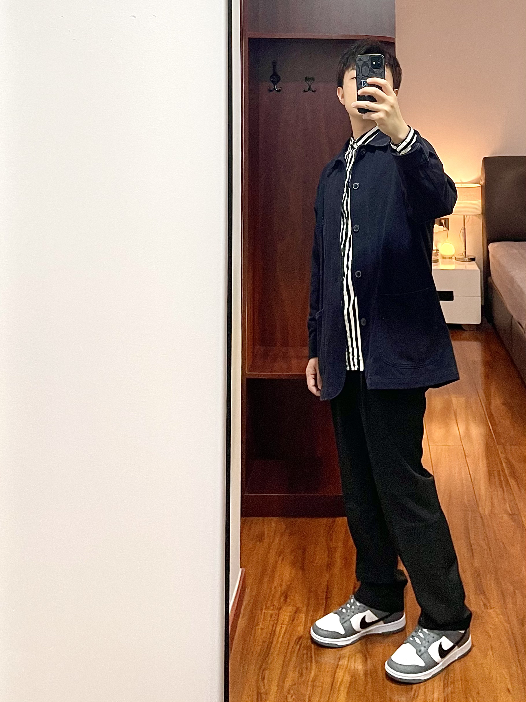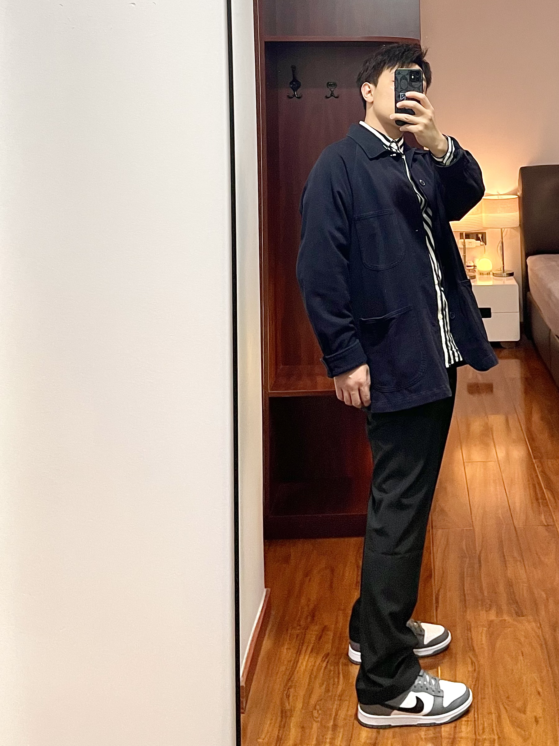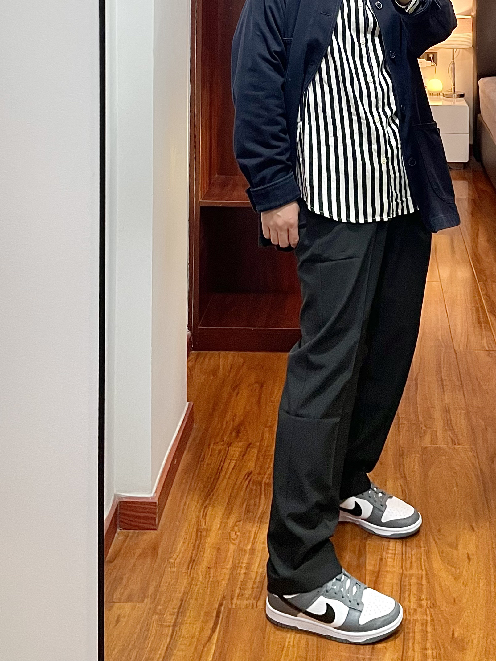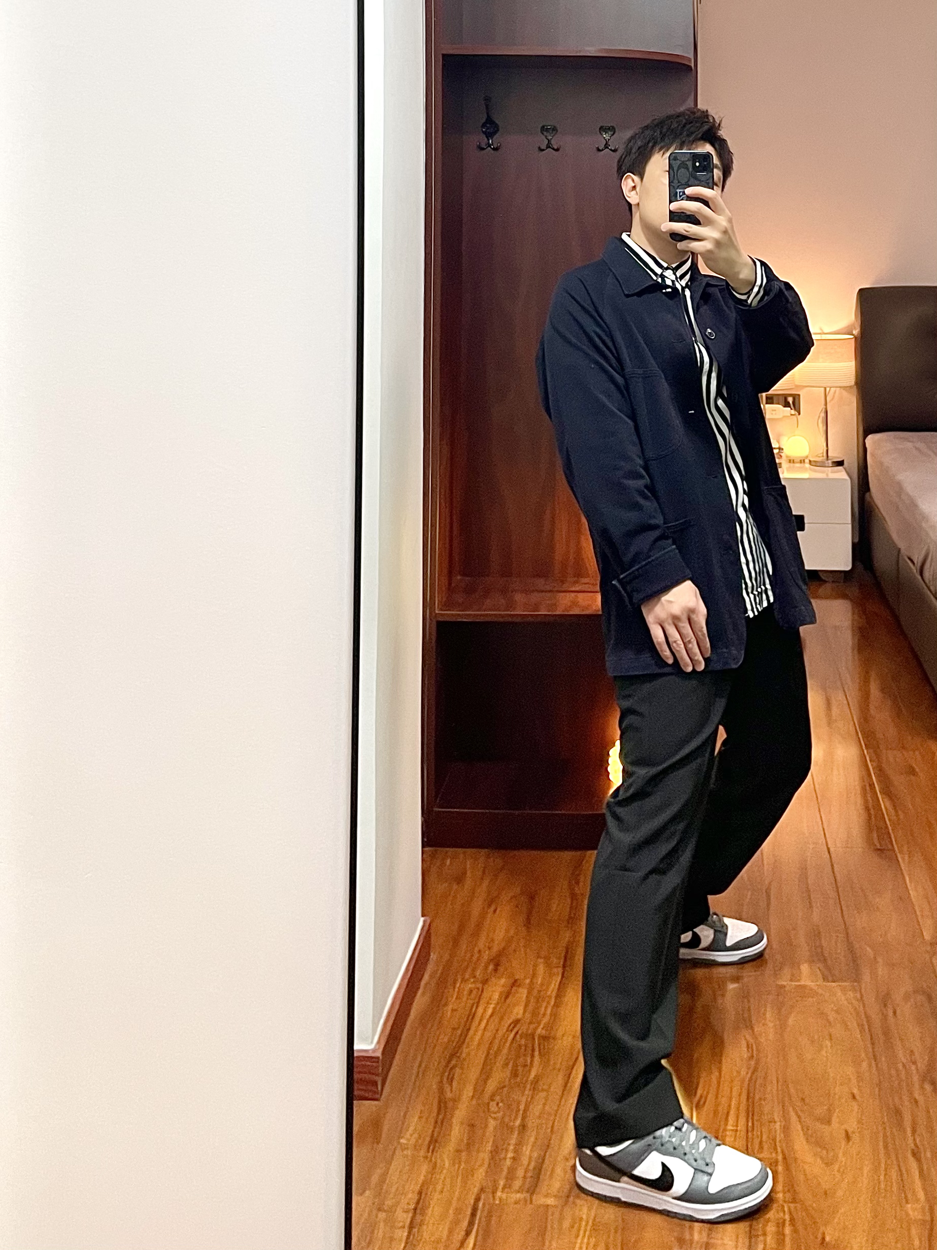 170/135斤 一个普通人的穿搭分享 👔:优衣库 夹克L /Zara 衬衫M 夹克配衬衫上班穿正经也休闲,夹克比较厚度适合在春季外穿内搭一件衬衣即可。 👖:CRUSH KEY 休闲西裤 L 版型直筒面料舒适,搭配衣服衬衫休闲装都可以,配休闲鞋板鞋休闲穿搭很好看。 👟:Nike Dunk 黑白灰 41 百搭鞋款,黑白灰的颜色休闲简约好搭。