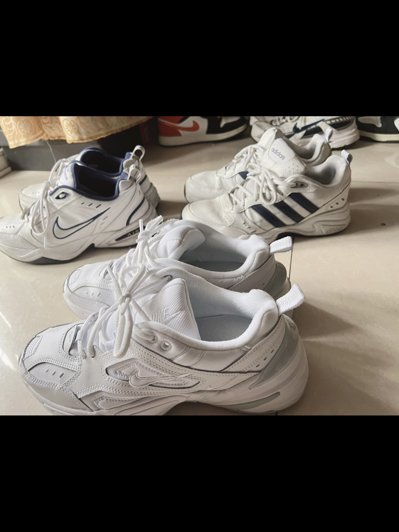 Nike Air Monarch White 4 Navy Nike M2K Tekno White Adidas Neo Strutter白蓝 今日介绍自穿平价自穿好鞋: 无可厚非的平价小白鞋三巨头, 稳居三百档平价好穿鞋款 三款都有增高效果,健身日常穿搭都🉑️ 脚感舒适是他们的缺点,皮质感爆表是他们的败笔 平价百元是他们无法抛弃的优点 小白鞋的外形却能衬托各种穿搭, 为穿搭烦恼的小伙伴们...