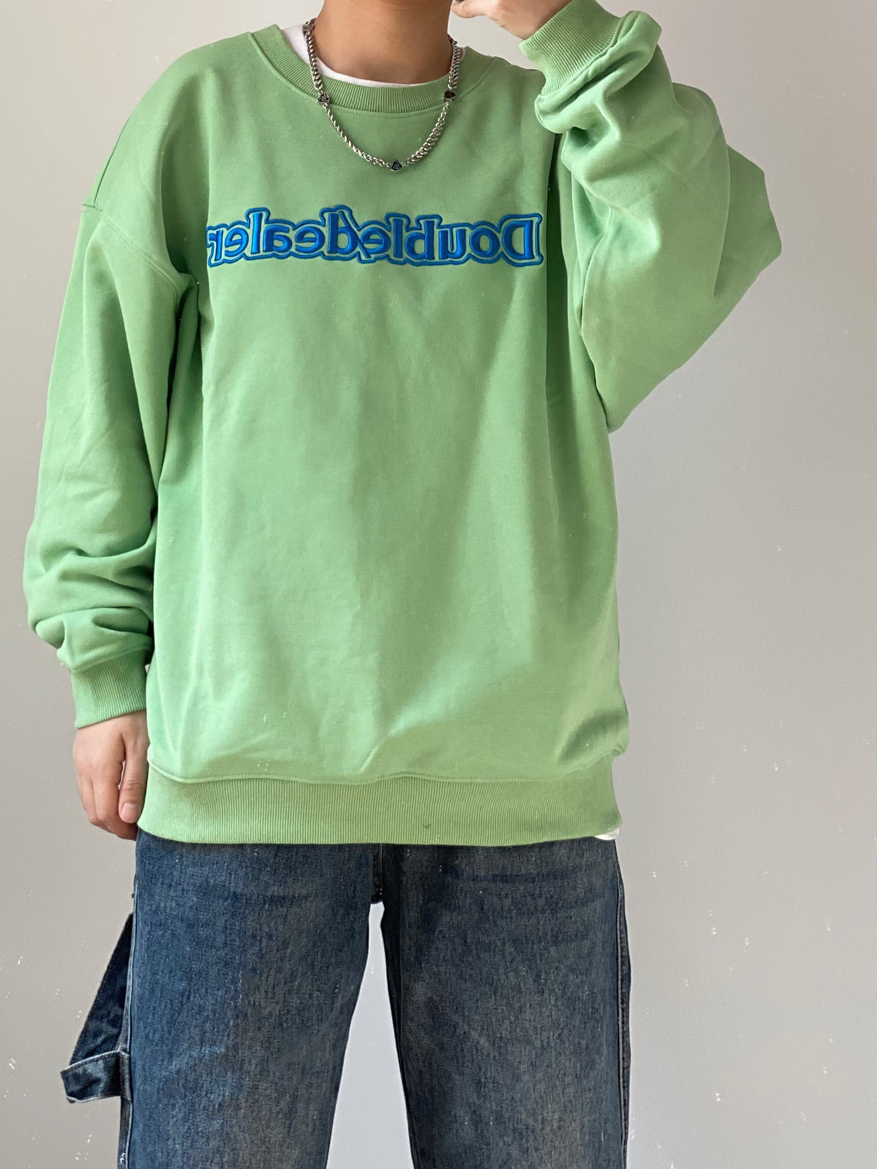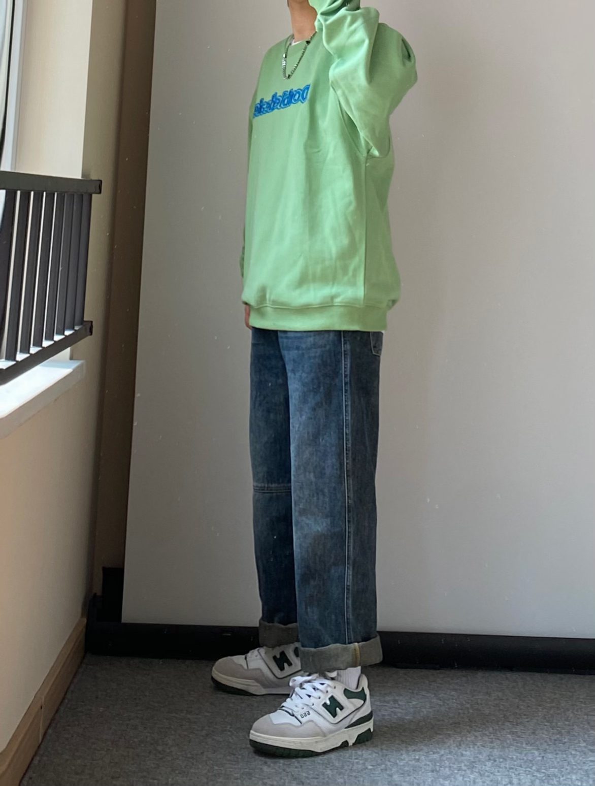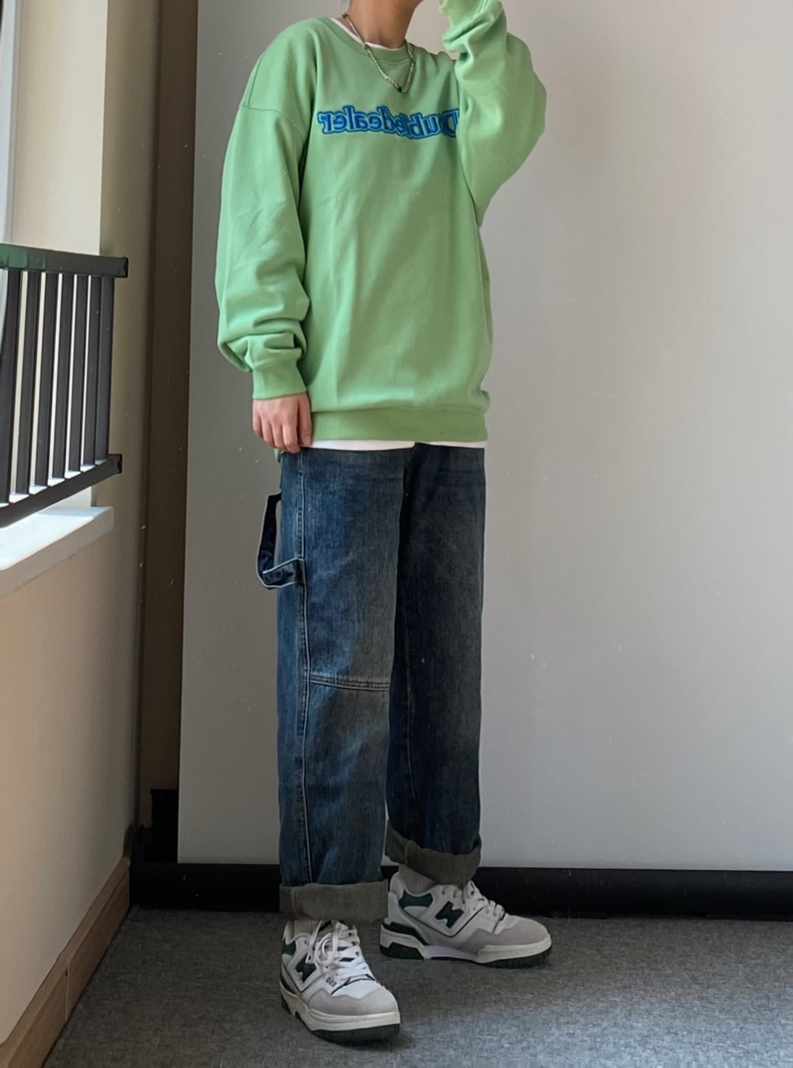 春天卫衣穿起来~ 嫩绿色的圆领卫衣 非常显肤色 内里可以搭配一个白t叠穿 戴一个简约项链增添层次感 可以搭配一条宽松的复古水洗牛仔裤 就可以出街啦~