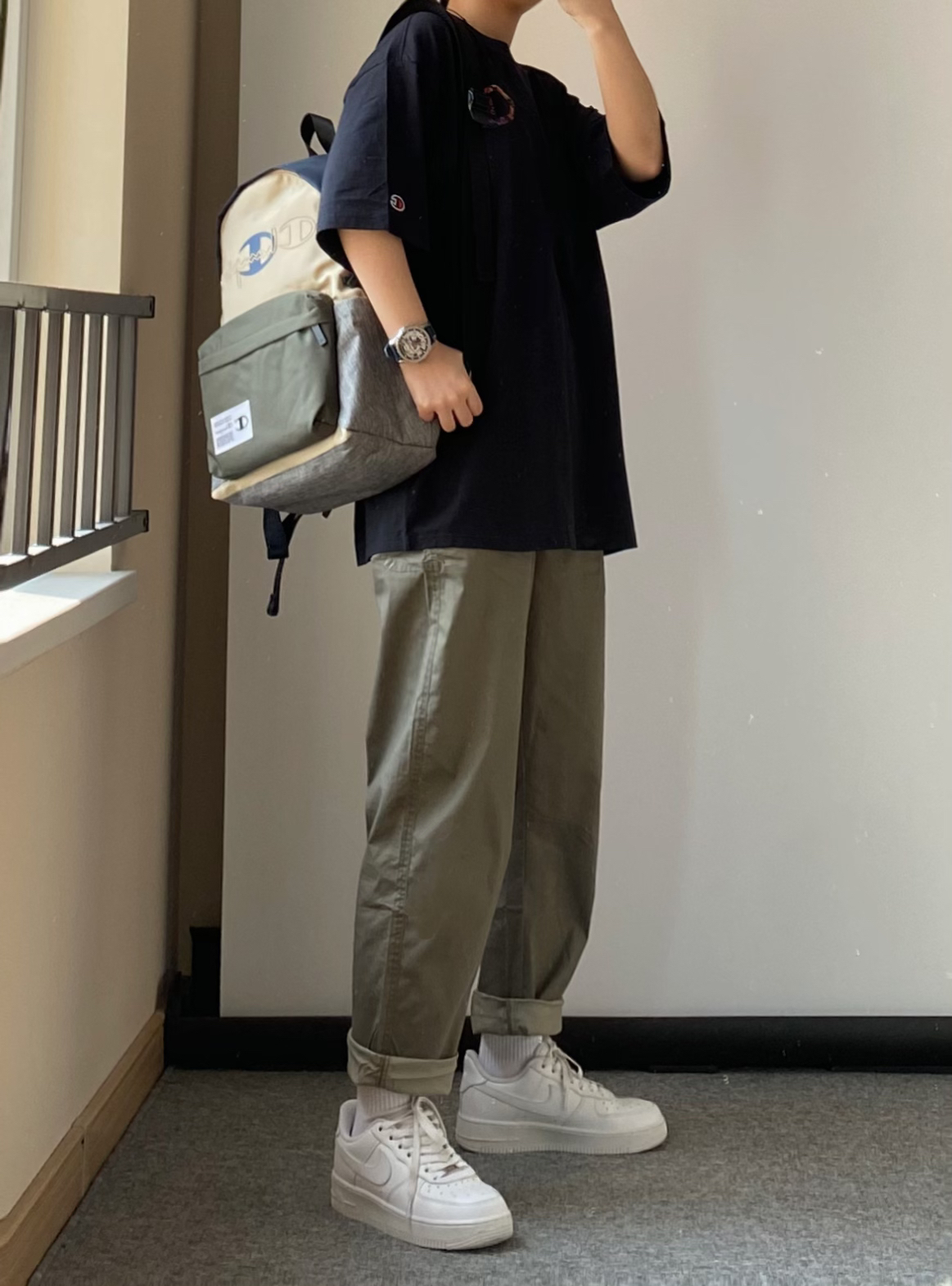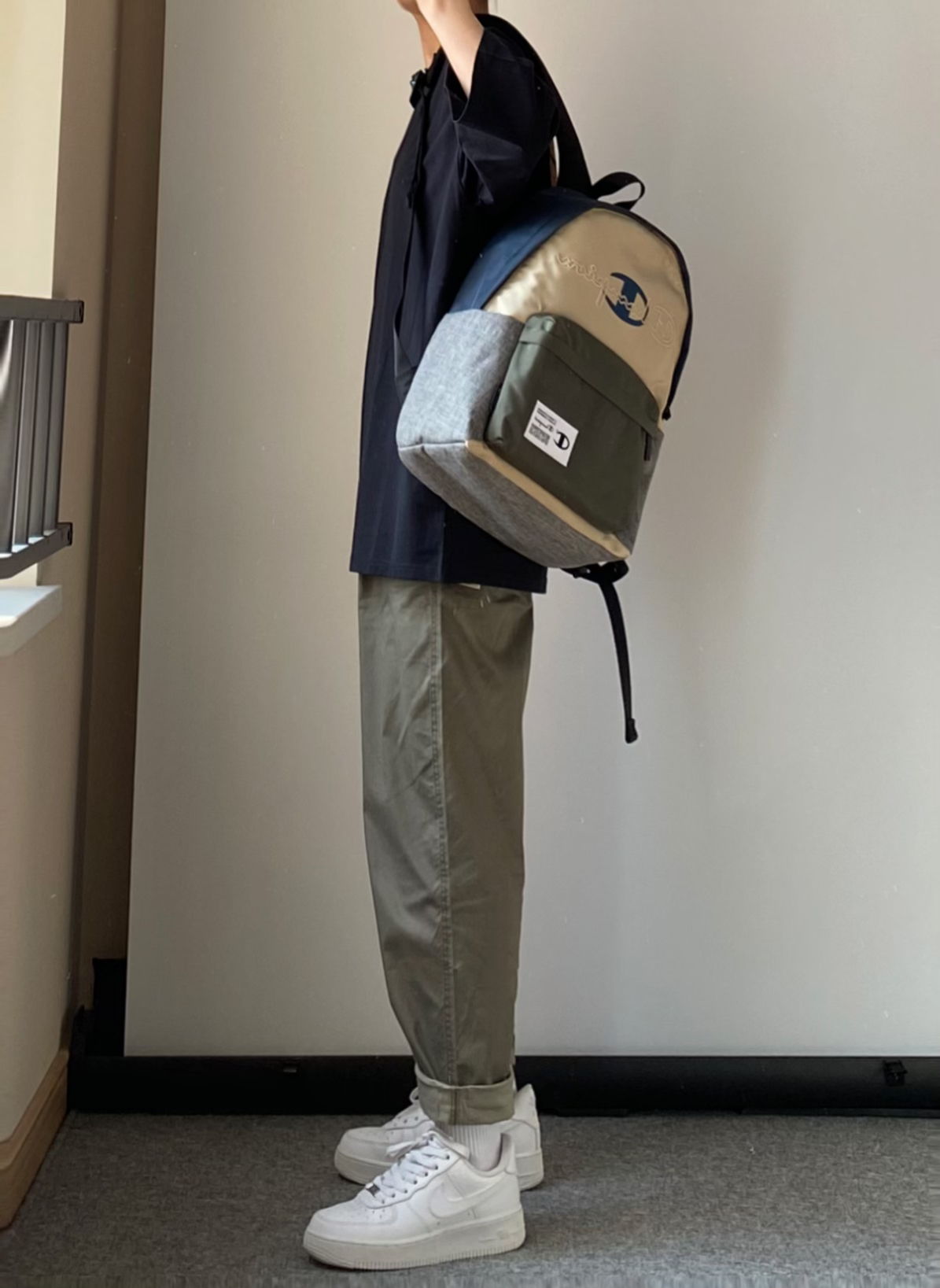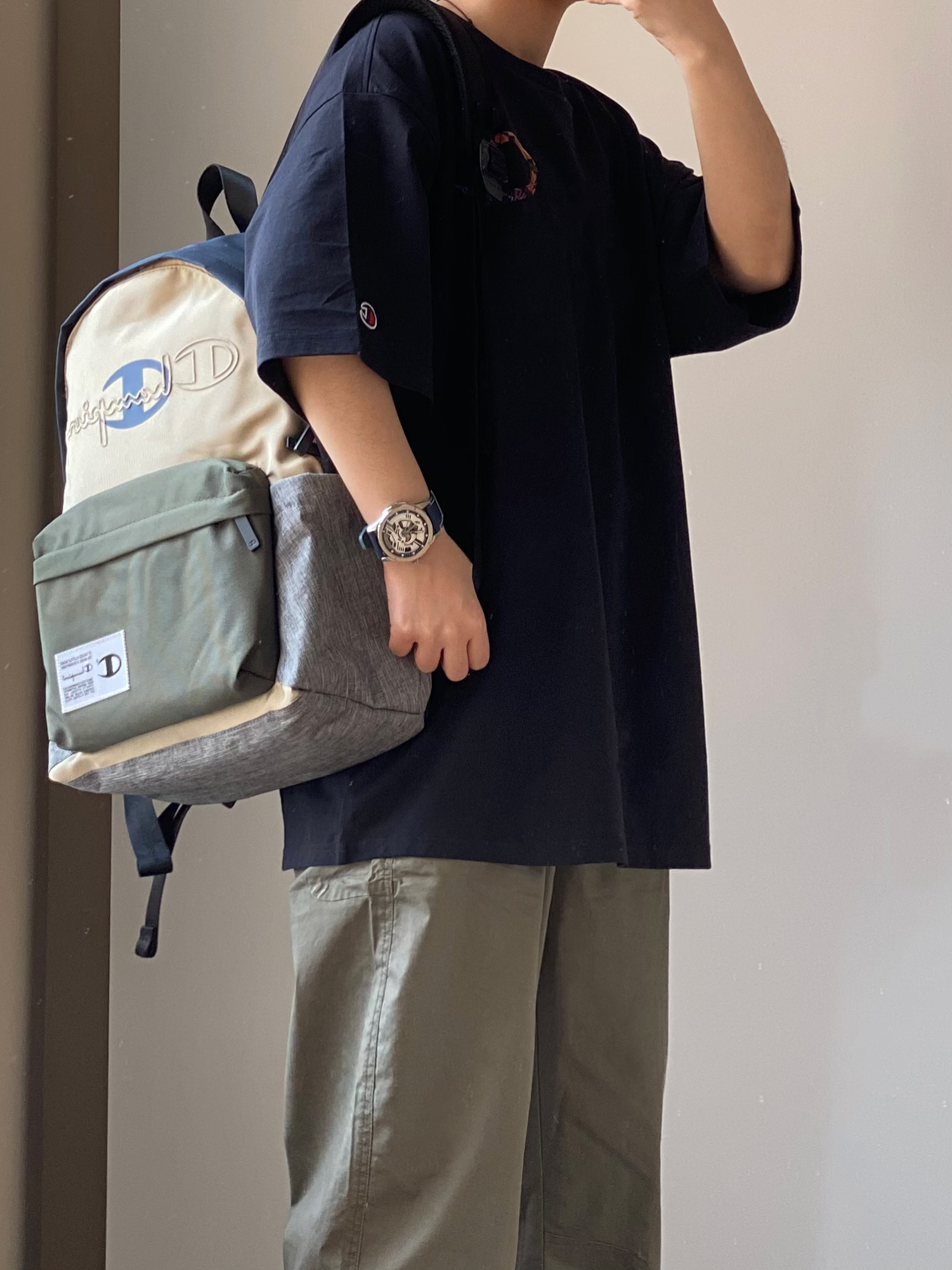 开学了给自己换身新行头 冠军的黑色短袖T恤 背后彩色大印花超级帅 搭配白告studio的灰色小脚休闲裤 面料好薄春夏穿超级舒适 今天背的Champion的撞色双肩包 小麦色+橄榄绿+藏青色撞色拼接 大容量很适合学生党日常背 搭配的welly merck x EVA联名款机械表 藏青色的硅胶表带很适合夏天佩戴