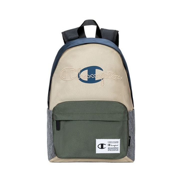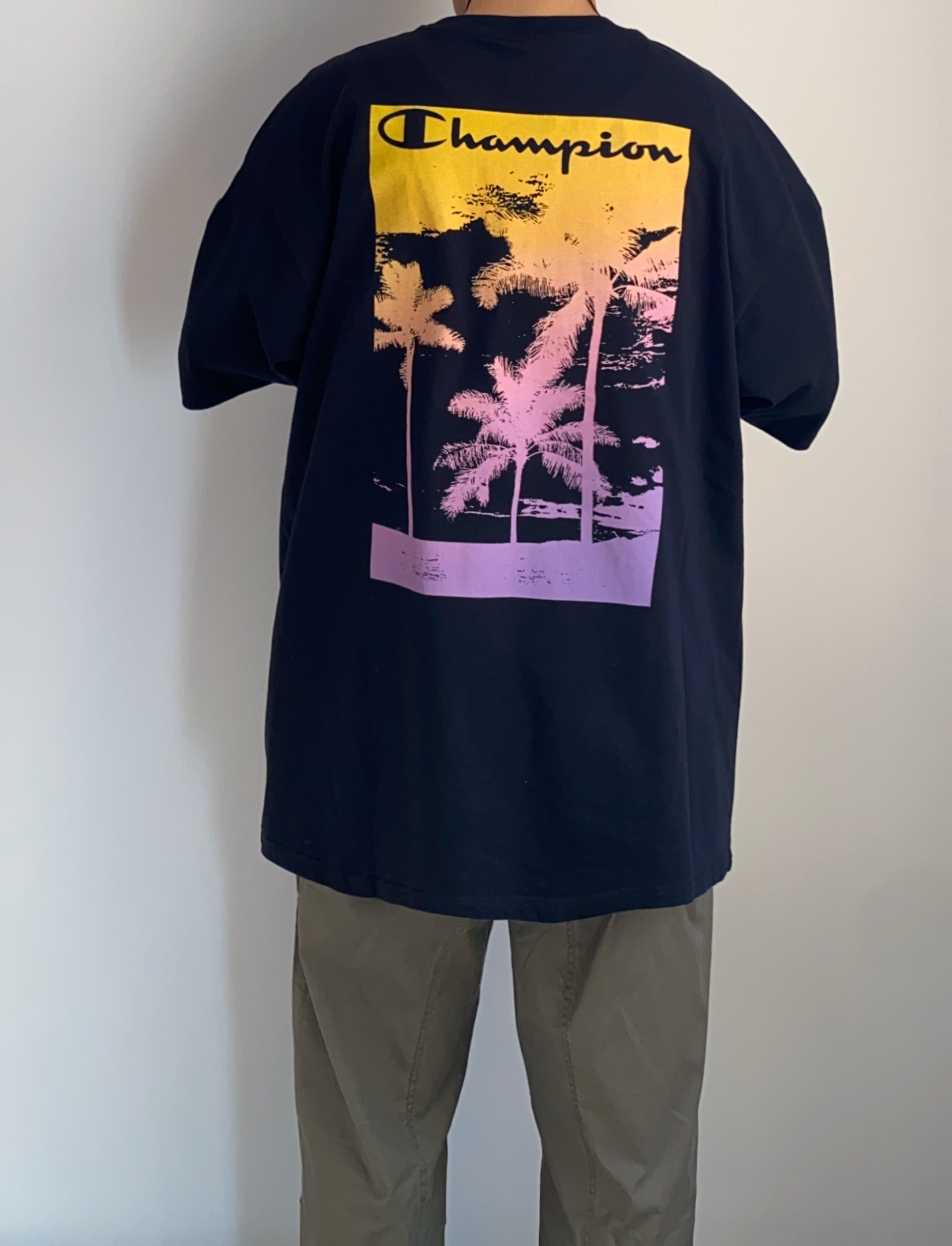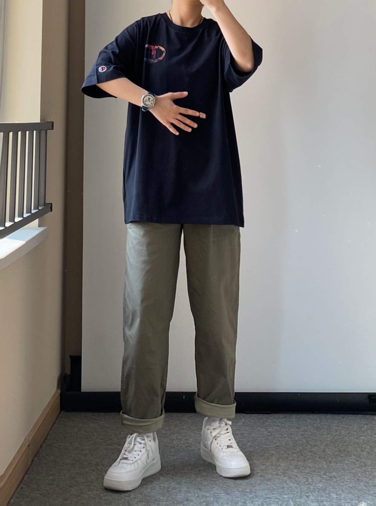 开学了给自己换身新行头 冠军的黑色短袖T恤 背后彩色大印花超级帅 搭配白告studio的灰色小脚休闲裤 面料好薄春夏穿超级舒适 今天背的Champion的撞色双肩包 小麦色+橄榄绿+藏青色撞色拼接 大容量很适合学生党日常背 搭配的welly merck x EVA联名款机械表 藏青色的硅胶表带很适合夏天佩戴