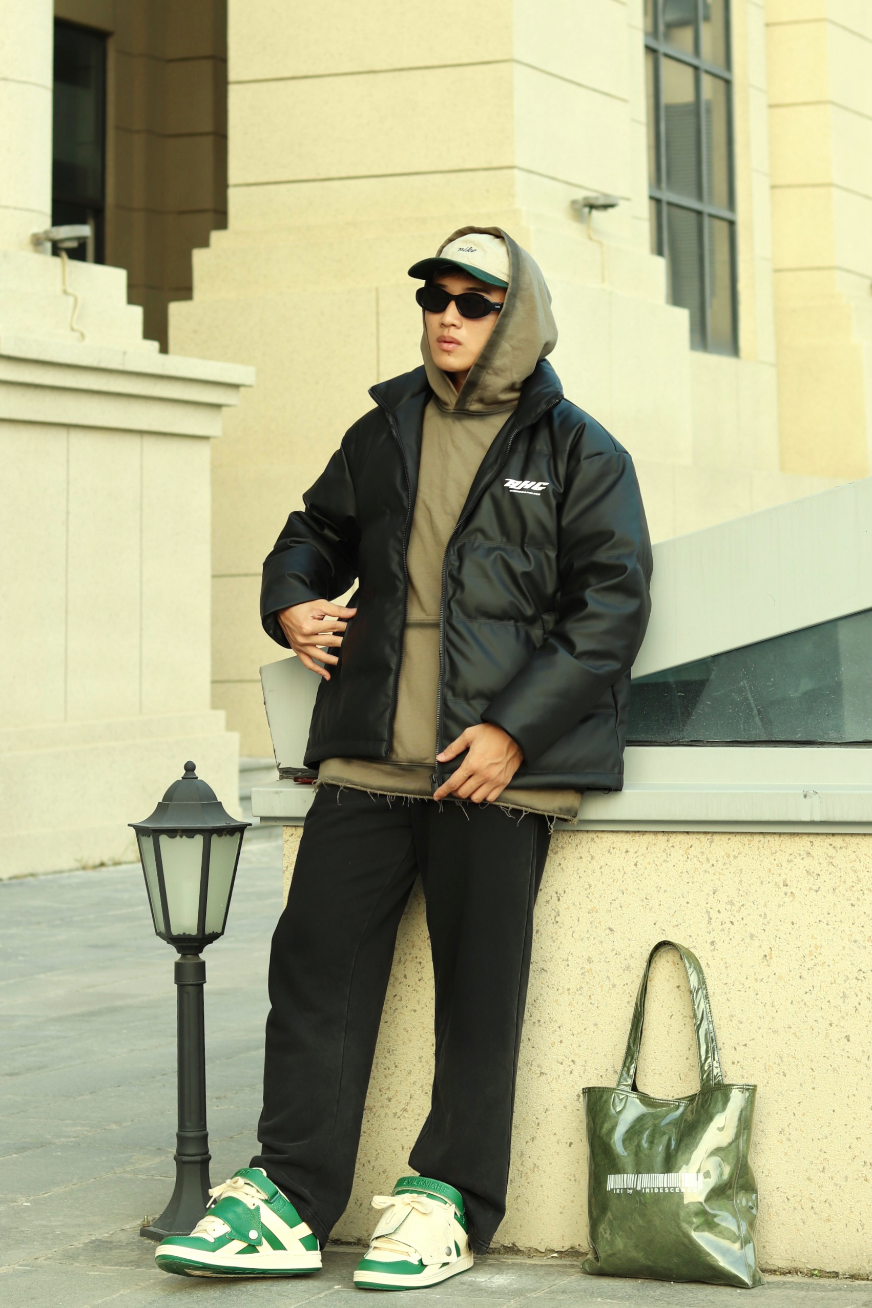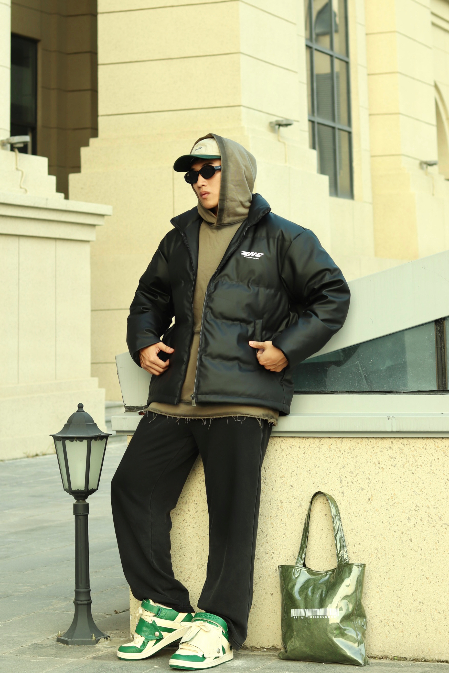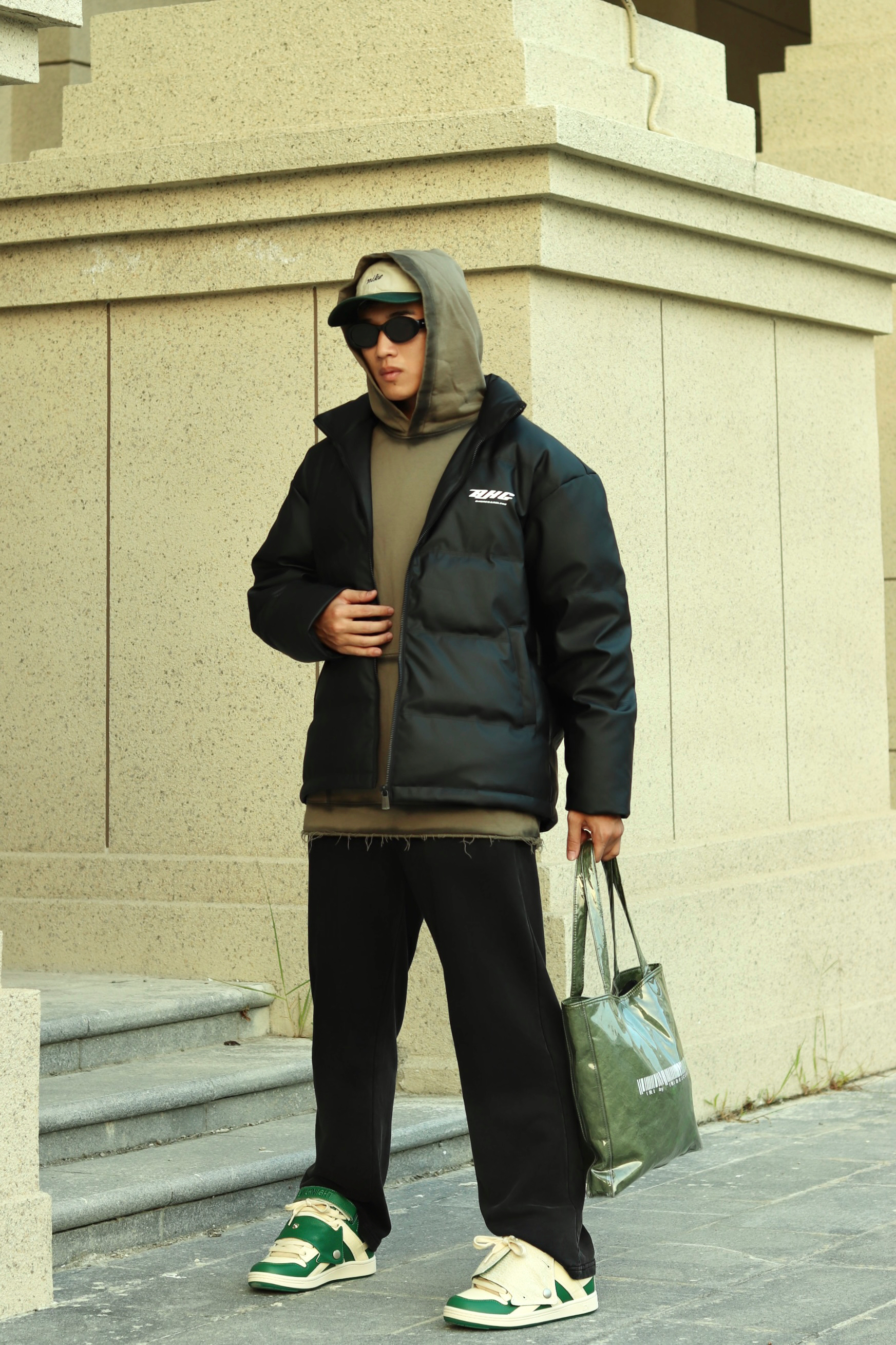 halo大家 这里是不会唱歌的章鱼章鱼哥 今天章鱼给大家分享一套 黑色麂皮棉服的搭配 来看看我的上身吧 内搭一件做旧水洗橄榄绿卫衣 外穿黑色麂皮棉服 裤子搭配一条做旧水洗卫裤 鞋子一双ek 白绿面包鞋 最后一顶绿色拼接鸭舌帽 和一个绿色托特包 完成一整套穿搭 穿搭小tips 整体以黑绿配色为主 用帽子包包去呼应鞋子配色 黑色作为基础色也是百搭的