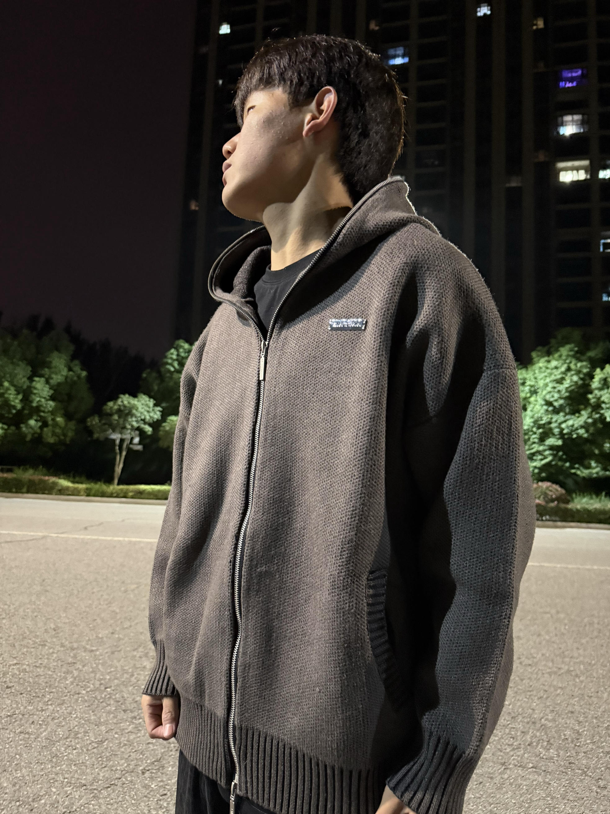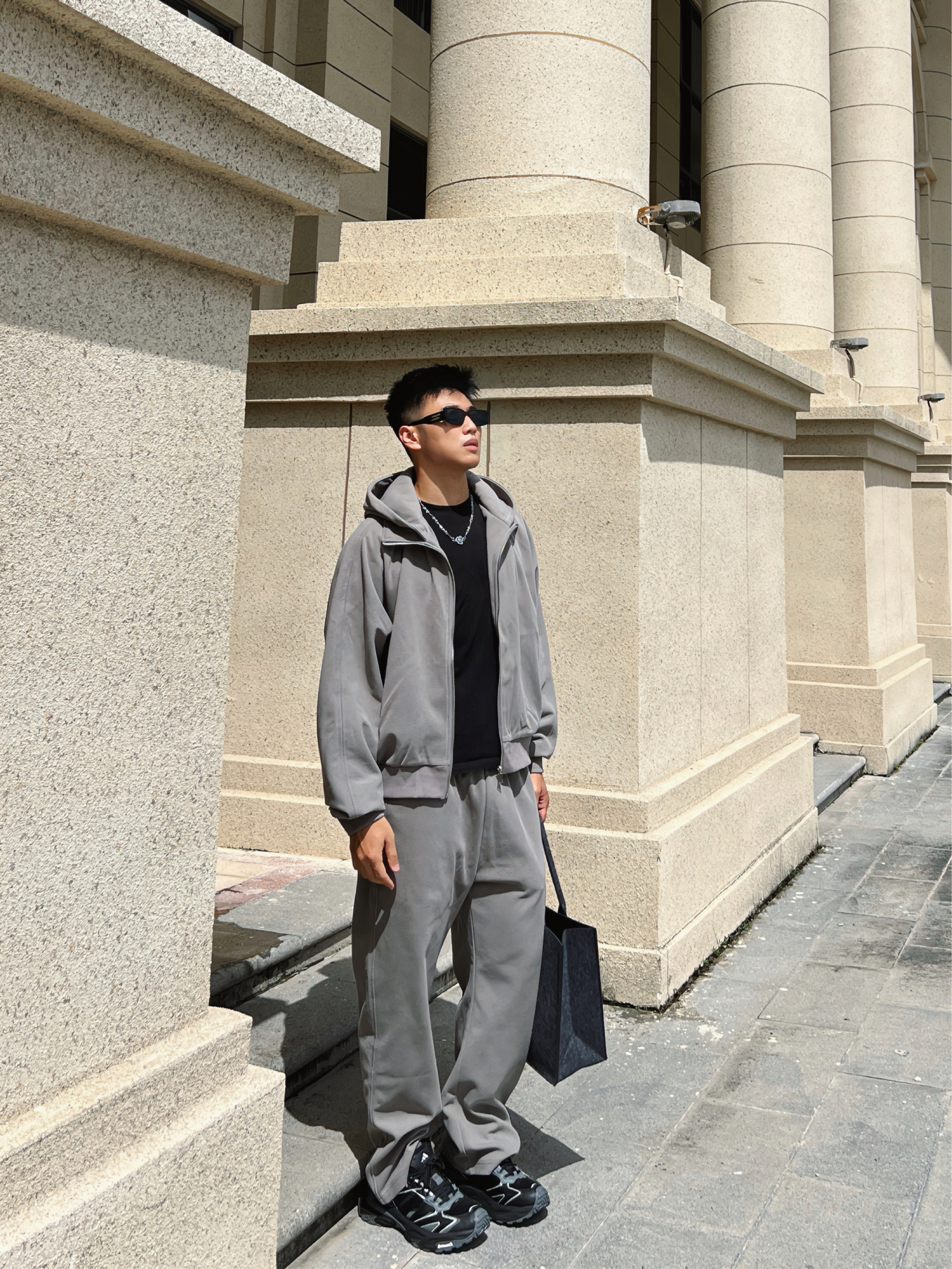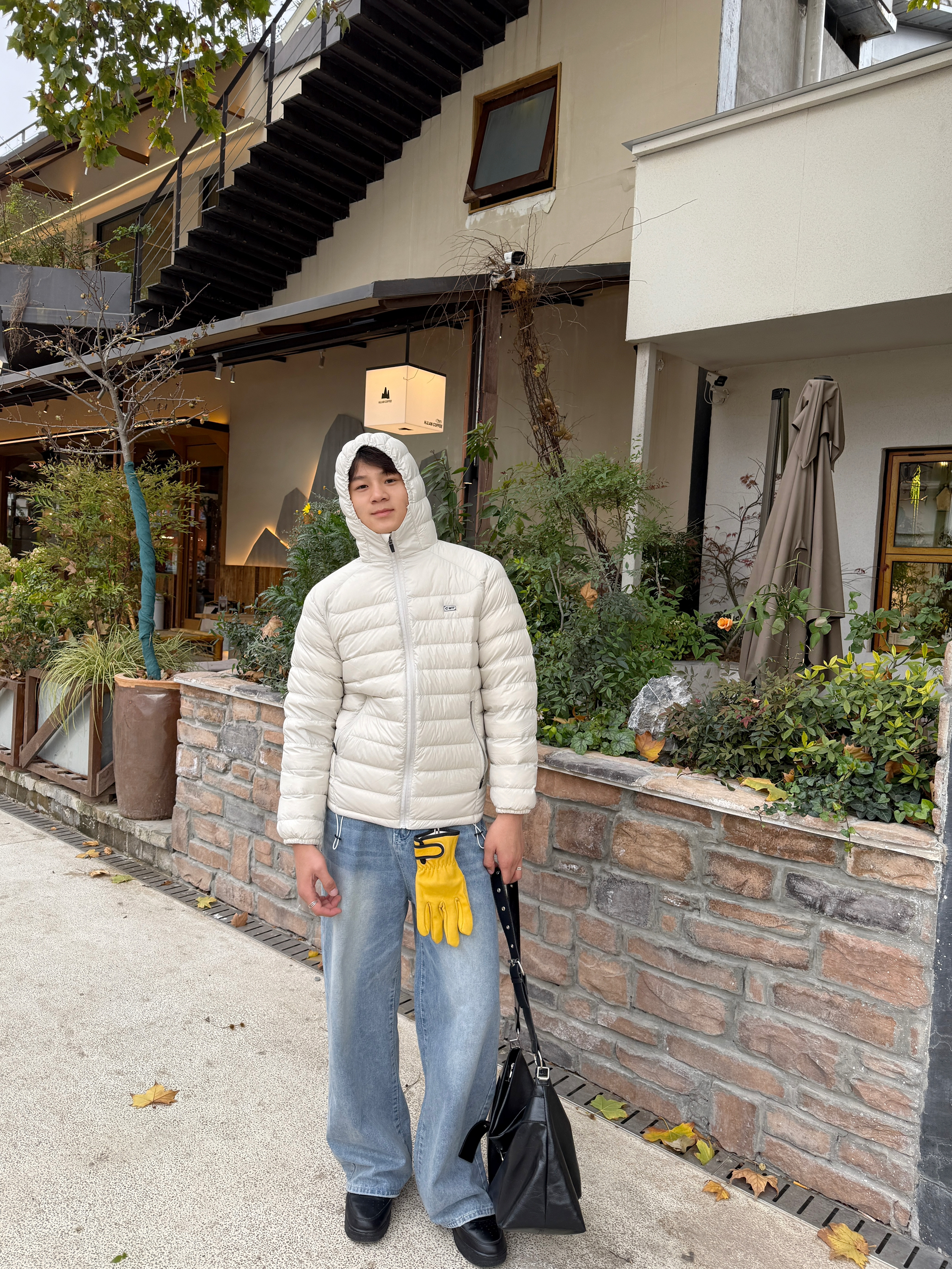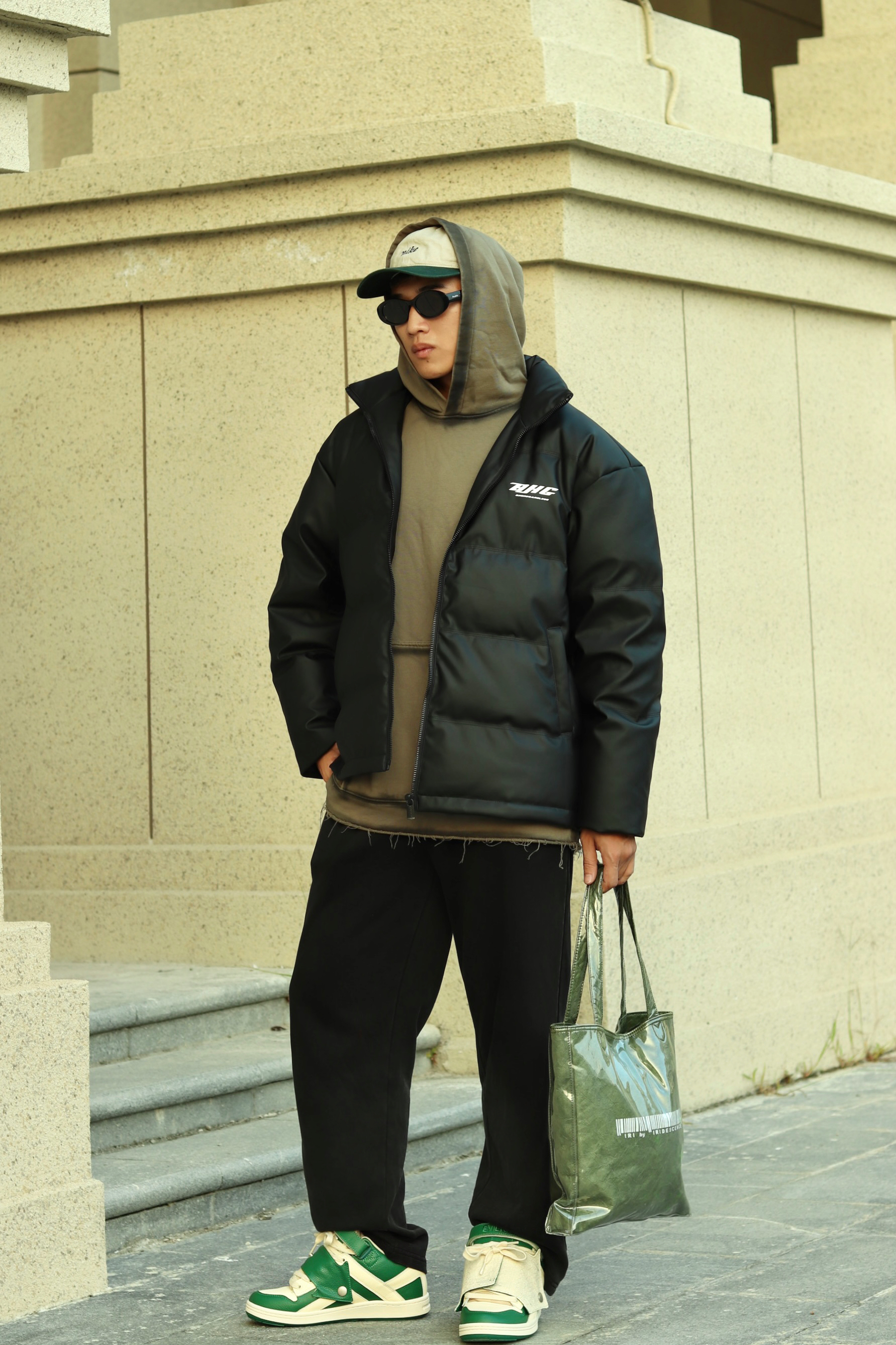 halo大家 这里是不会唱歌的章鱼章鱼哥 今天章鱼给大家分享一套 黑色麂皮棉服的搭配 来看看我的上身吧 内搭一件做旧水洗橄榄绿卫衣 外穿黑色麂皮棉服 裤子搭配一条做旧水洗卫裤 鞋子一双ek 白绿面包鞋 最后一顶绿色拼接鸭舌帽 和一个绿色托特包 完成一整套穿搭 穿搭小tips 整体以黑绿配色为主 用帽子包包去呼应鞋子配色 黑色作为基础色也是百搭的