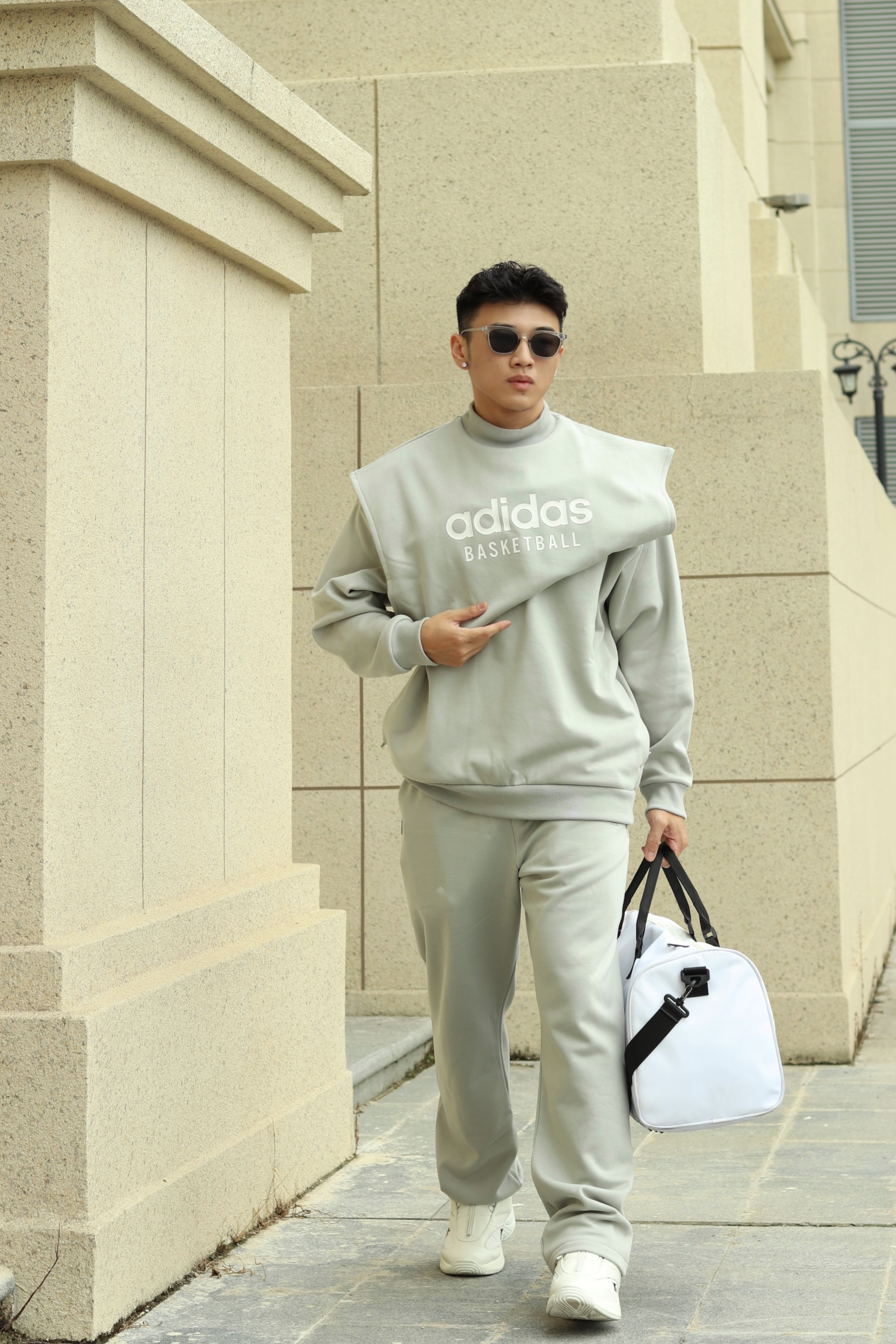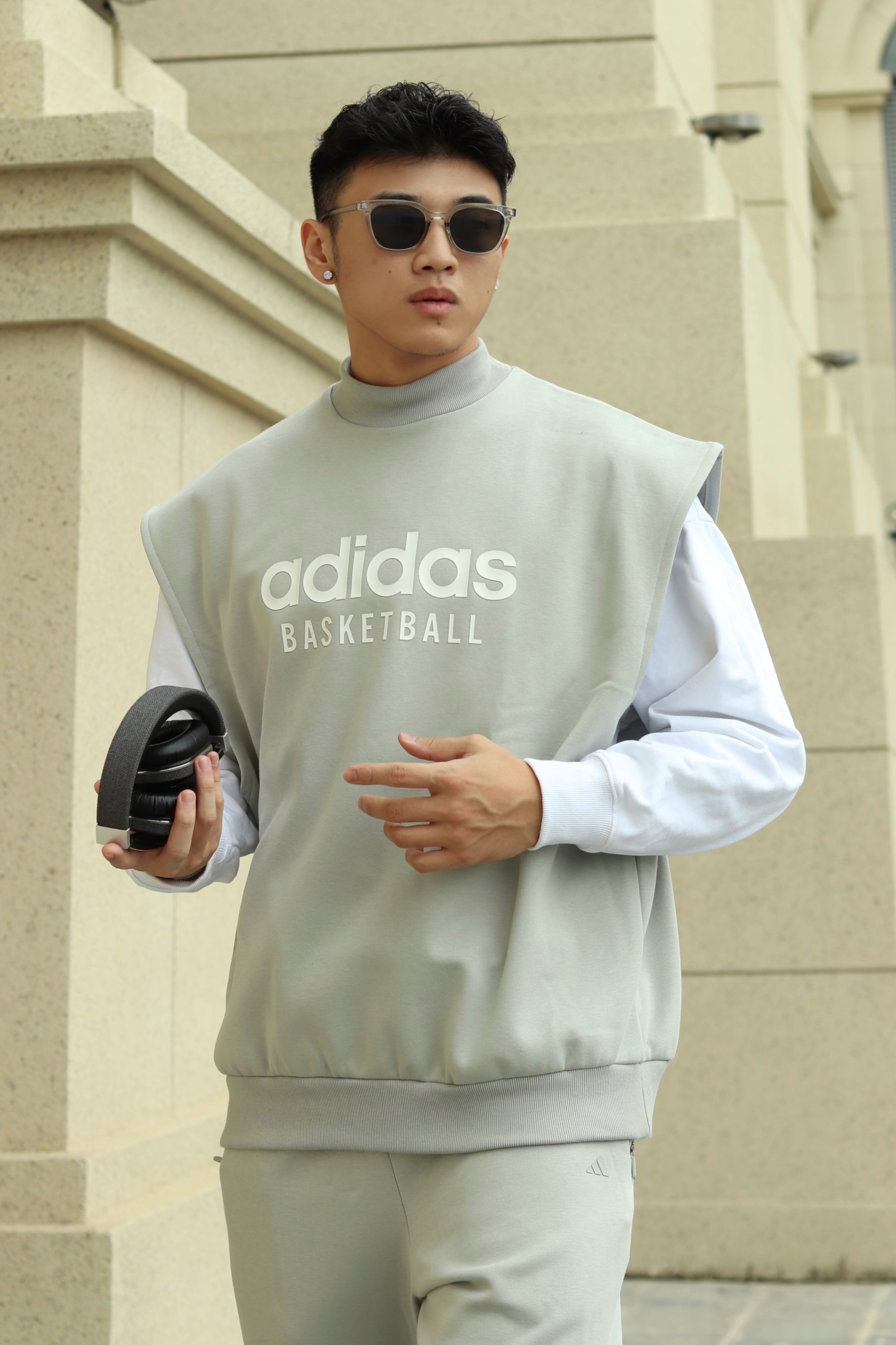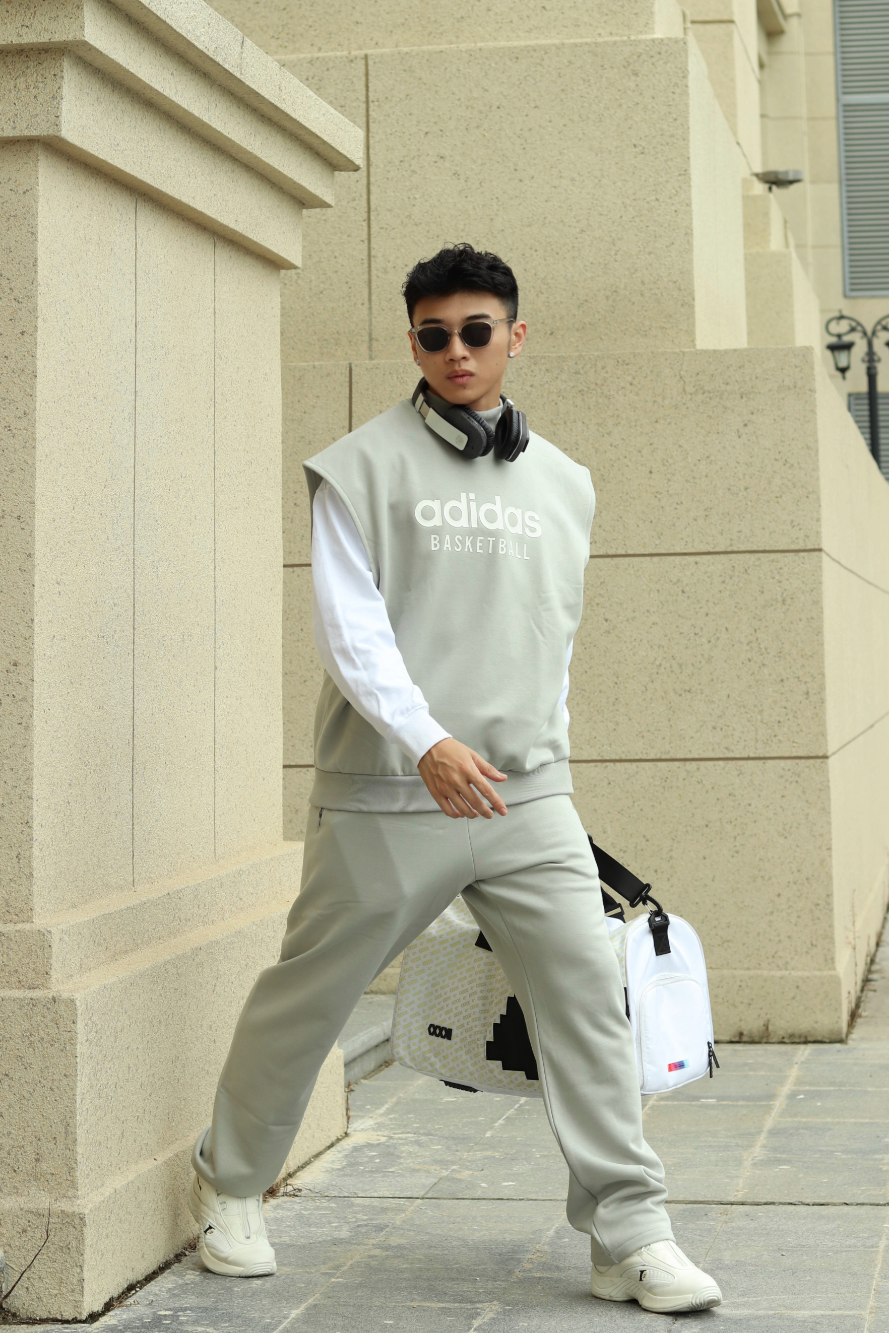 halo大家 这里是不会唱歌的章鱼章鱼哥 今天给大家分享一套 运动风穿搭 来看看我的搭配 上身一件灰色basketball卫衣 搭配白色解构棉服马甲 训练就换成灰色坎肩马甲 裤子一条灰色卫裤 搭配一双reebok的answer 最后一个运动耳机和换洗包包 穿搭小tips 整体以灰色系为主 上下同色拉长视觉比例 用白色小点缀增加层次