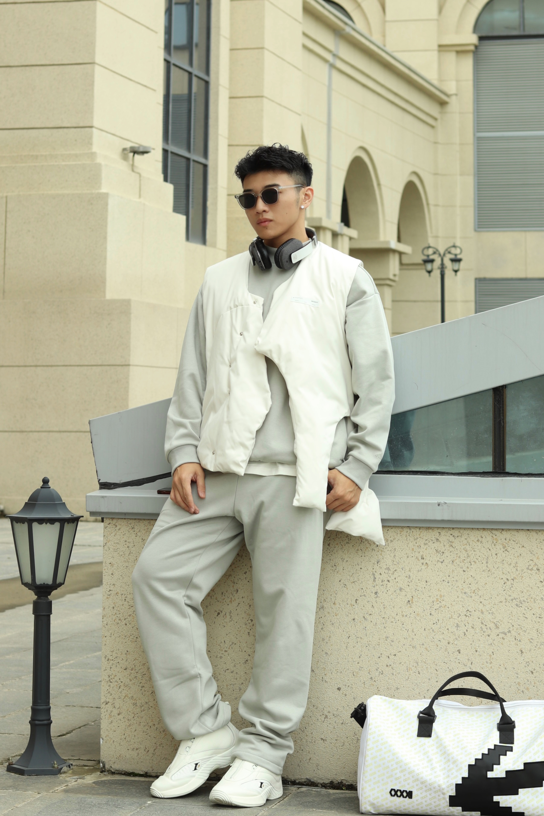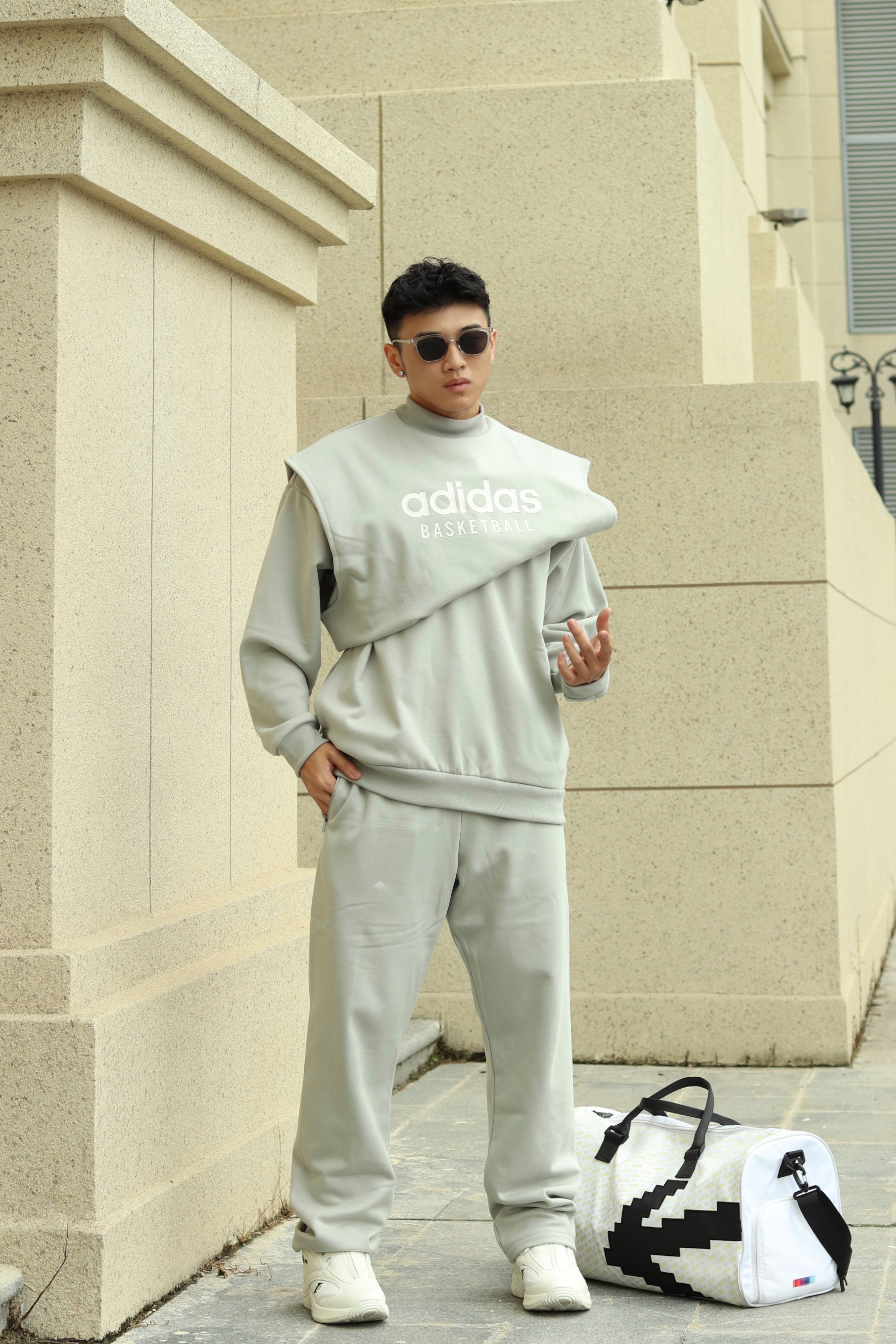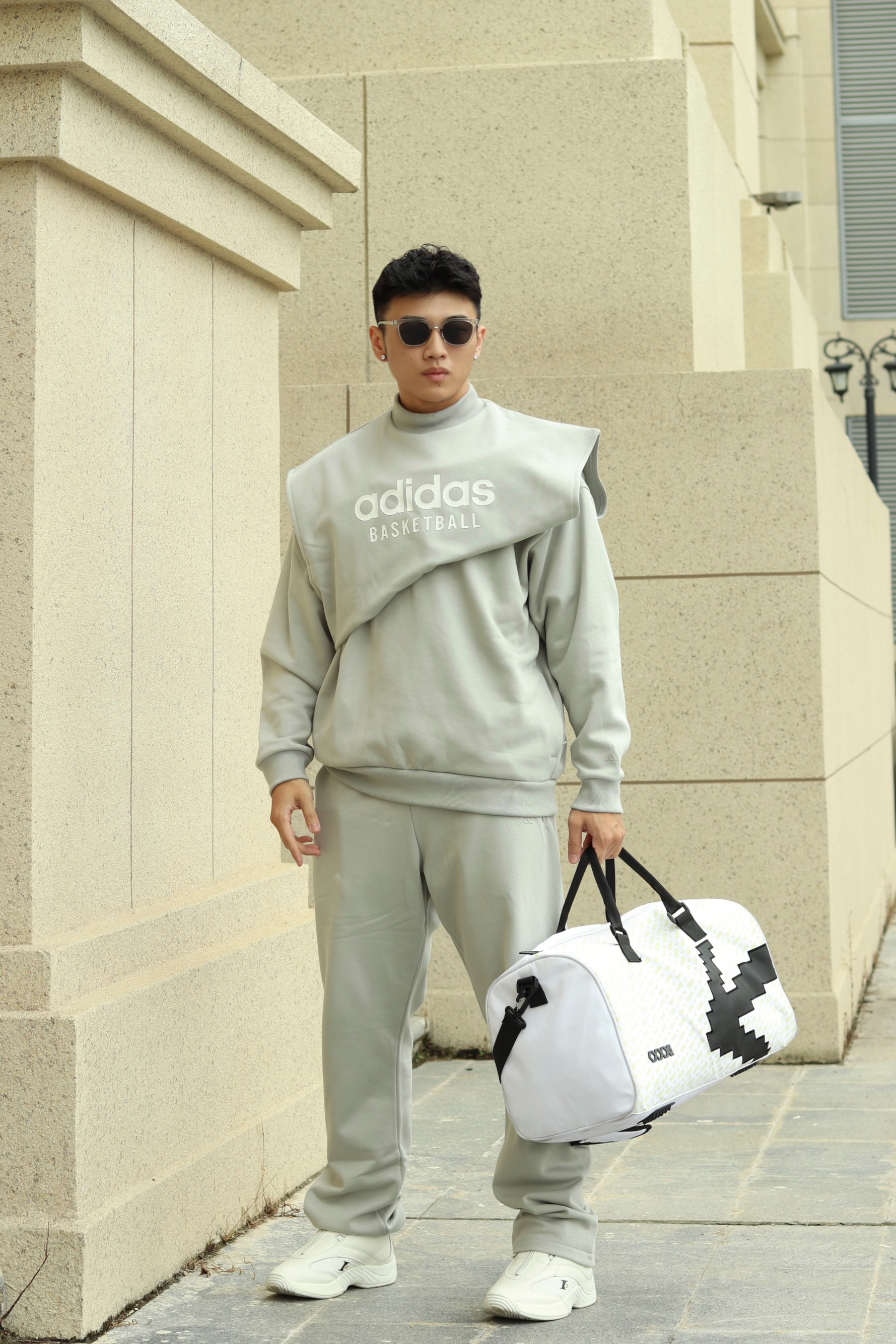 halo大家 这里是不会唱歌的章鱼章鱼哥 今天给大家分享一套 运动风穿搭 来看看我的搭配 上身一件灰色basketball卫衣 搭配白色解构棉服马甲 训练就换成灰色坎肩马甲 裤子一条灰色卫裤 搭配一双reebok的answer 最后一个运动耳机和换洗包包 穿搭小tips 整体以灰色系为主 上下同色拉长视觉比例 用白色小点缀增加层次