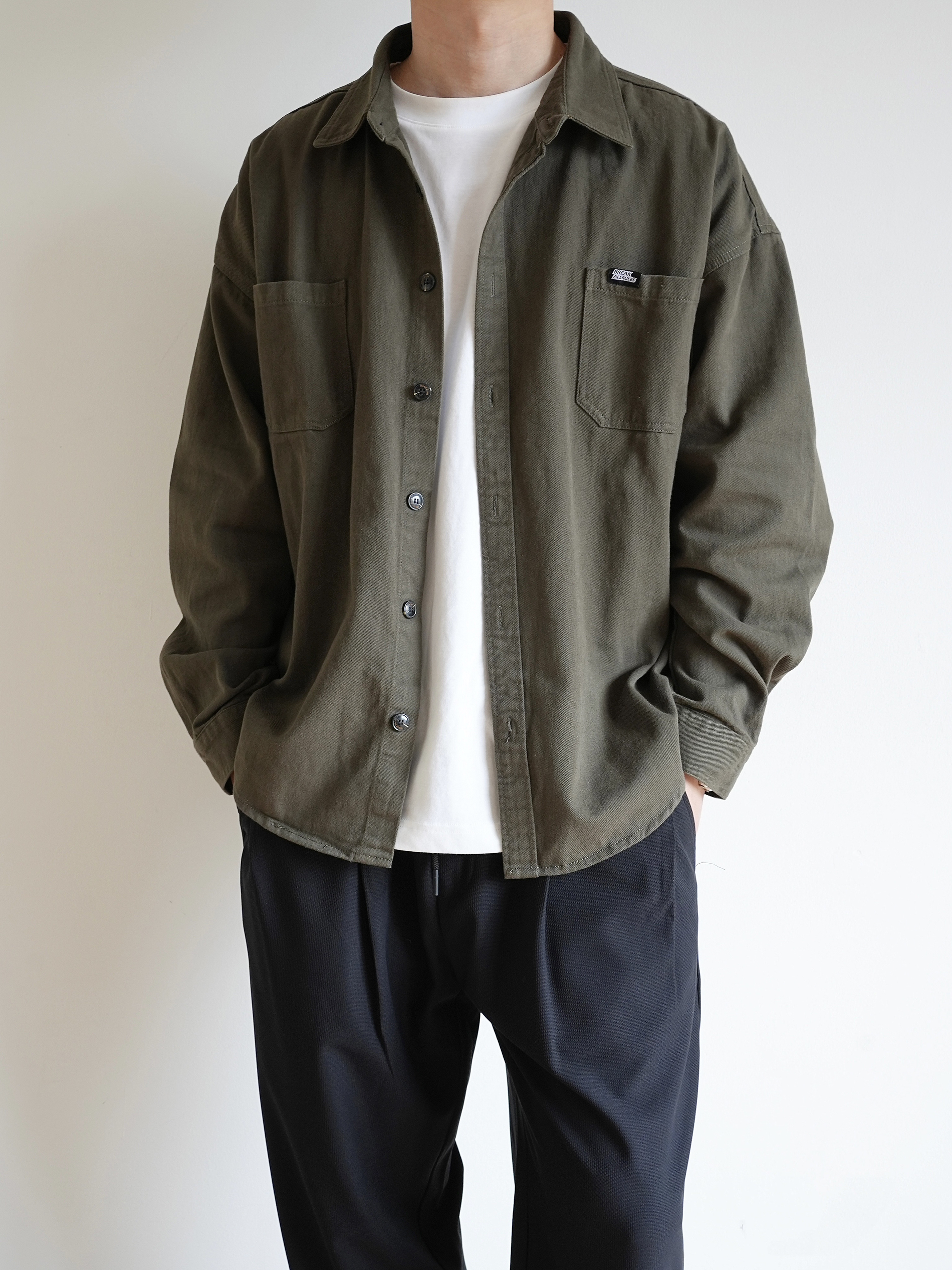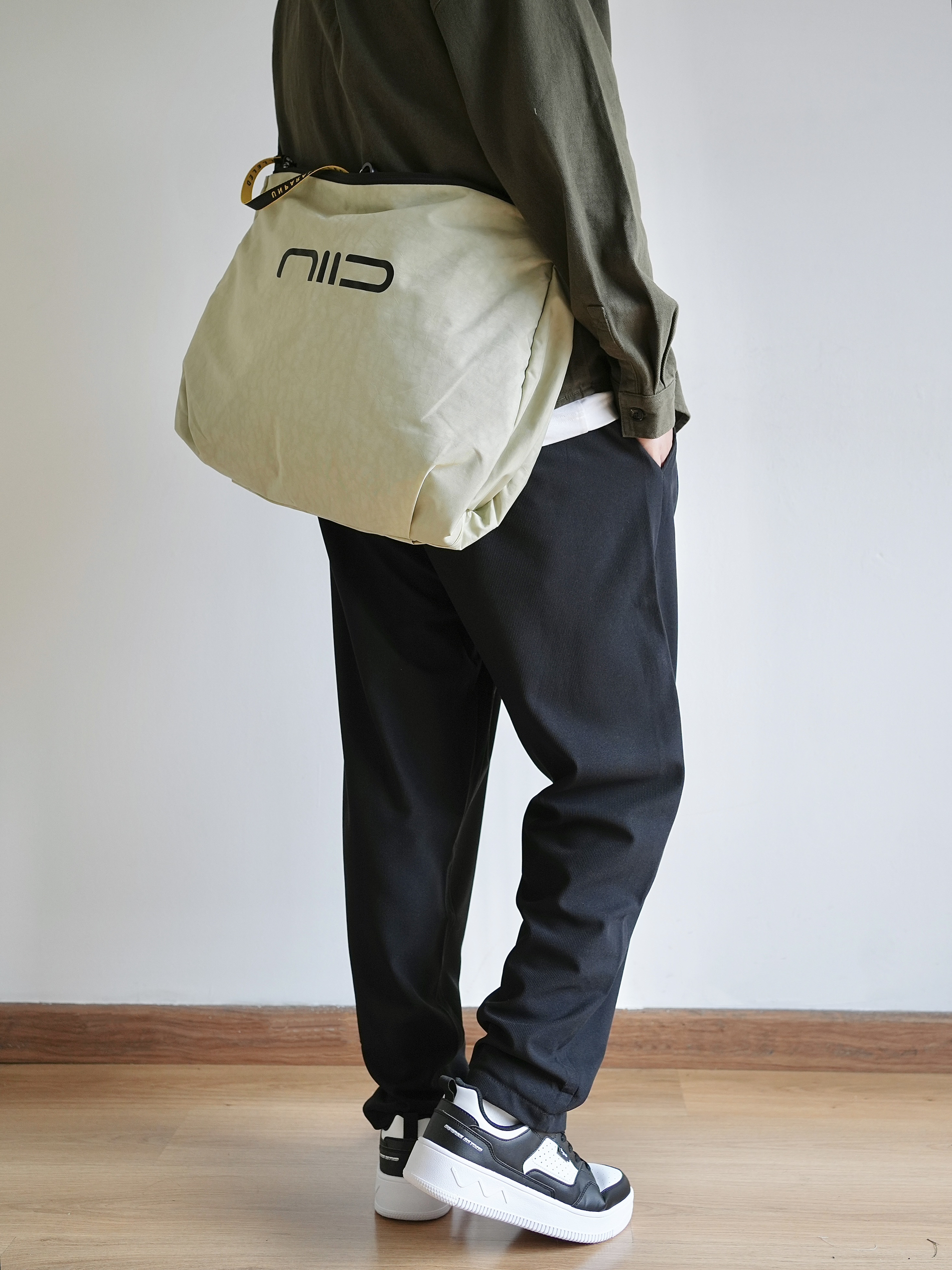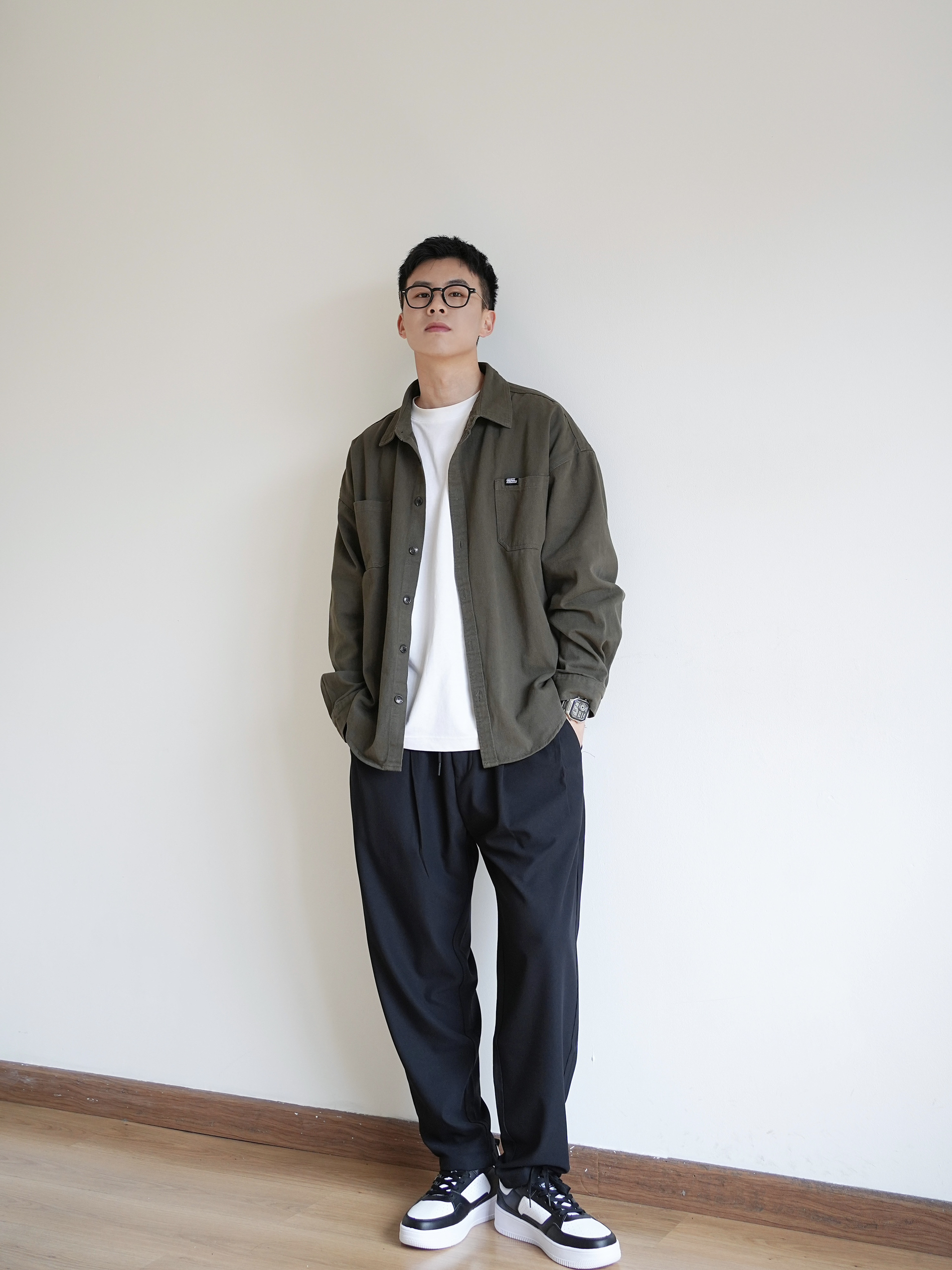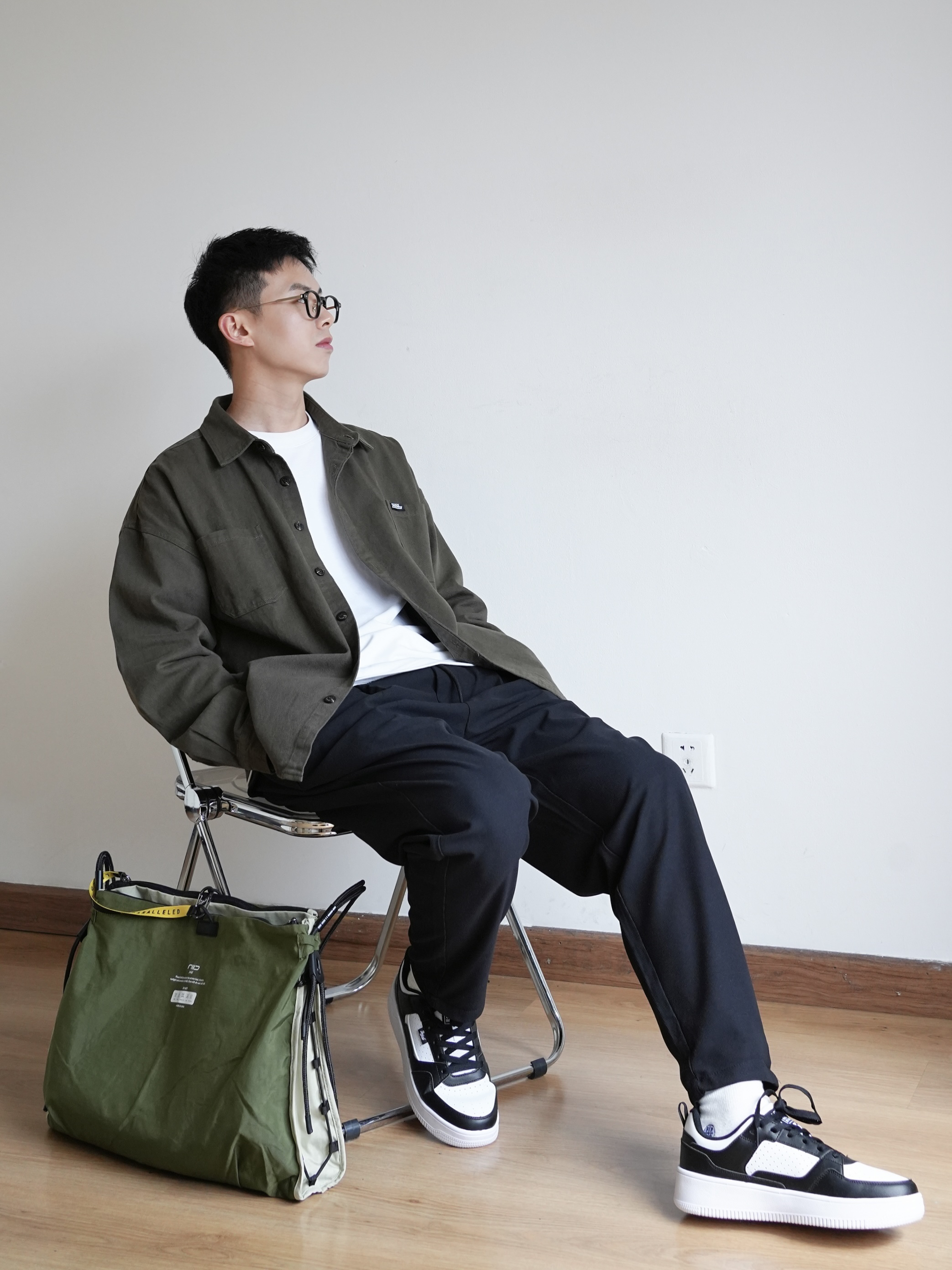 男生通勤该如何穿?个人认为简单干净是基础,选择简单基础的款式,可以让通勤避免出错 绿色的工装衬衣搭配黑色休闲裤,休闲又自在;再来一双黑白熊猫配色的板鞋,舒适还有一点点增高! 出门还少不了一个斜挎包,同色系搭配可以增加穿搭的层次,一个包包两个颜色,一个顶俩!
