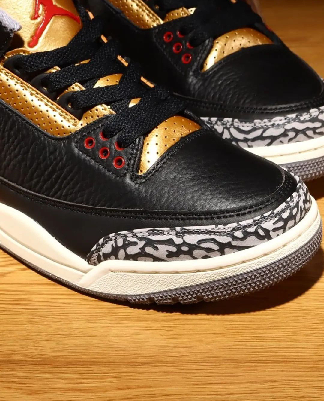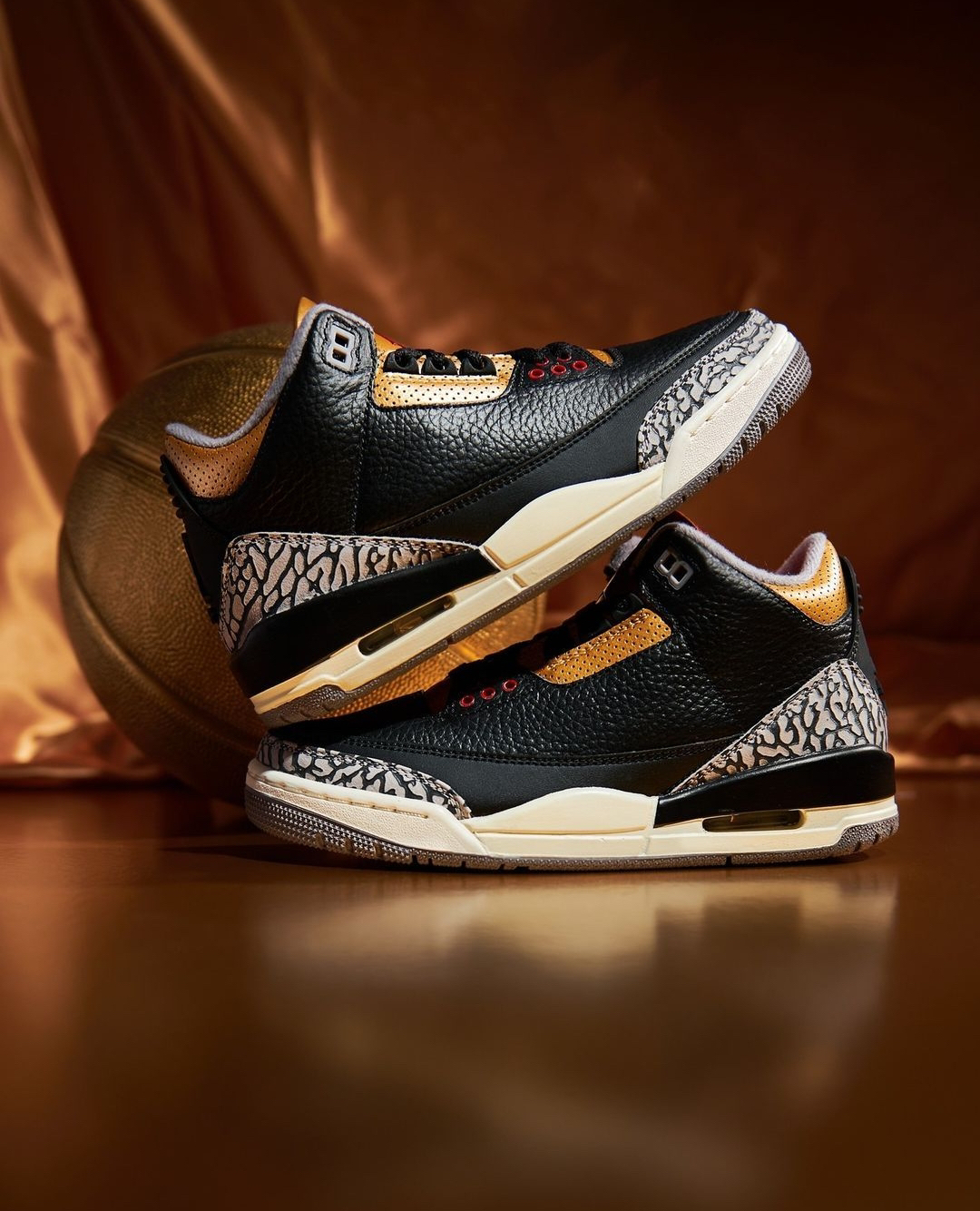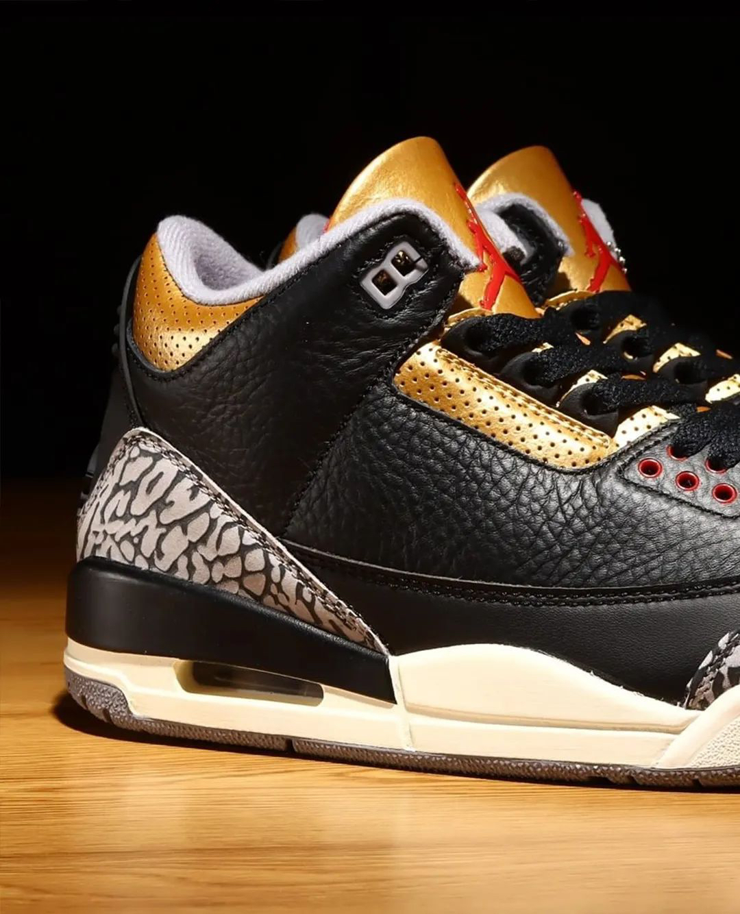 诞生于 1987 年的 Air Jordan 3 中底首次采用可视化气垫,最让大家喜欢的就是其独特的爆裂纹设计。本次全新的Air Jordan 3 Retro“Black Gold”整双鞋采用「黑水泥」配色方案。 经典爆裂纹元素、红色飞人 Logo 都与元年设计完全相同。鞋帮、鞋带孔、鞋舌及吊牌以金色呈现,尽管不是经典配色,但视觉辨识度依然出色。