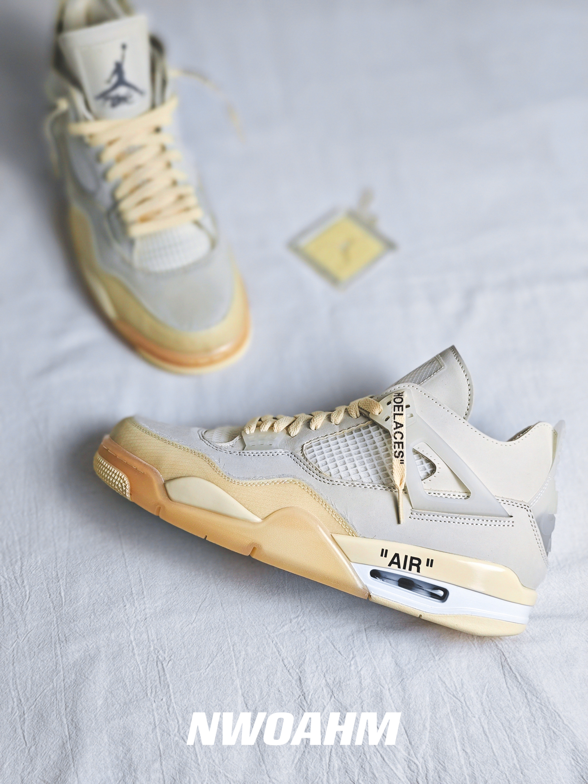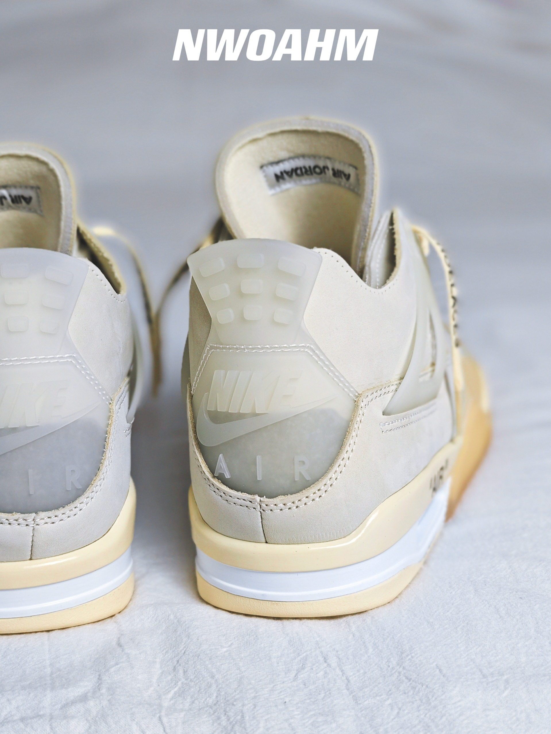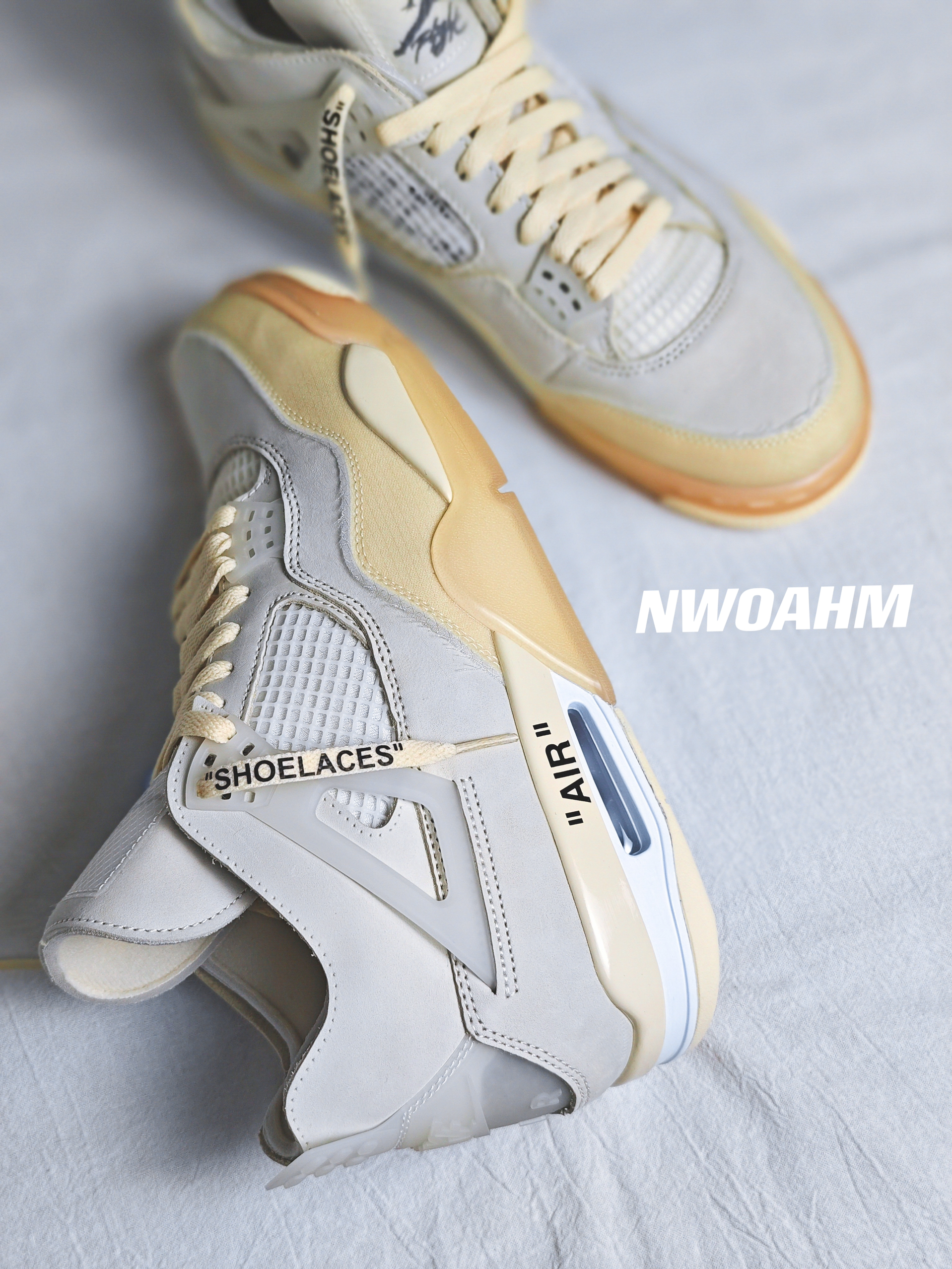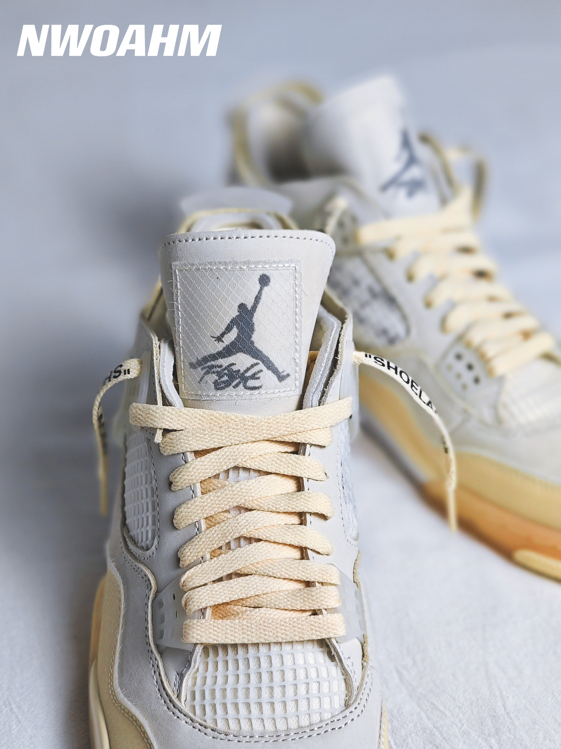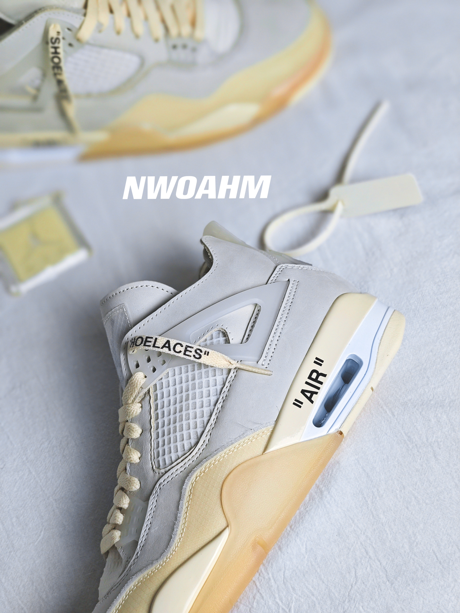 这双Off-white联名的AJ4白帆应该是男女生都非常喜欢的一双了,相比男码过万来说,女码的五折还是很“实惠”的😅。 鞋面由皮革和蝉翼材质共同打造,浅浅的白色真是好看。防盗扣和吊牌也是同色调,虽然作为鞋子的装饰是很好看,不过日常穿着还是建议取掉👀。 最后是尺码推荐,跟正常AJ4一样买大半码即可!