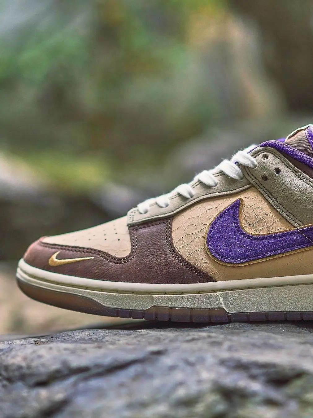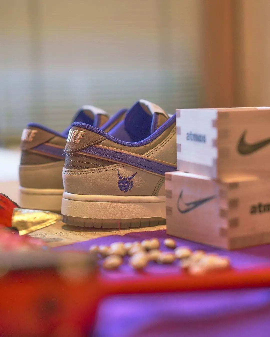 Nike Dunk Low 特殊配色鞋款「Setsubun」灵感取自于日本重要节日「节分」,即立春、立夏、立秋、立冬的前一天,也就是各季节变化的前一天,通常日本人们将会举办「节分祭」进行驱鬼仪式,从室内向室外透过撒豆的方式来保佑身体健康与平安。鞋款运用米色与深浅棕色建构鞋面配色主体,模仿黄豆外观配色,辅以浓郁的紫色点缀细节,包括内里、Swoosh、鞋舌沿线与代表鬼面的印花图像。鞋垫上能看到日本浮世...