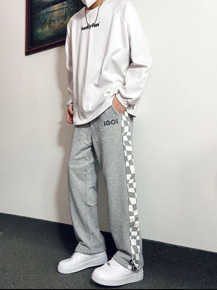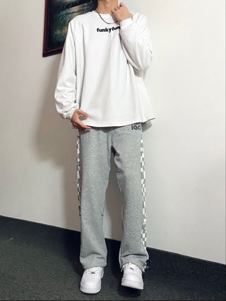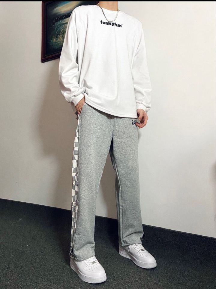 身高|体重:181|130今日份Ootd: 上衣选择了简约logo白色长袖卫衣,干净整洁!裤子选择了灰色休闲直筒裤 裤子侧边灰白格子拼接设计确实是帅!V 裤脚位置还有抽绳设计,可以直筒也可以束脚鞋子选择了百搭款板鞋 白Nike AF1灰白搭配准没错,干净简约又好看