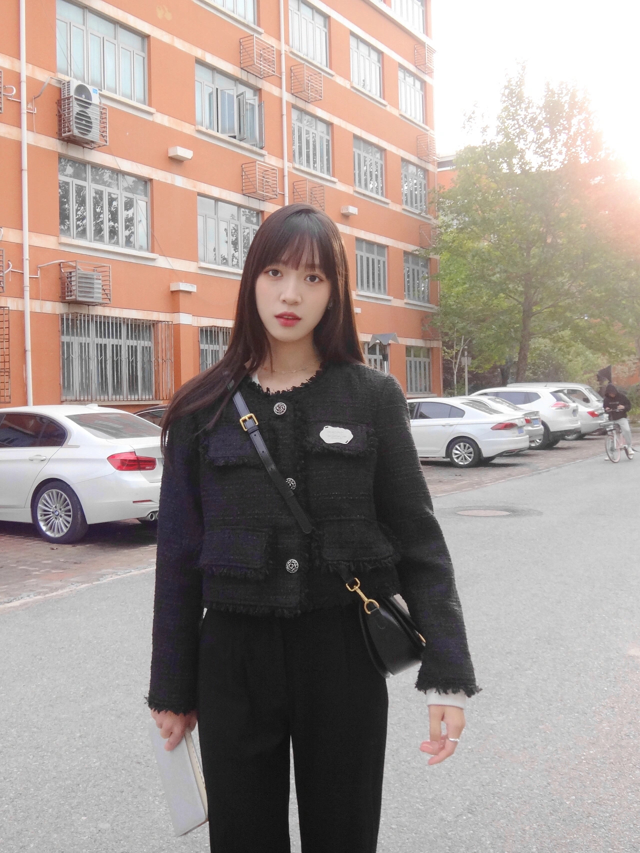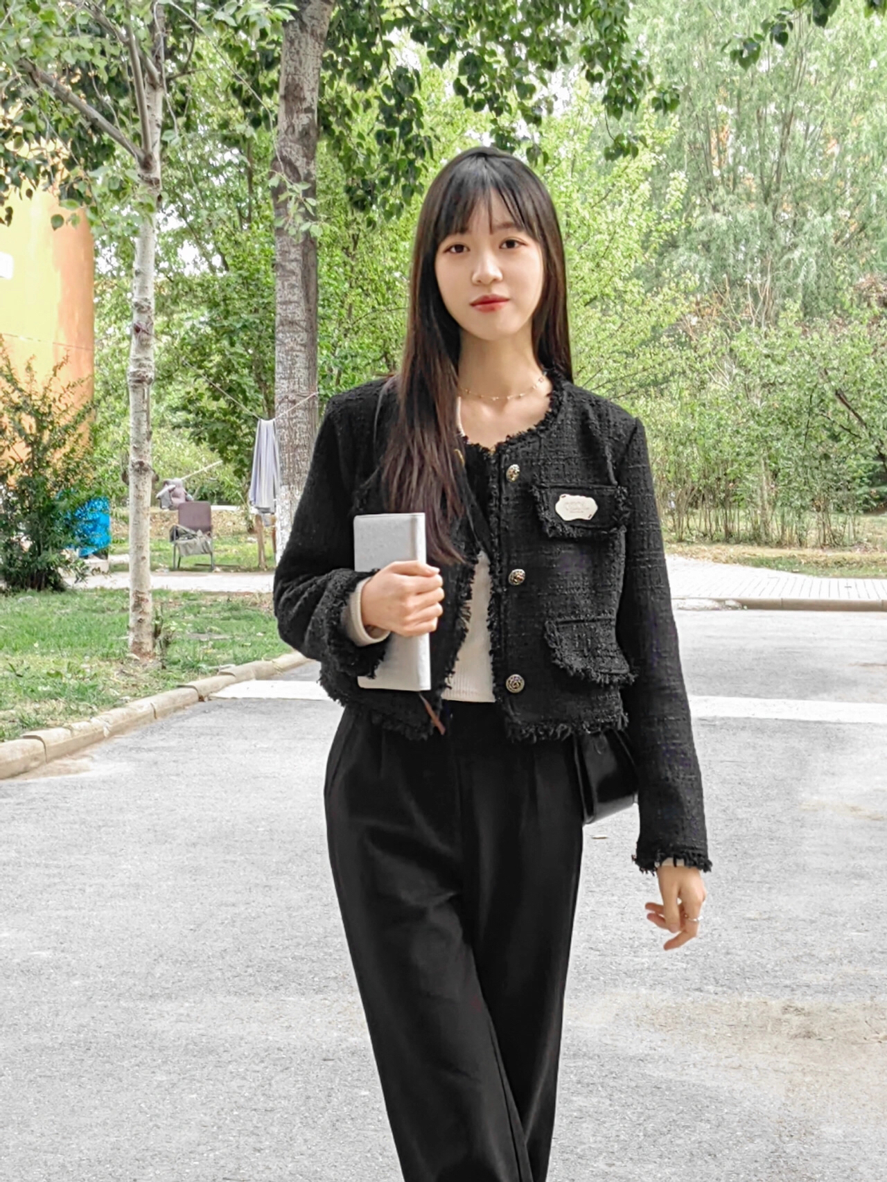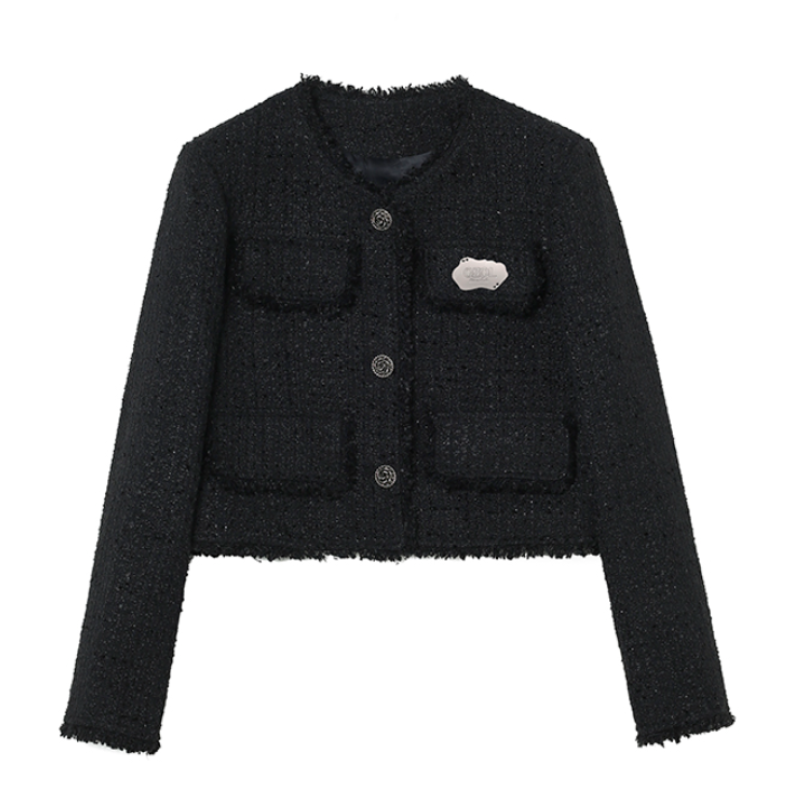黑色系是永不过时的🌟经典色系 小香风外套简直是“人间富贵花” 衣服👔上的异形金属扣新颖别致 胸口有定制品牌LOGO金属牌装饰