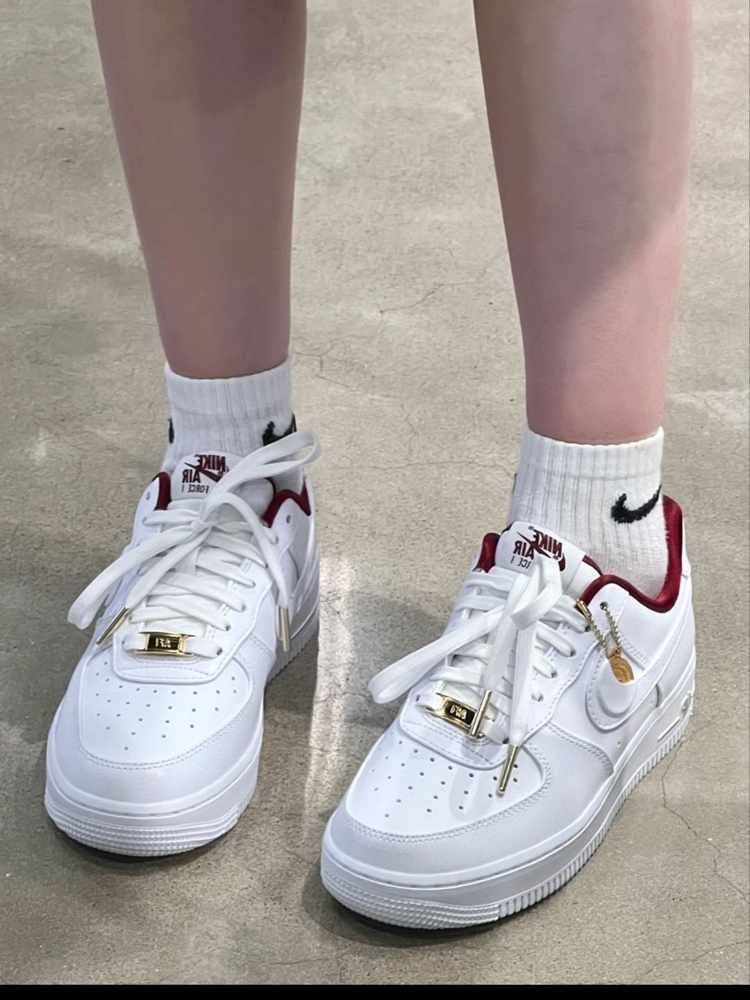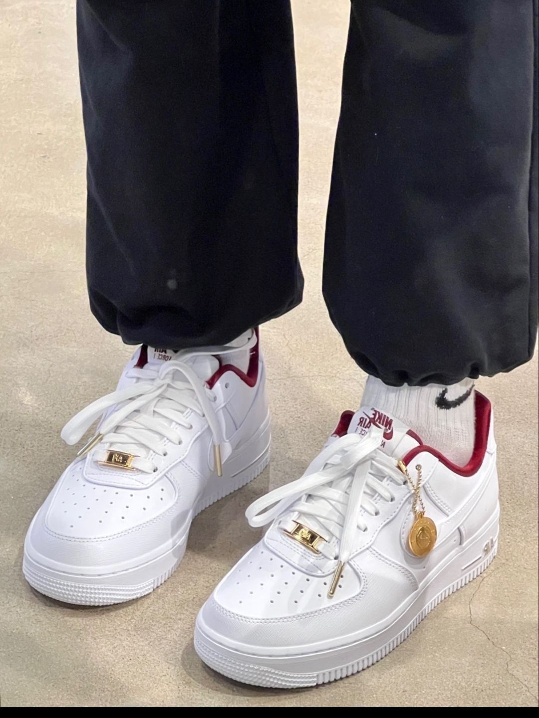 Air Force 1 Nike Air Force 1 Low :采用光滑皮革与纹理皮革组合鞋面, 易于打理,整双鞋以全白覆盖,内饰为酒红色配色,鞋带扣、鞋后跟和鞋身外侧的“Air”字体均采用了金色,时尚亮眼、复古氛围十足 这双AF1鞋身两侧的Swoosh添加了小 口袋的设计,刚好可以将鞋子附赠的小金币 吊 坠放进去,非常有意思,趣味十足