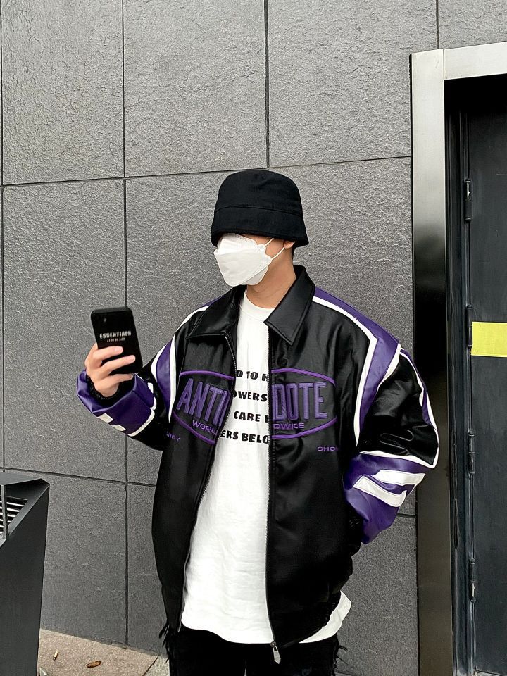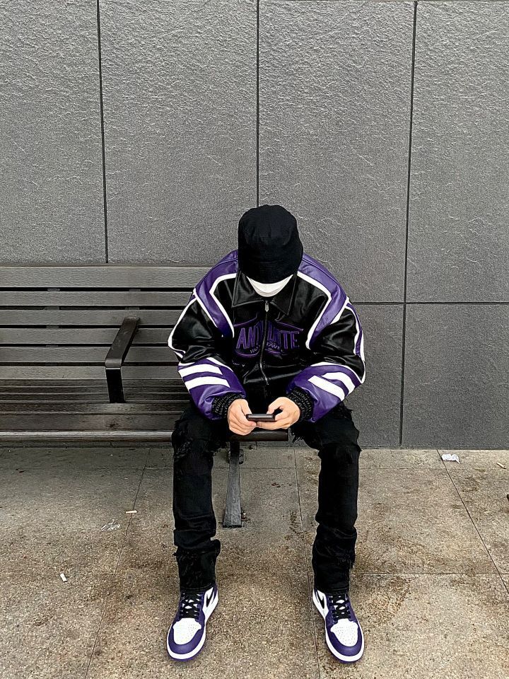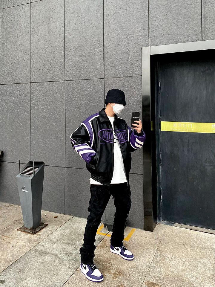 秋冬怎么可能不整件机车皮衣 紫色也太骚了8⃣️ 裤子当然是纯黑色的牛子裤 搭配这双AJ1白紫刚刚好👀