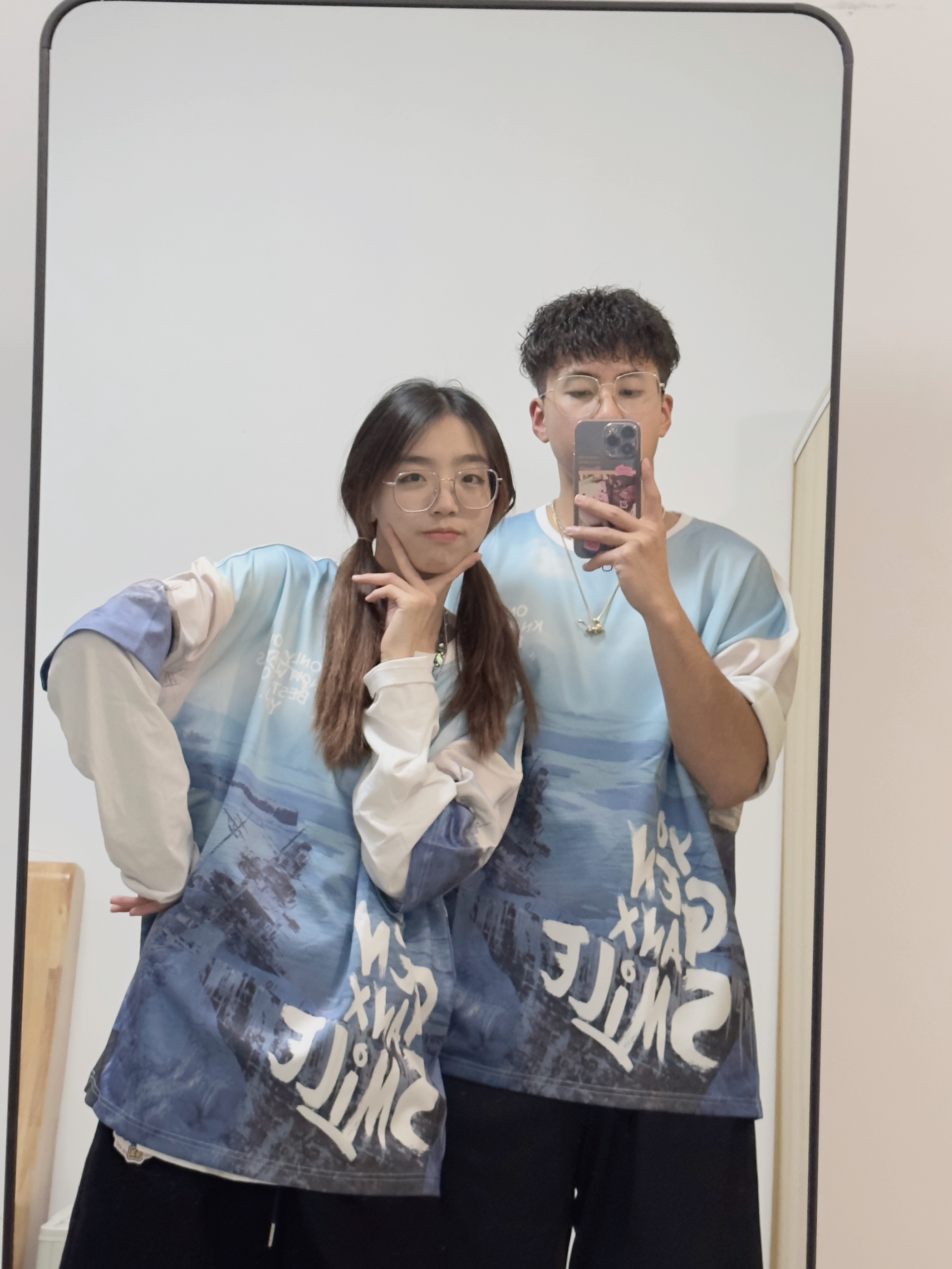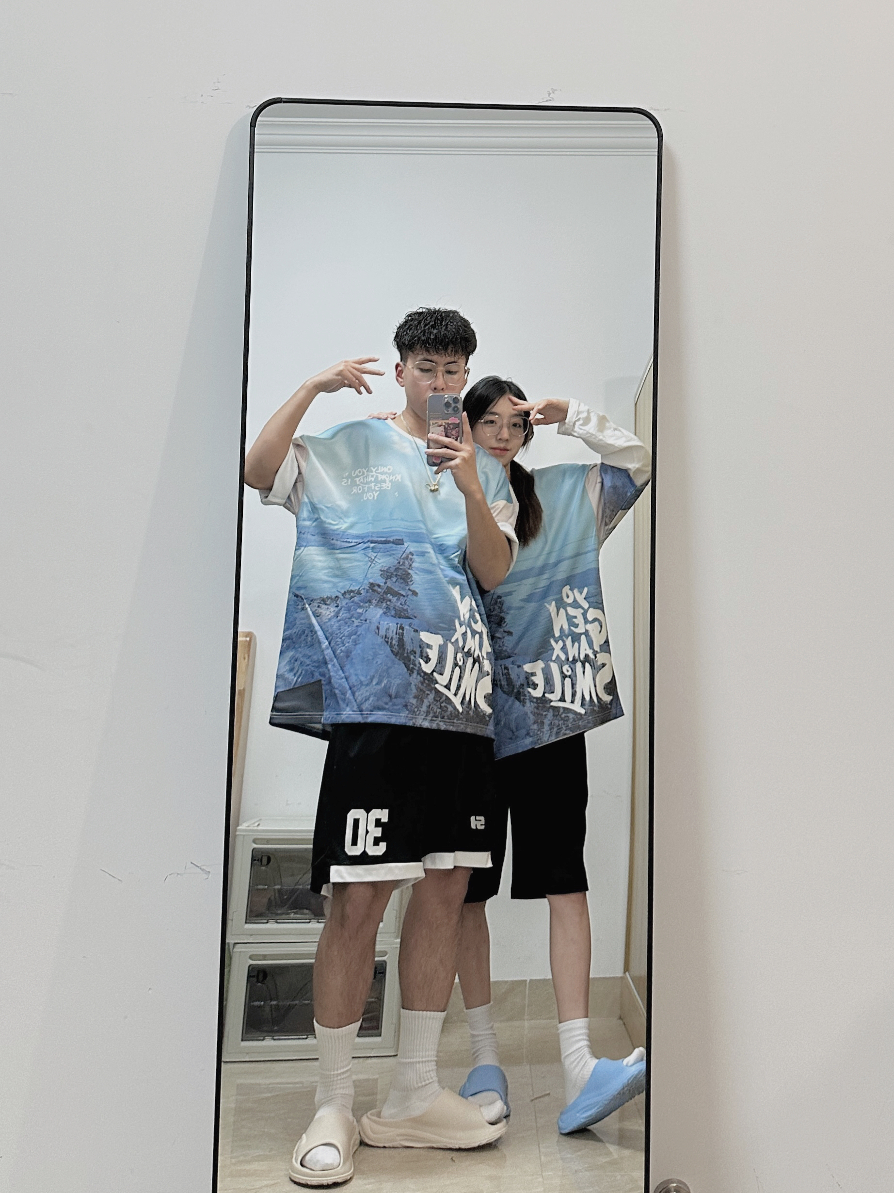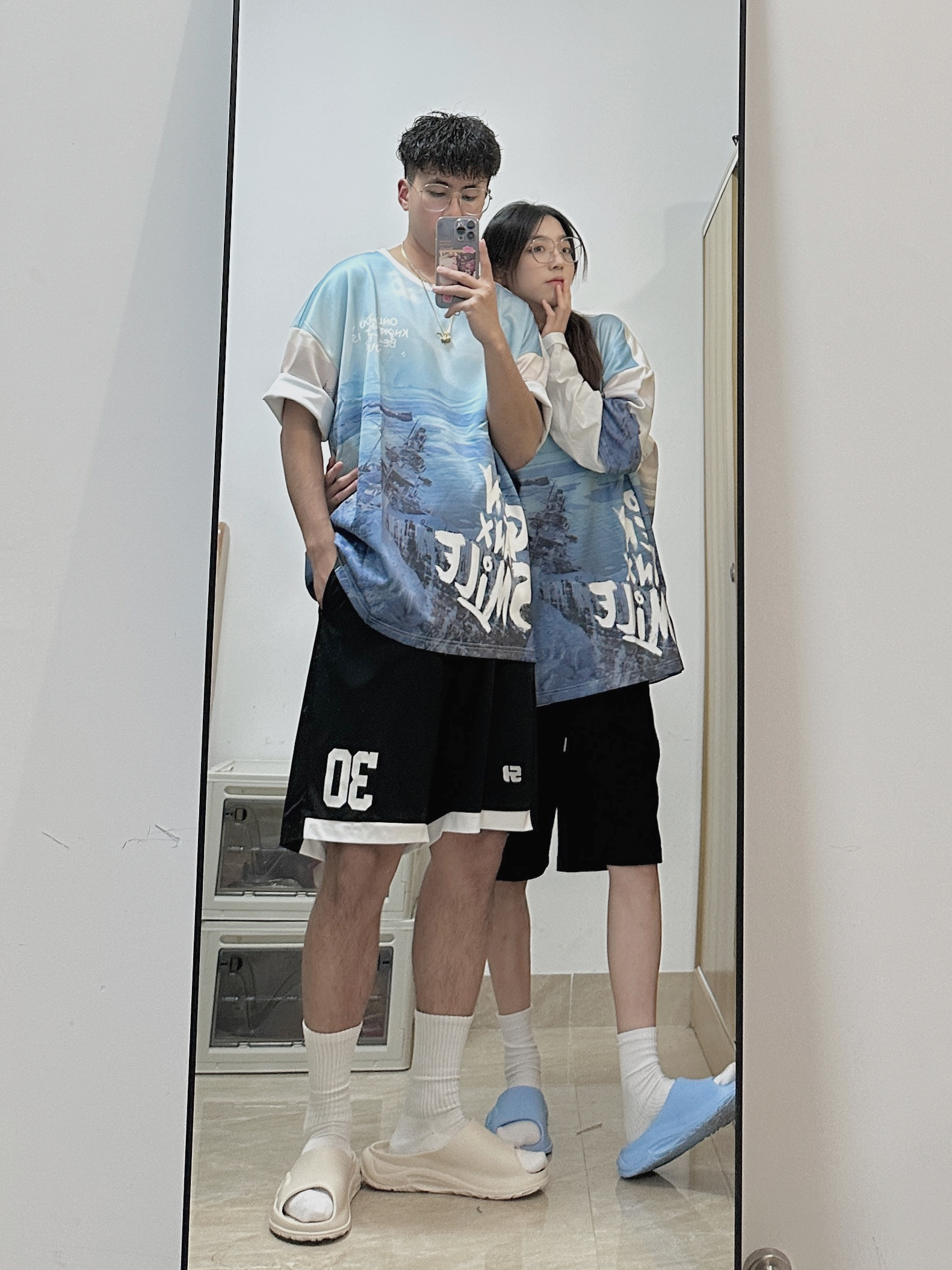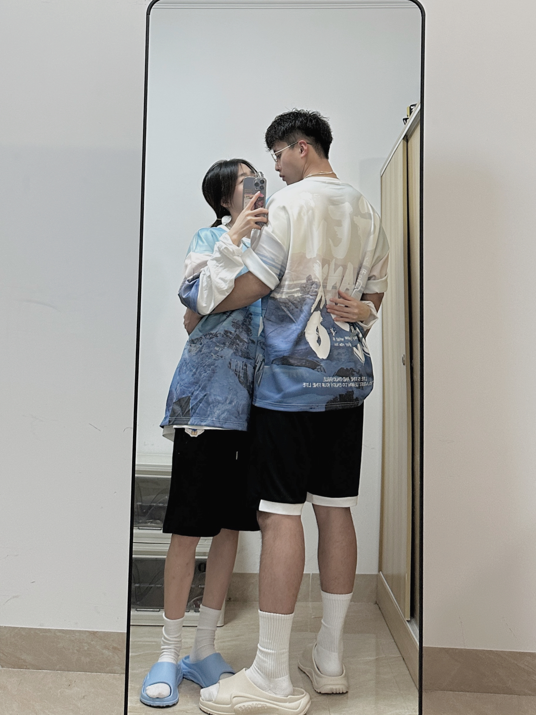 小铭宗宗情侣专属穿搭频道来啦~ 👧:168/44穿M 👦:182/70 穿XL 风格:时髦/休闲/百搭 虽然还是春天 但却想念夏天了 想念一起穿短袖T的季节! 一起穿雾霾蓝落肩的T恤自带吸睛气场,绝绝子喔~ 下身搭配黑色短裤就很奈斯! 最后可以搭配蓝色💙拖鞋和白色的拖鞋🤍 简单的色系和宽松的搭配 是春夏特别吸晴又显年轻的穿搭~