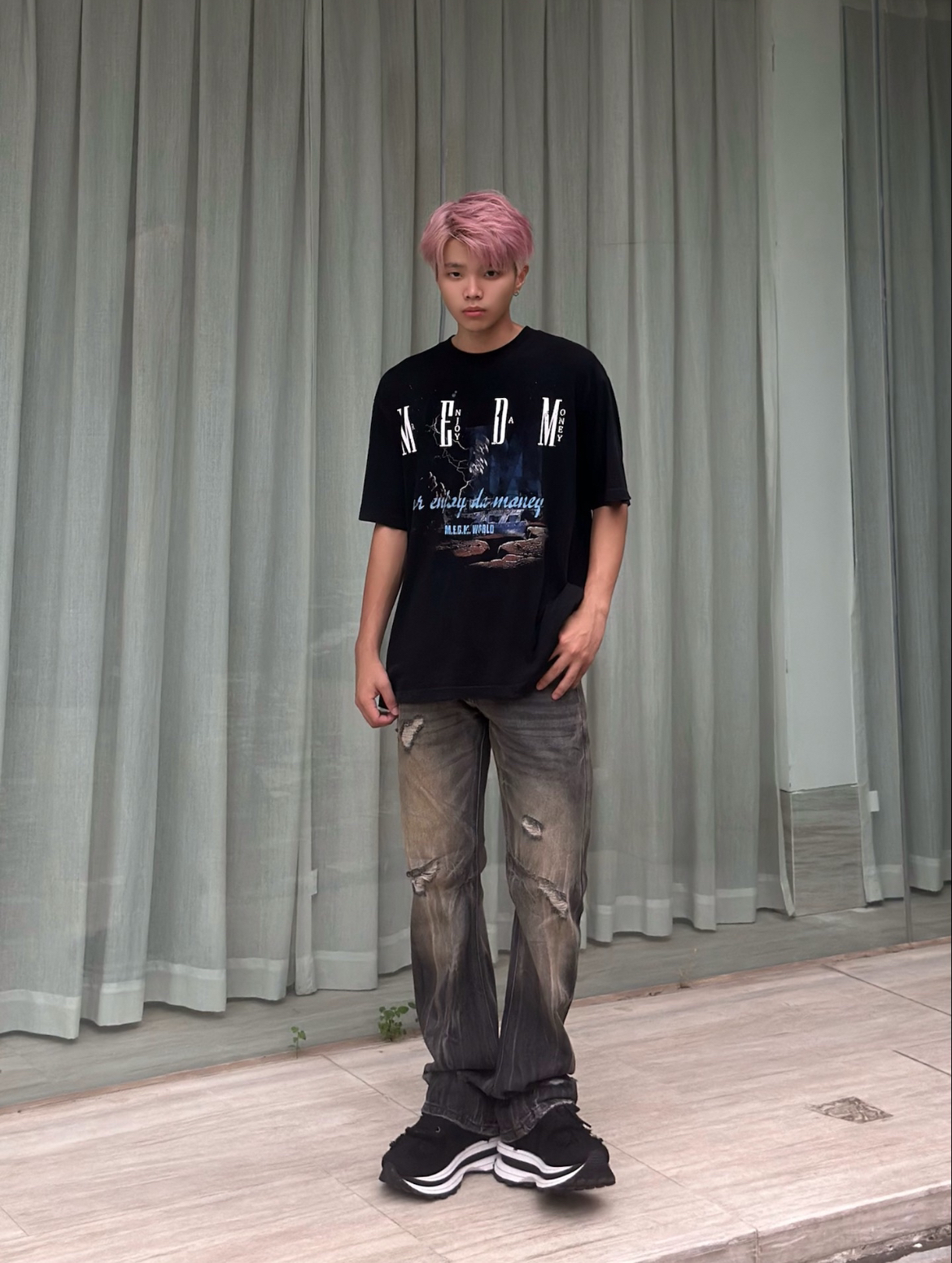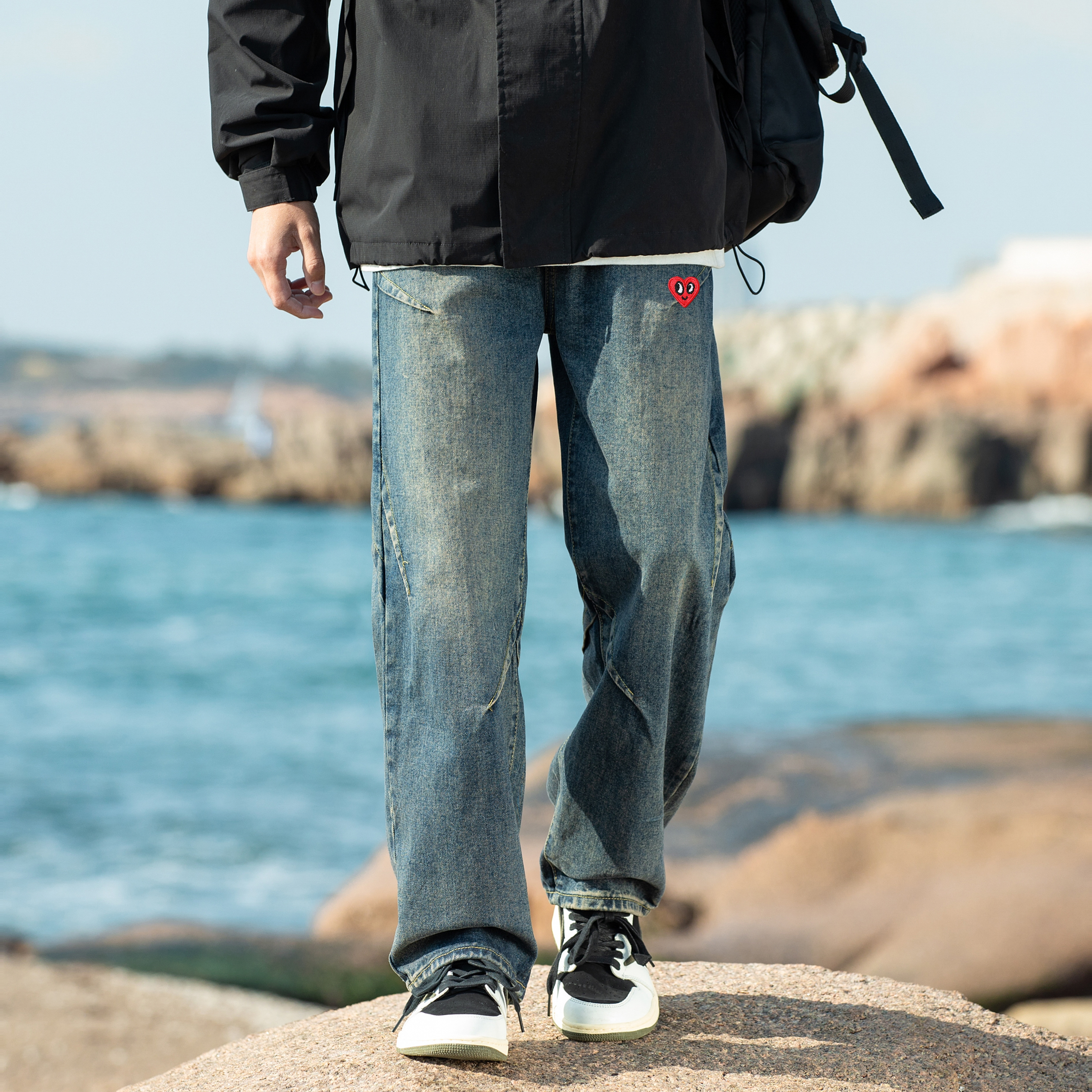 牛仔裤万万种,有一种颜色永远是百搭不过时的。一起康康👀吧~ ✔️搭配颜色/单品:黑色短袖/复古深蓝牛仔裤/酒红色球鞋。整体看起来是属于深色系搭配,日常通勤挺好。 ✔️特点:衣服比较厚舒服/裤子复古风格,有深浅渐变,面料挺厚的,质感不错。 👖: BENDL’S 复古做旧刺绣牛仔裤 ✔️参考尺码:173/66 L (宽松感如图) ✔️参考风格:休闲/复古
