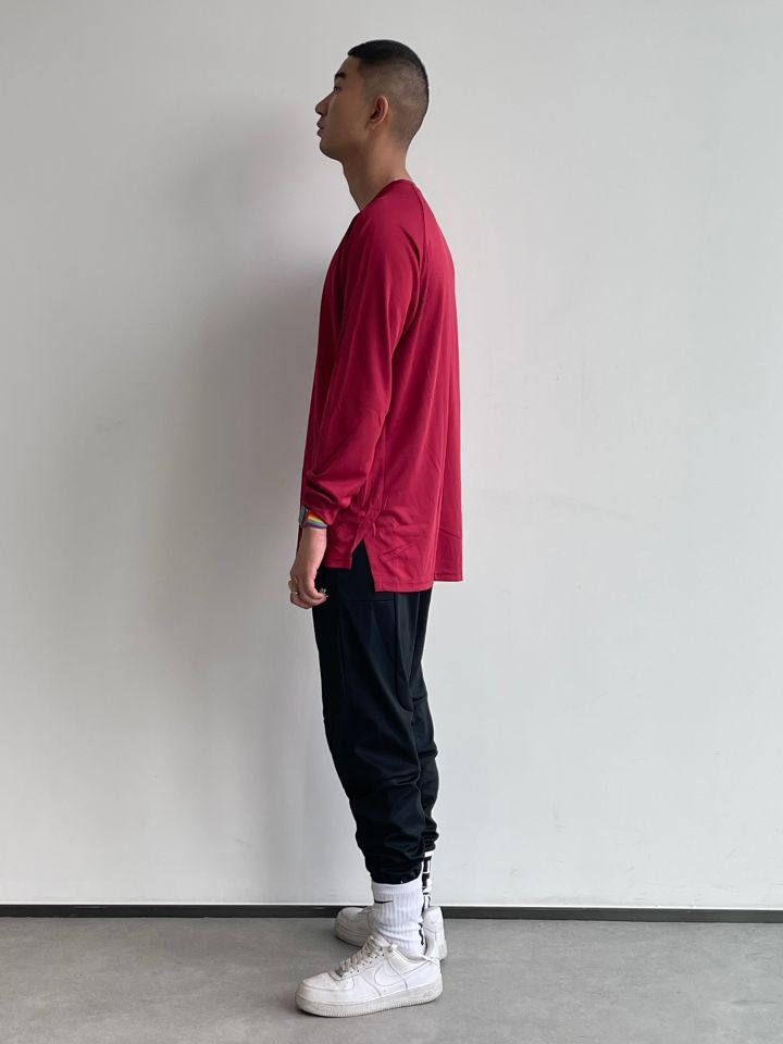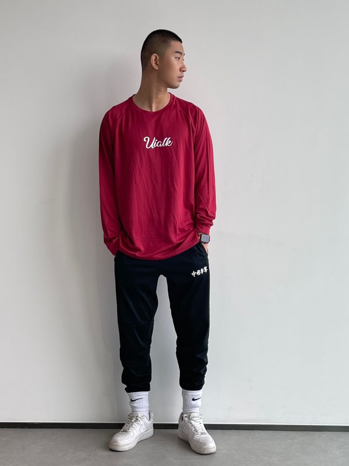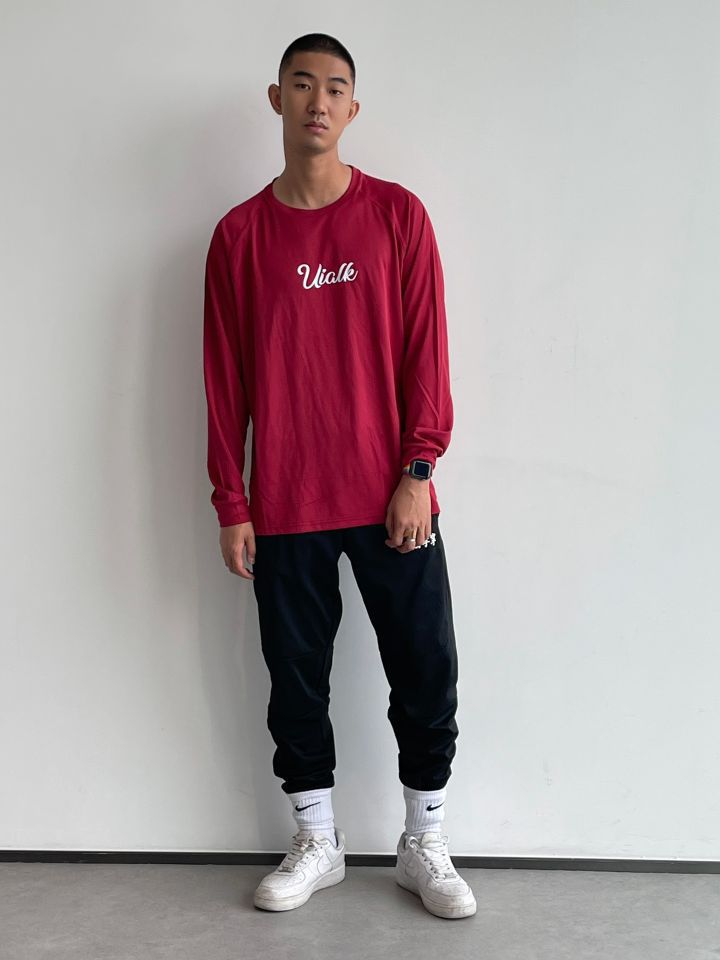 一款运动 、透气 、速干 的长袖T恤 是每个男生衣柜必备 不管是休闲穿 、运动穿都是很不错的 颜色多样真的是眼花缭乱多种多样 我选的是红色比较有个性 有一说一真的是很百搭 很好看的一款投篮服价格亲民 穿着舒适 平时不健身 出街搭配长裤|短裤也是不错选择 👔:UIALK 👖:NICED