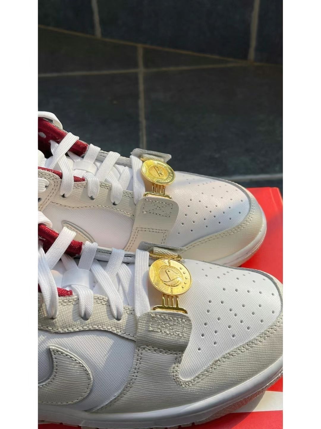 以乳白色为主色调打造,内讨辅以酒红色,层沙 感很强烈 鞋身框架是条纹漆皮纹路皮革打造,在鞋后跟出 印有显眼的JUST DO IT字样,层次感很棒 金色鞋带扣上脚特别量眼,印刻有MMXX11字 样,主体是一颗篮球。
