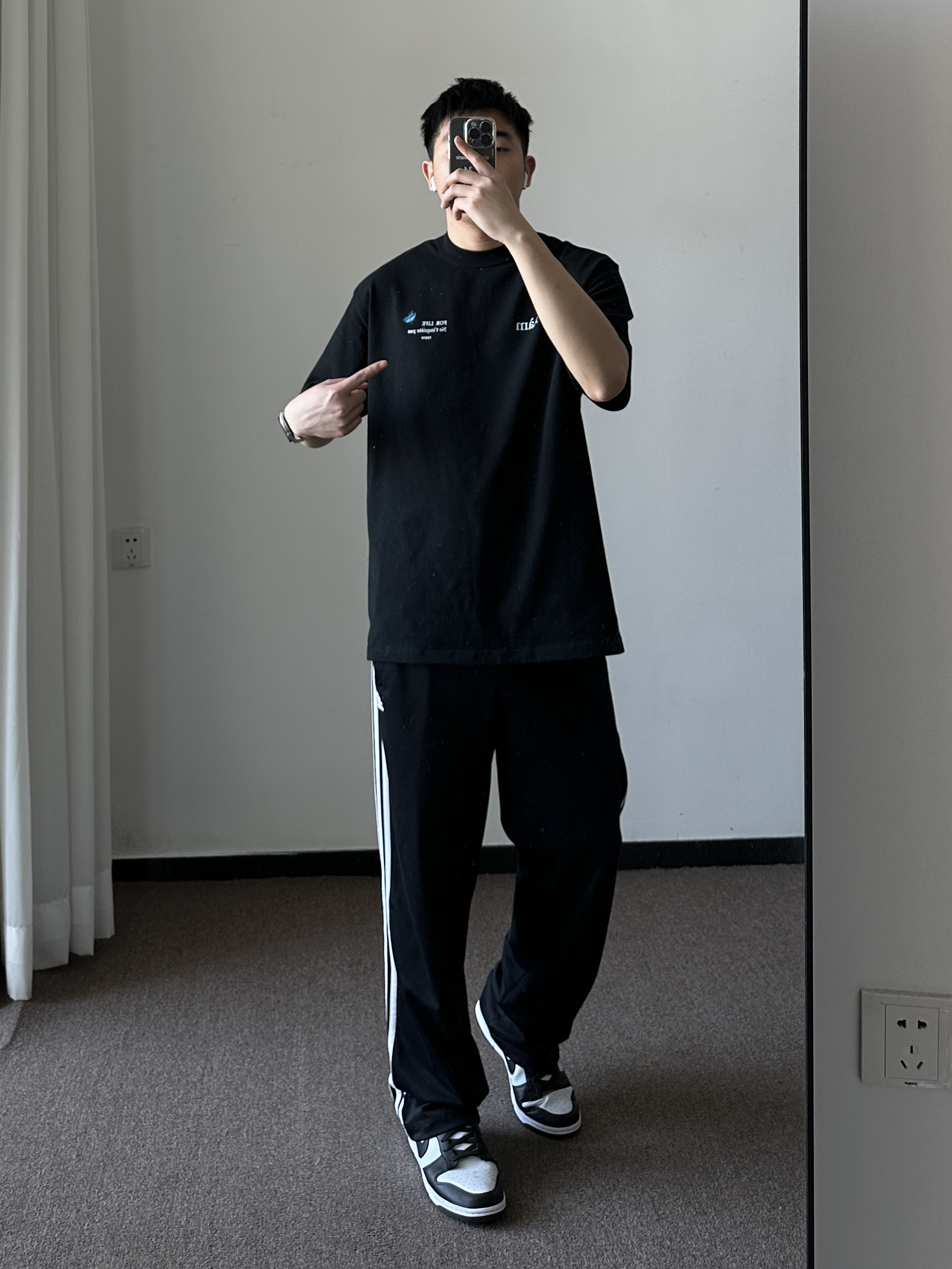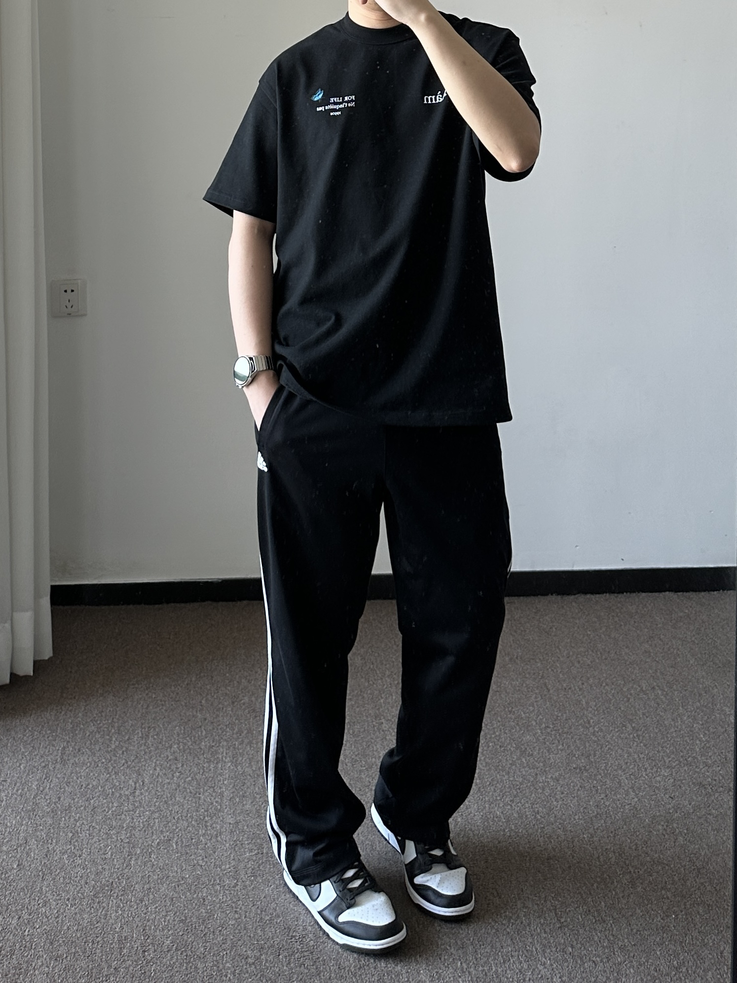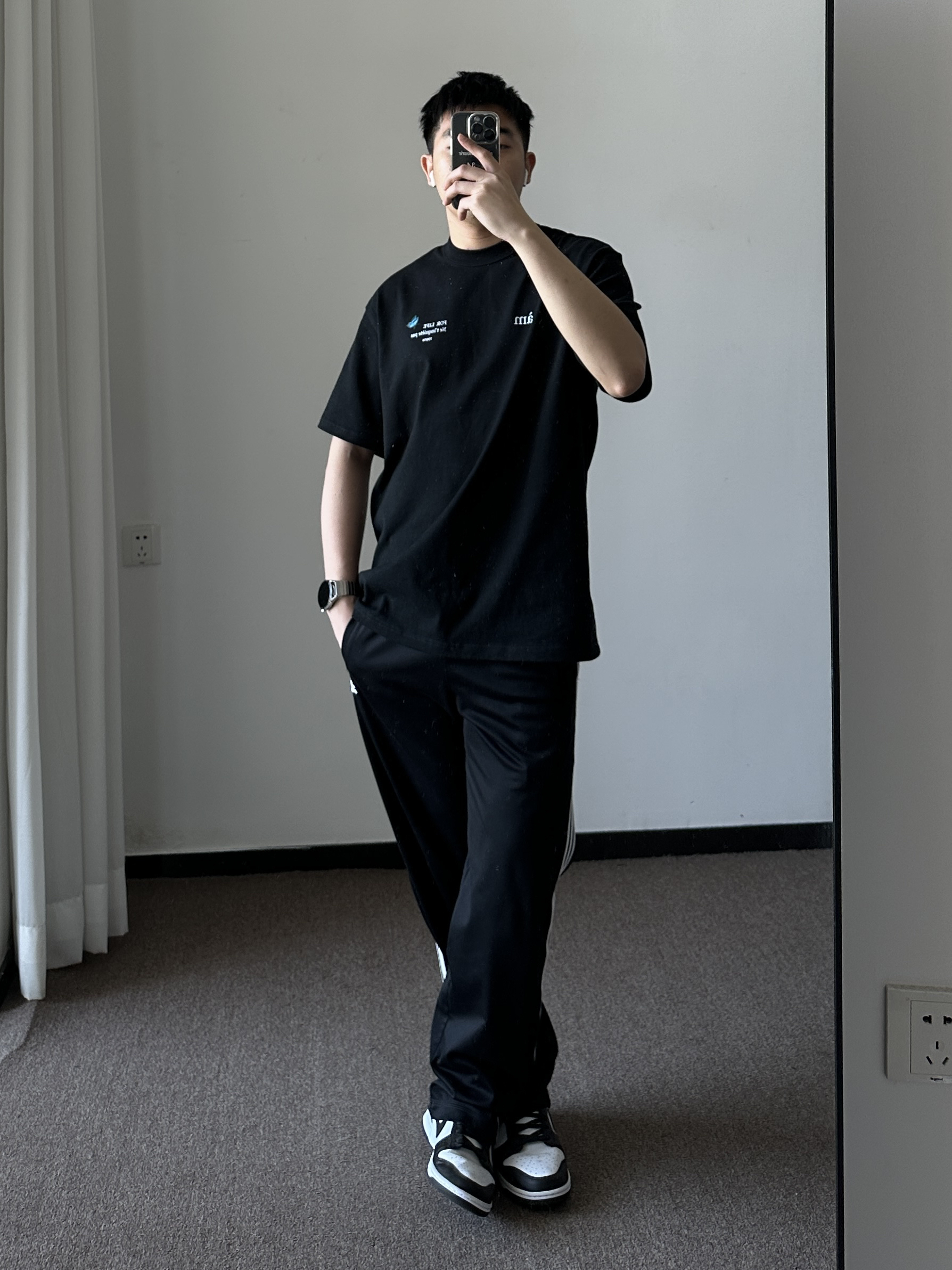 素人也能好看系列~ 174cm/65kg 🧥-短袖只穿简单百搭款,小领口版型、重磅面料必须有。 👖-运动裤、素色牛仔裤都不错呦! 👟- dunk再多出点便宜配色吧!