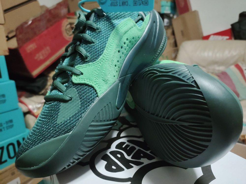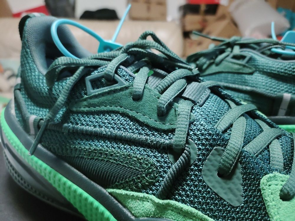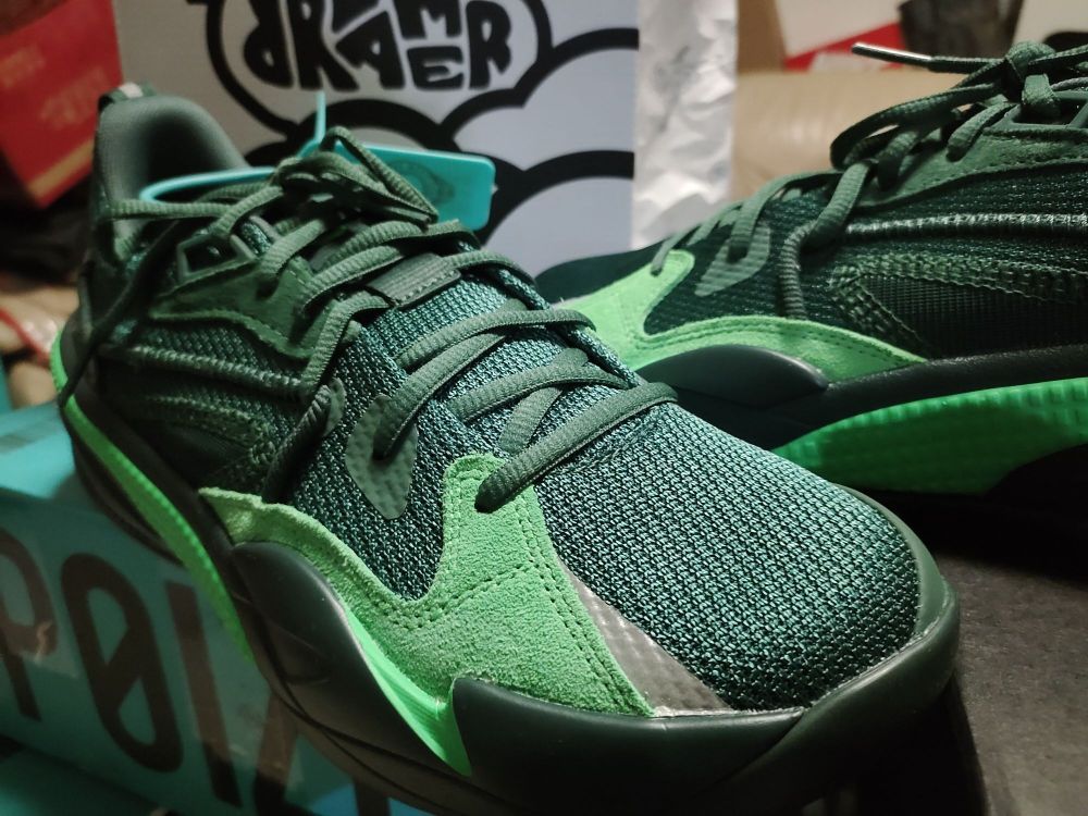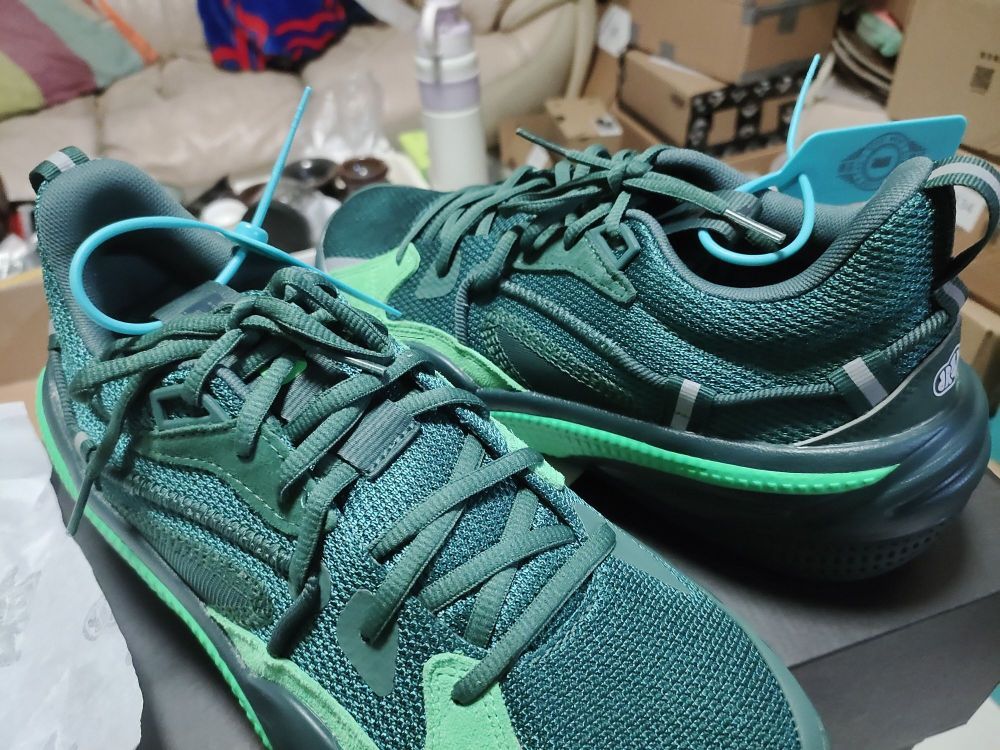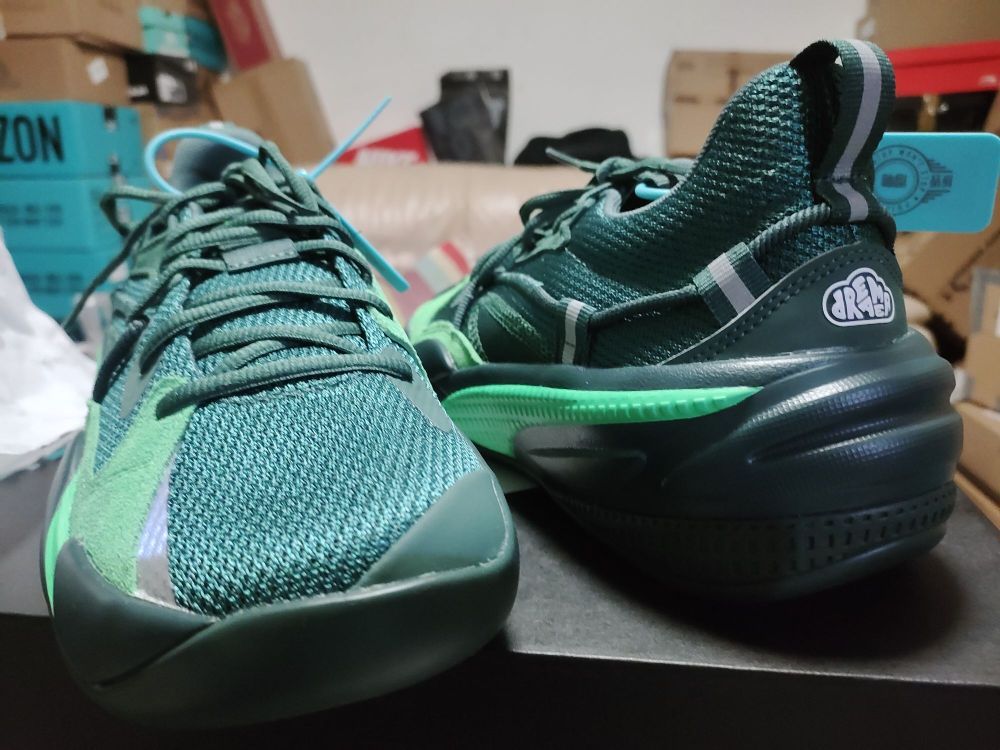 通体由三种绿色组合而成 鞋子由 织物/二层牛皮革/人造革/热塑性聚氨酯 这些材料构成 整体还是复古篮球鞋的造型 这个绿真是绿的我心宽神怡 别的不说就Puma自从复出篮球鞋产品线以 不能说每一款实战性能有多好叭 但百分百有在认真搞设计啊 颜值是真的都很可 反正我是很爱而且又冷门小众不撞鞋 这双我愿意称它为我的鞋柜里绿色系最佳实战鞋