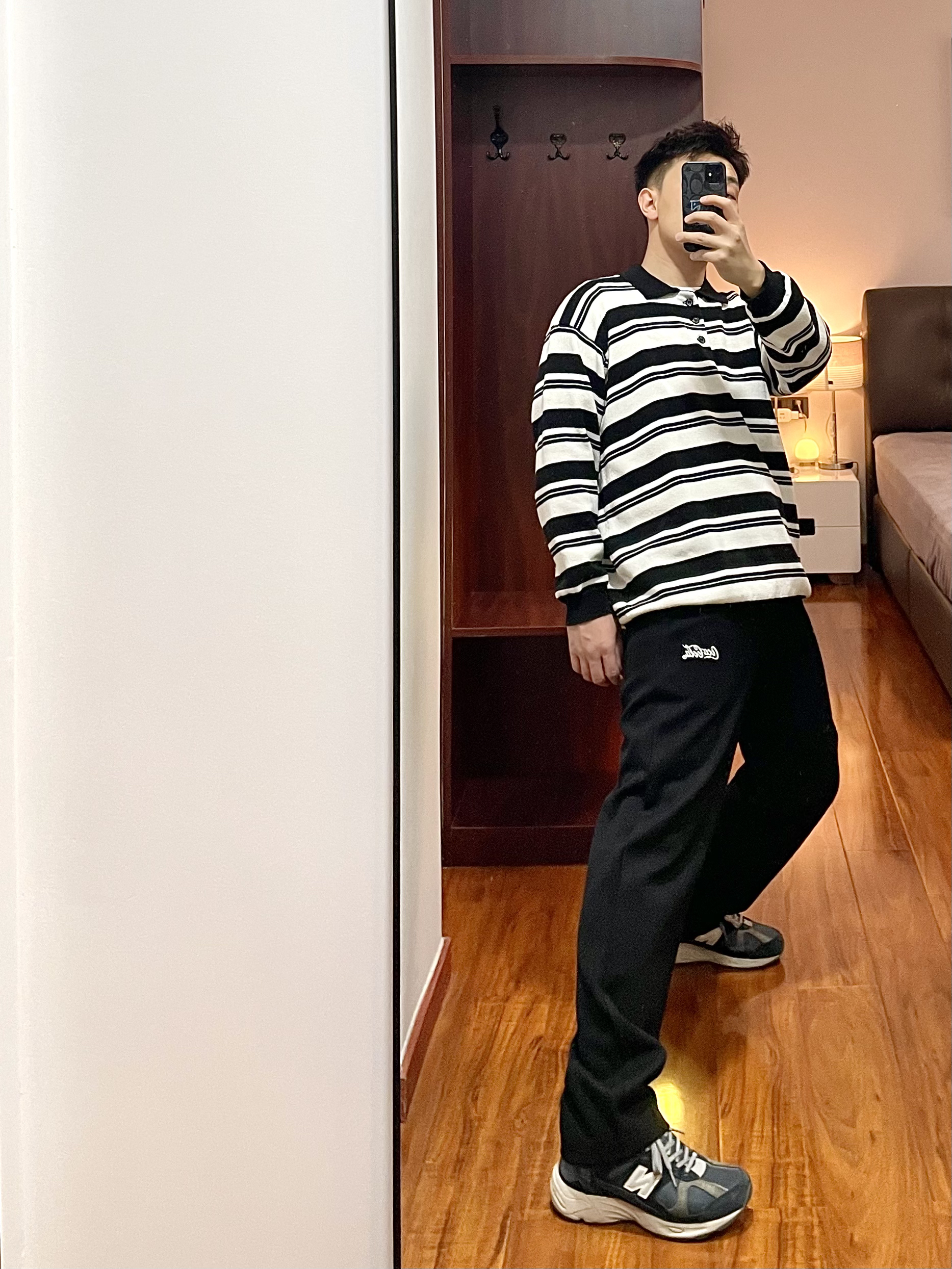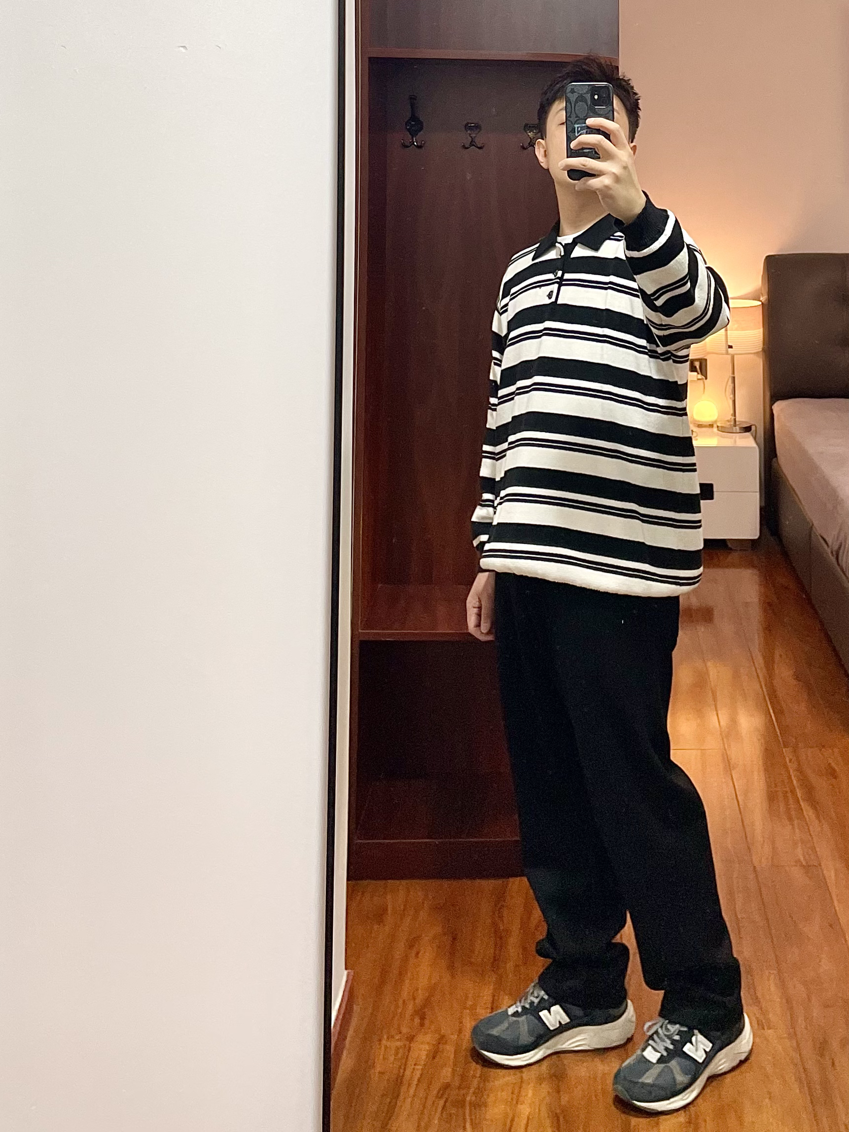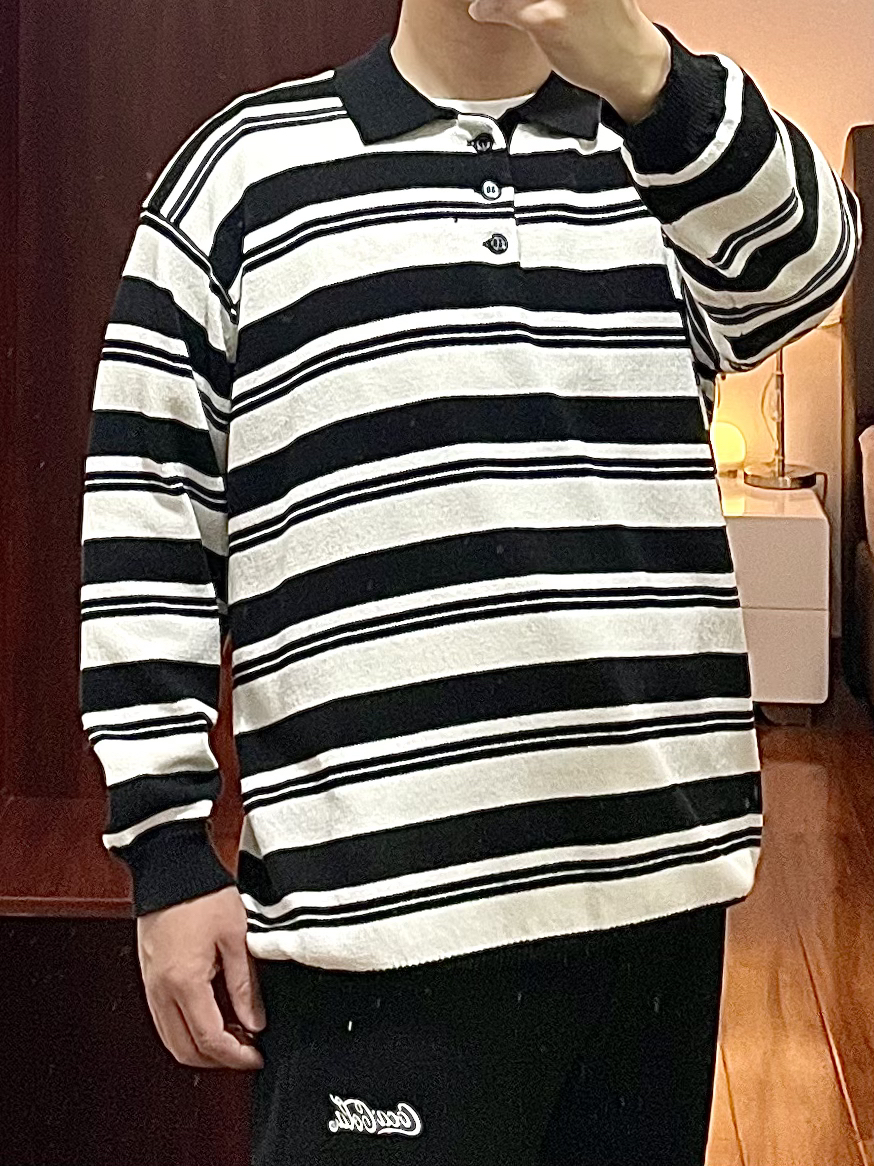 170/135斤 一个普通人的穿搭分享 👔:条纹针织衫 黑白相间的条纹polo领,版型宽松,下摆处有收紧束口凹造型很方便。 👖:Coca-Cola 休闲裤 黑色直筒宽松版型,厚薄适合在春季穿,裤身简洁就一个小logo,整天上身效果显瘦显腿直。 👟:new balance 878 海军蓝配色,自己更换过鞋带,鞋子上脚脚感适中,鞋底有厚度运动休闲久穿不累脚。