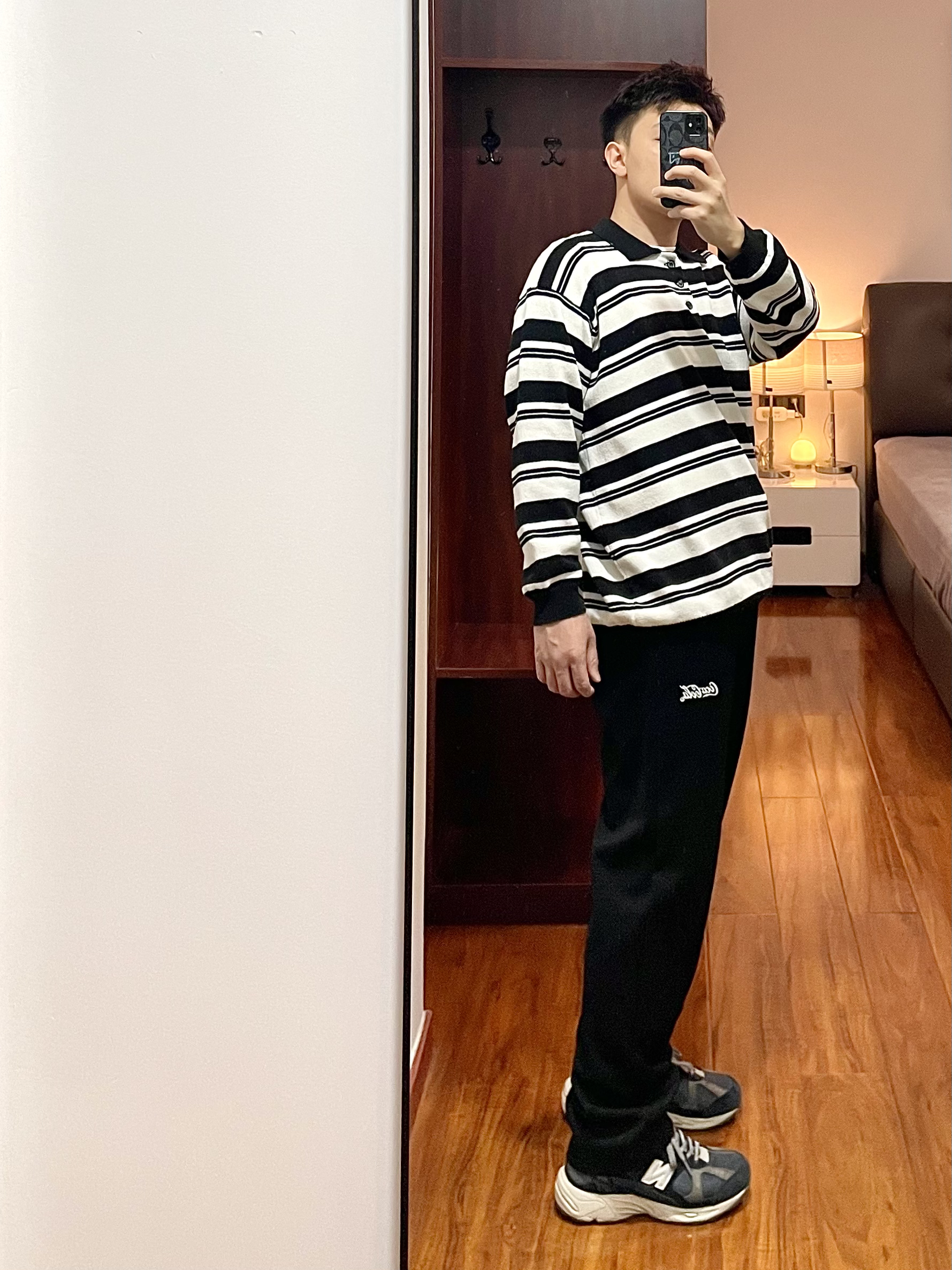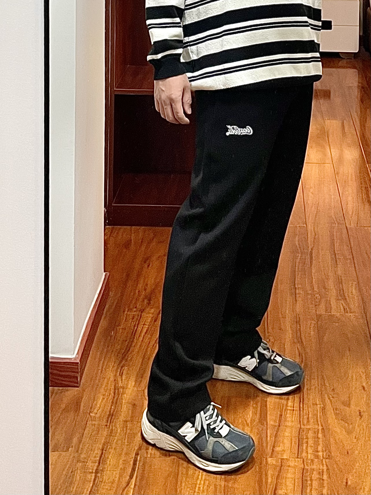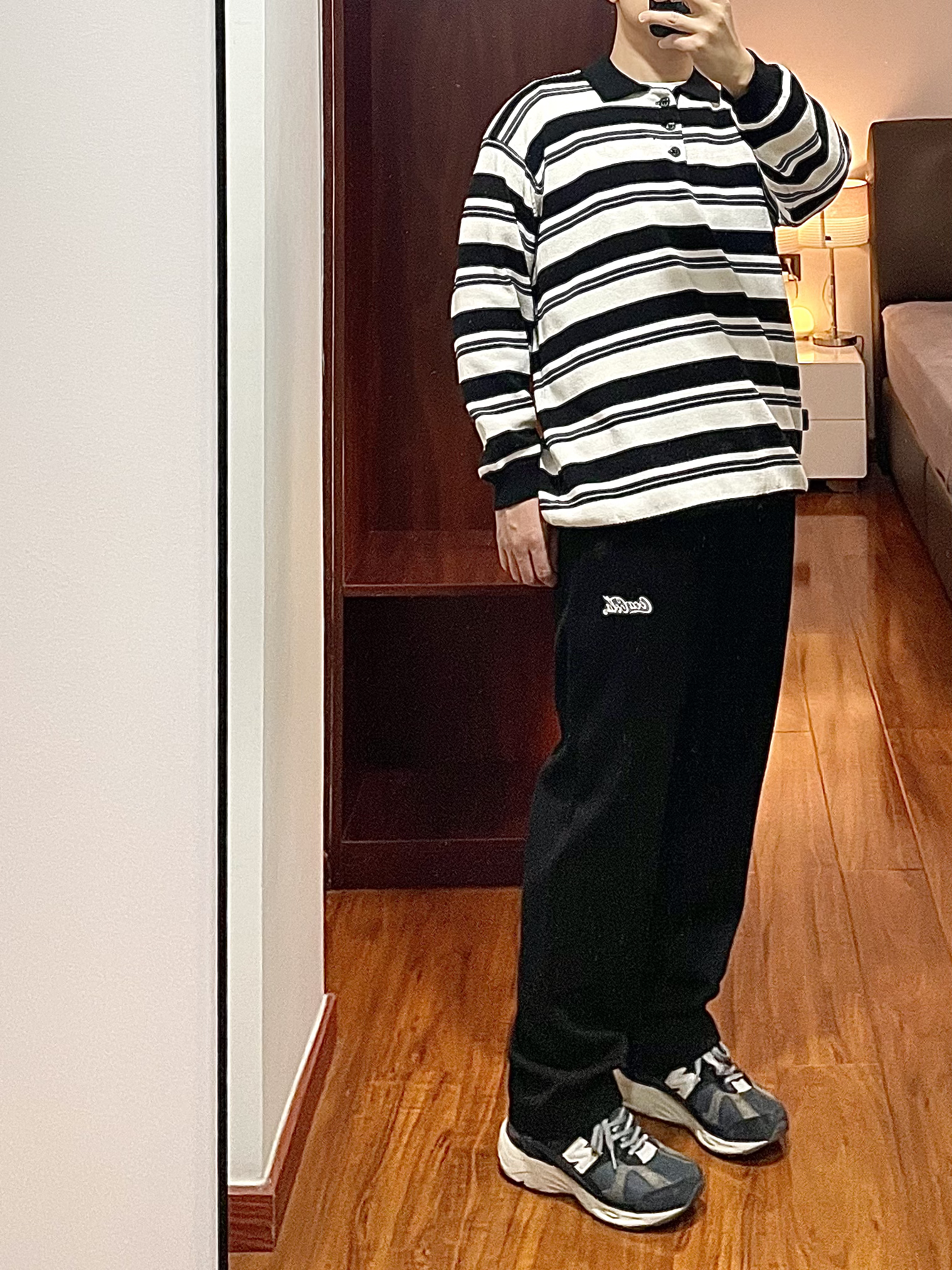 170/135斤 一个普通人的穿搭分享 👔:条纹针织衫 黑白相间的条纹polo领,版型宽松,下摆处有收紧束口凹造型很方便。 👖:Coca-Cola 休闲裤 黑色直筒宽松版型,厚薄适合在春季穿,裤身简洁就一个小logo,整天上身效果显瘦显腿直。 👟:new balance 878 海军蓝配色,自己更换过鞋带,鞋子上脚脚感适中,鞋底有厚度运动休闲久穿不累脚。