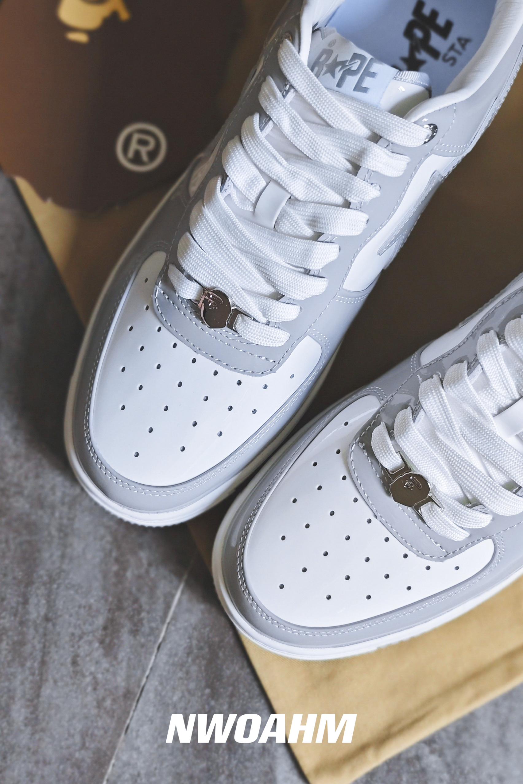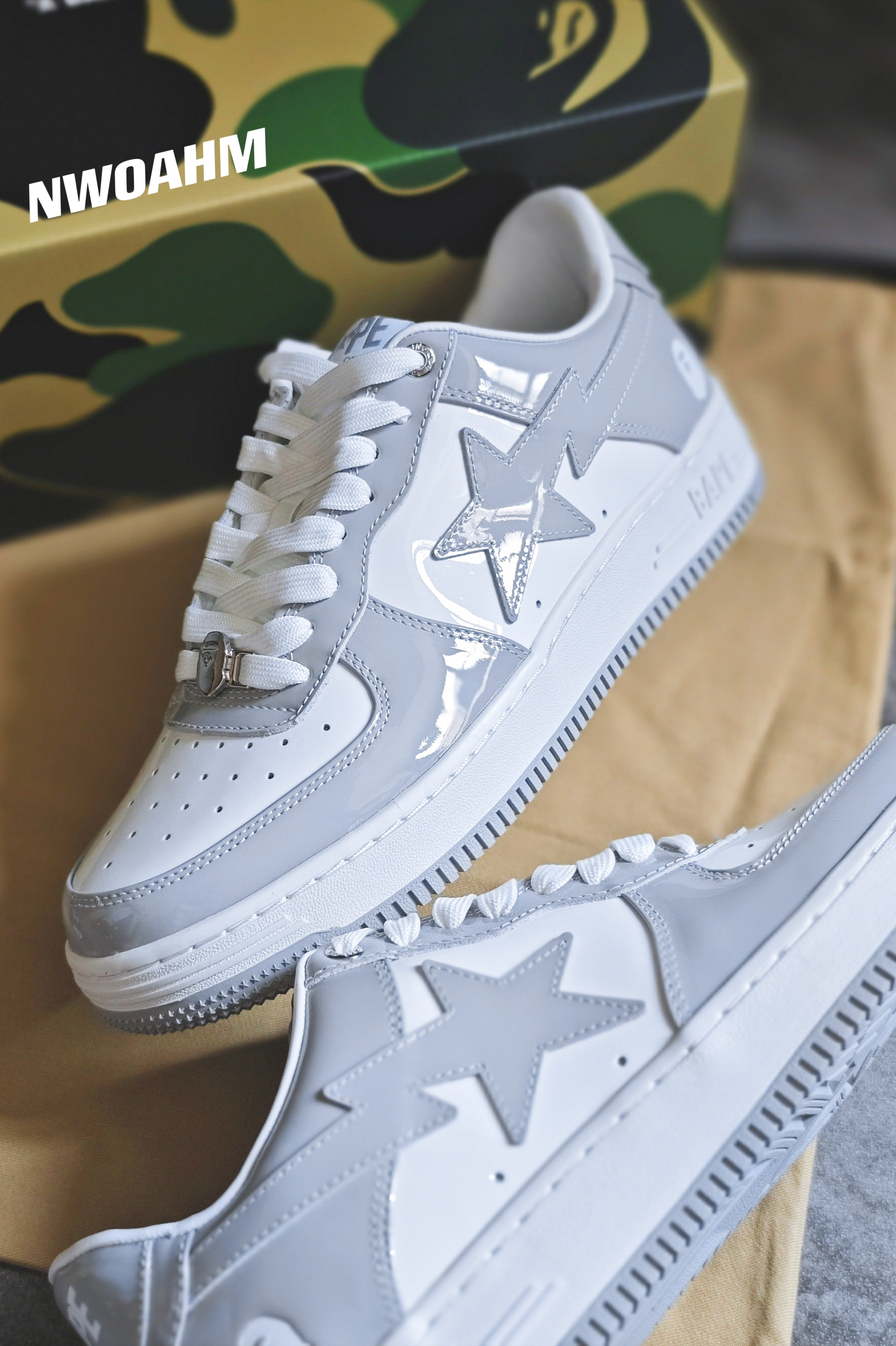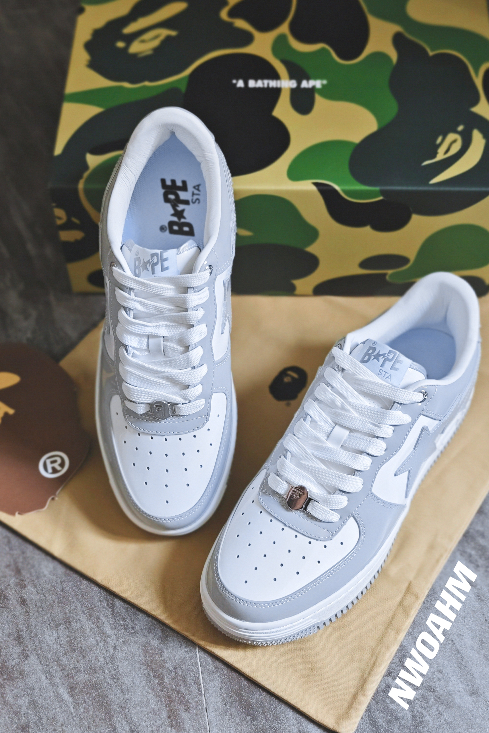 Bape的STA系列板鞋近年也是挺火,各种配色层出不穷,不过有些简单的配色还是耐看,例如黑白,白绿和这双灰白。❤️ 前几年的Dior联名AJ1将灰白这个配色带火,几乎每个鞋型都有好几个累似的灰白配色,也难怪,这个配色确实好看啊!🌚 这个STA板鞋跟空军十分相似,不过皮质和做工却要好很多,尤其漆皮的加成,整个高级感就出来了!男女适用,上脚百搭,回头率拉满! 尺码标准,正码入手即可。👀