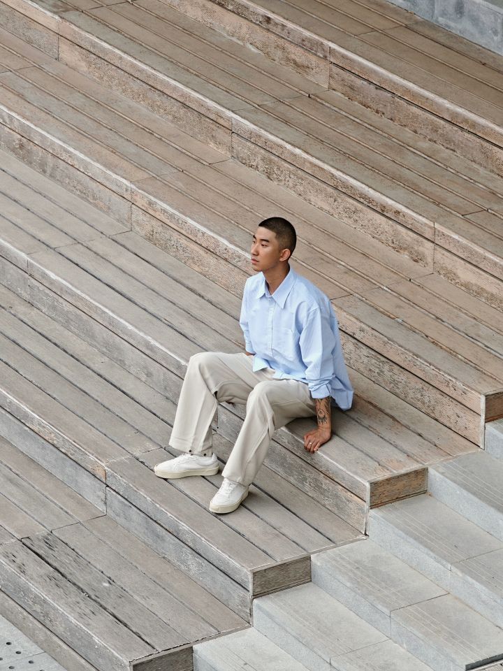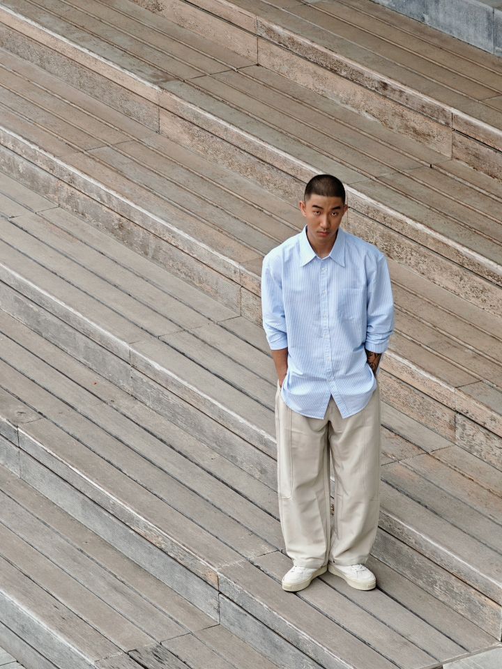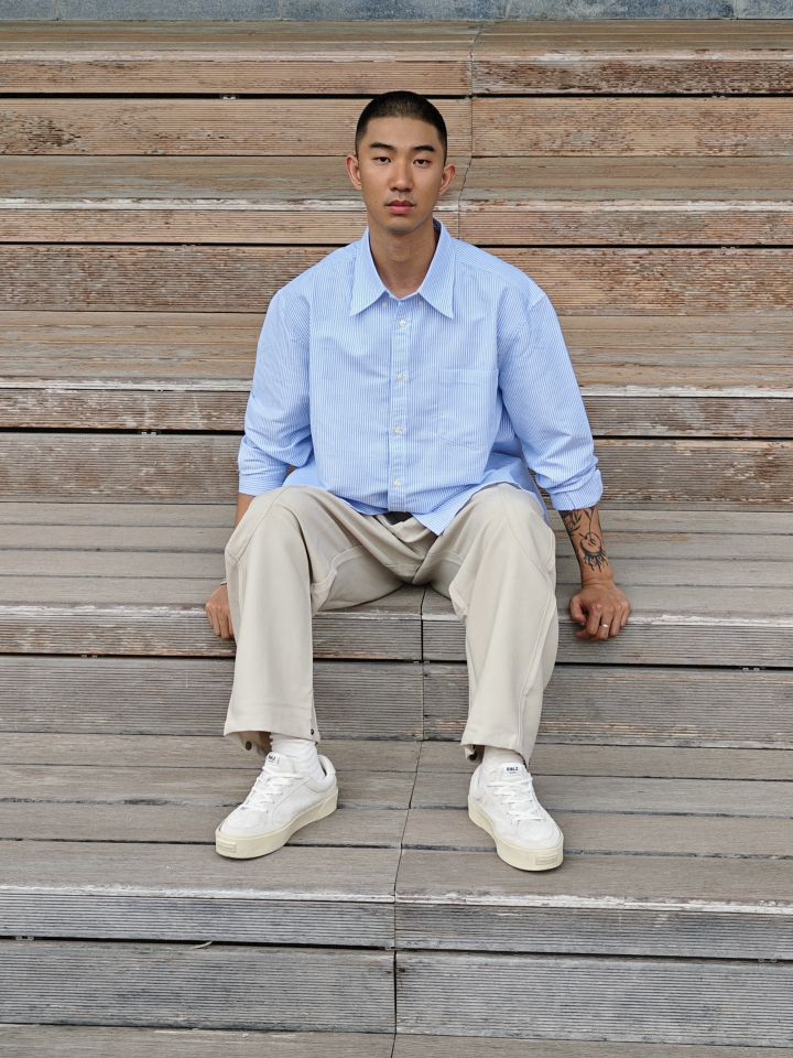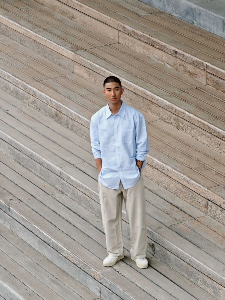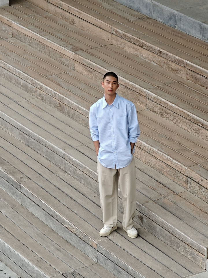 每个男生上班都需要感觉需要正装 其实休闲风更适合职场穿搭 也比较适合我们现在的群体 今天是蓝色衬衫+米色西裤+球鞋 超级舒服也适合通勤呢 而且很显高级感 👔:AWALKER 21AW 👖:MF工作室