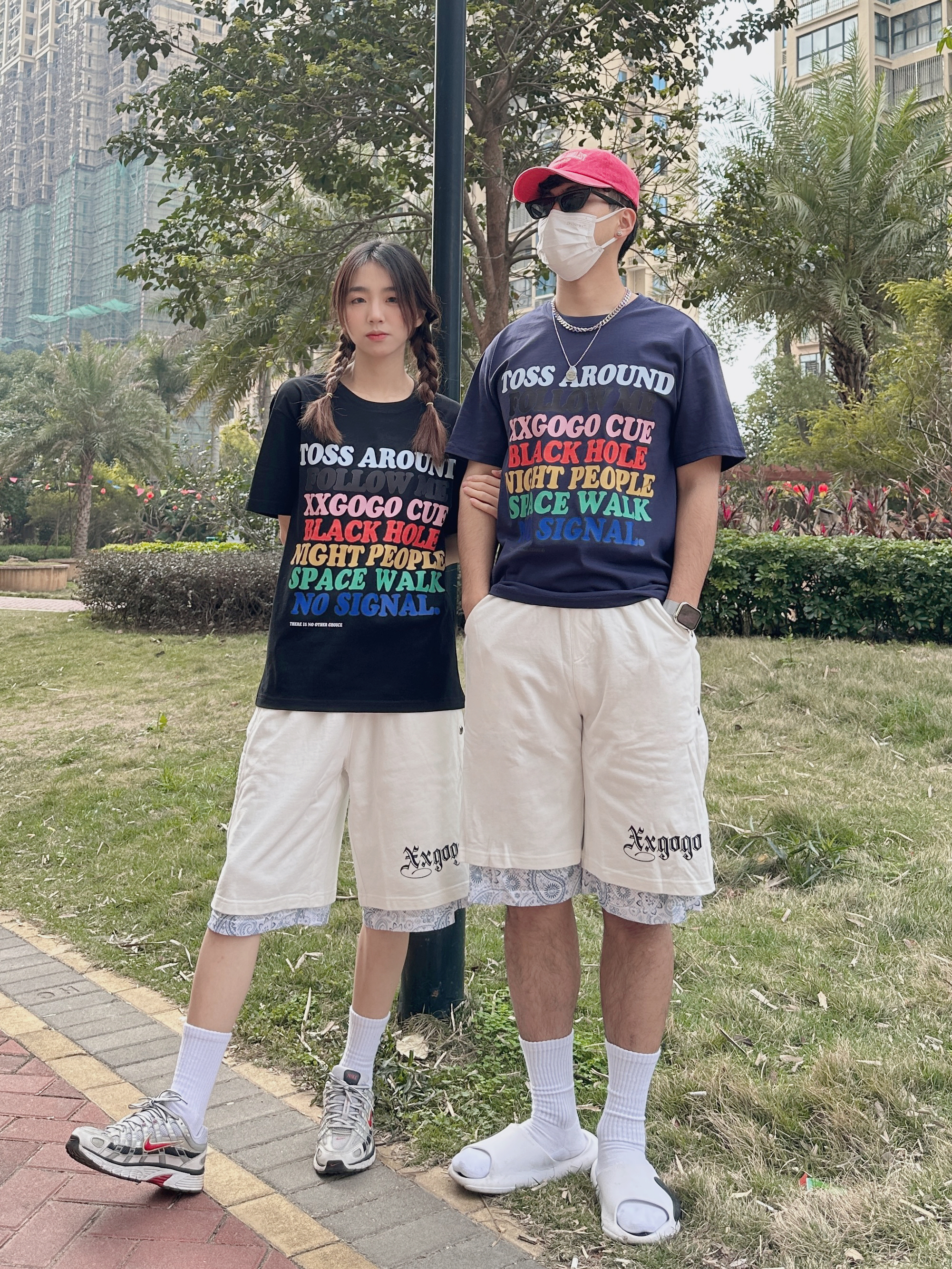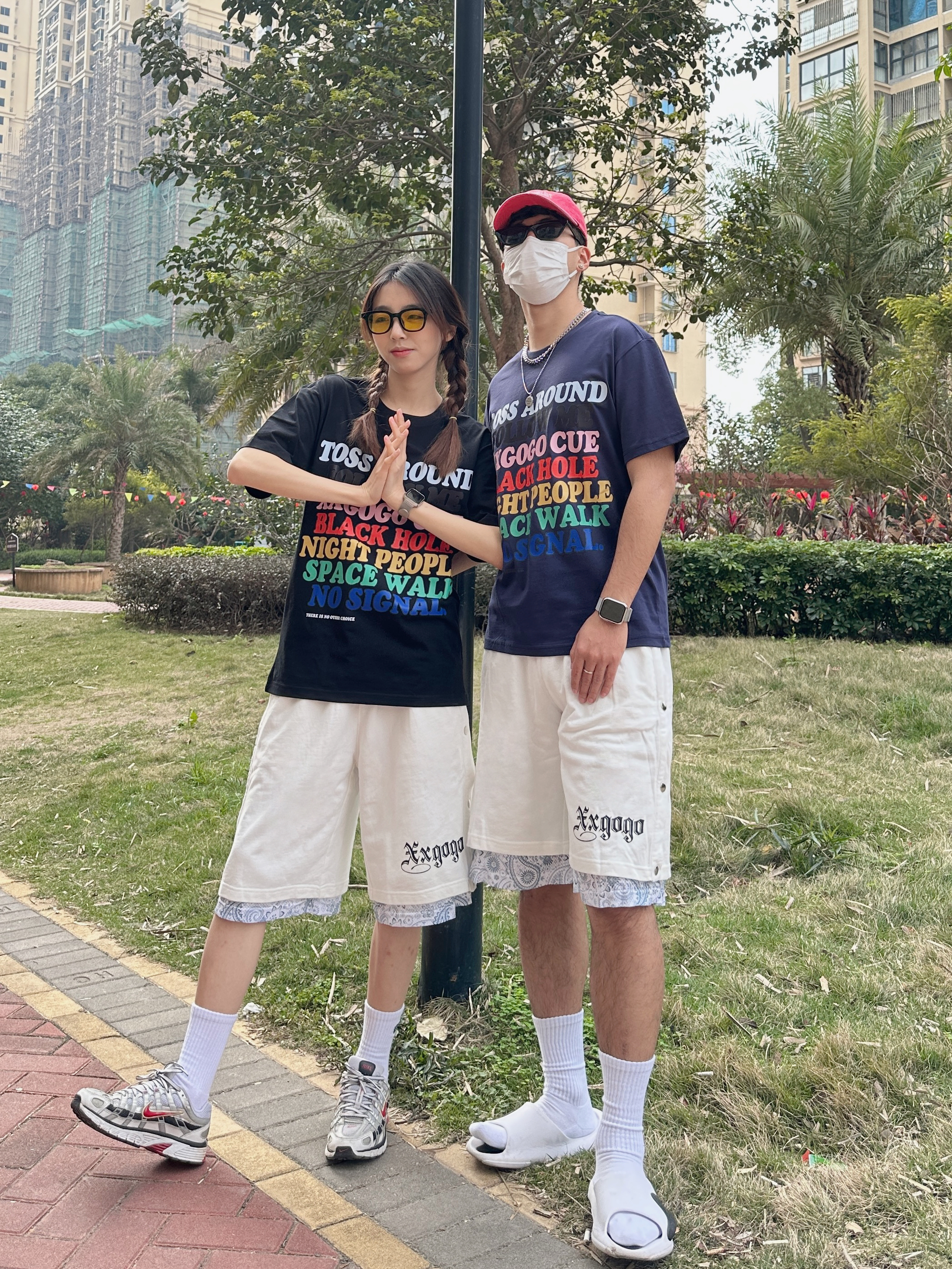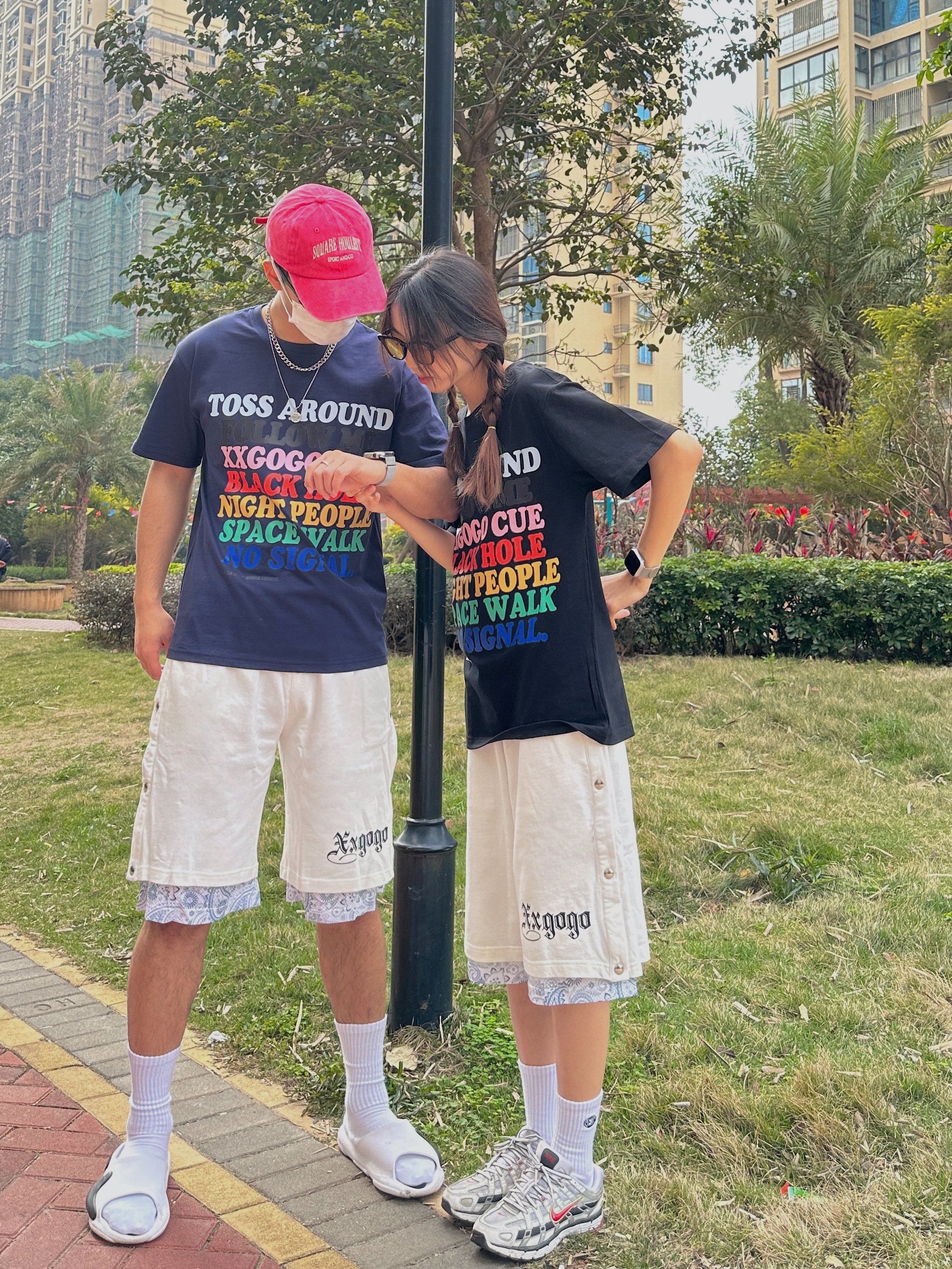 欢迎来到小铭宗宗情侣穿搭频道📺 👧:168/44 穿M 👦:182/70 穿L 春夏就很喜欢穿有色彩的衣服~ 把7种颜色的印花穿在身上还挺特别🎨 再搭配白色运动短裤🩳 拼接的腰果花有点意思 这不就是夏日的穿搭公式嘛 👻👻 男生可以搭配篮球拖鞋🩴➕白袜 女生可以搭配复古运动鞋👟 一整套有色彩 活力满满的穿搭I get !!!