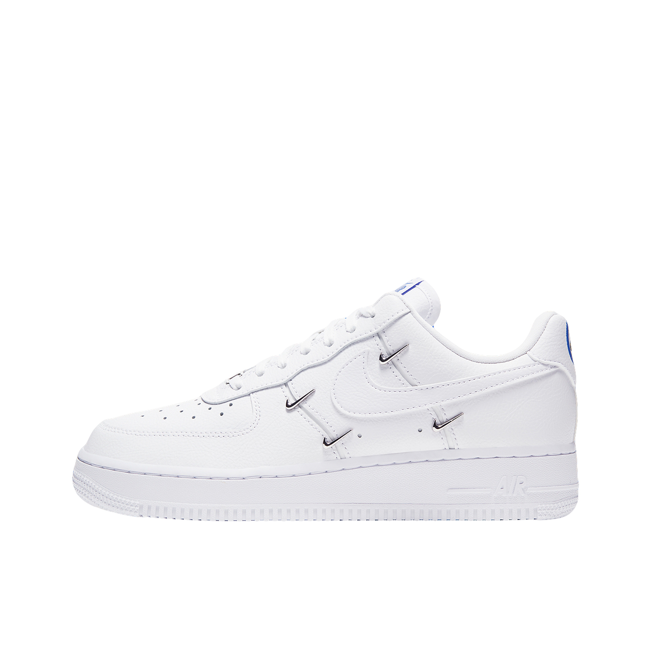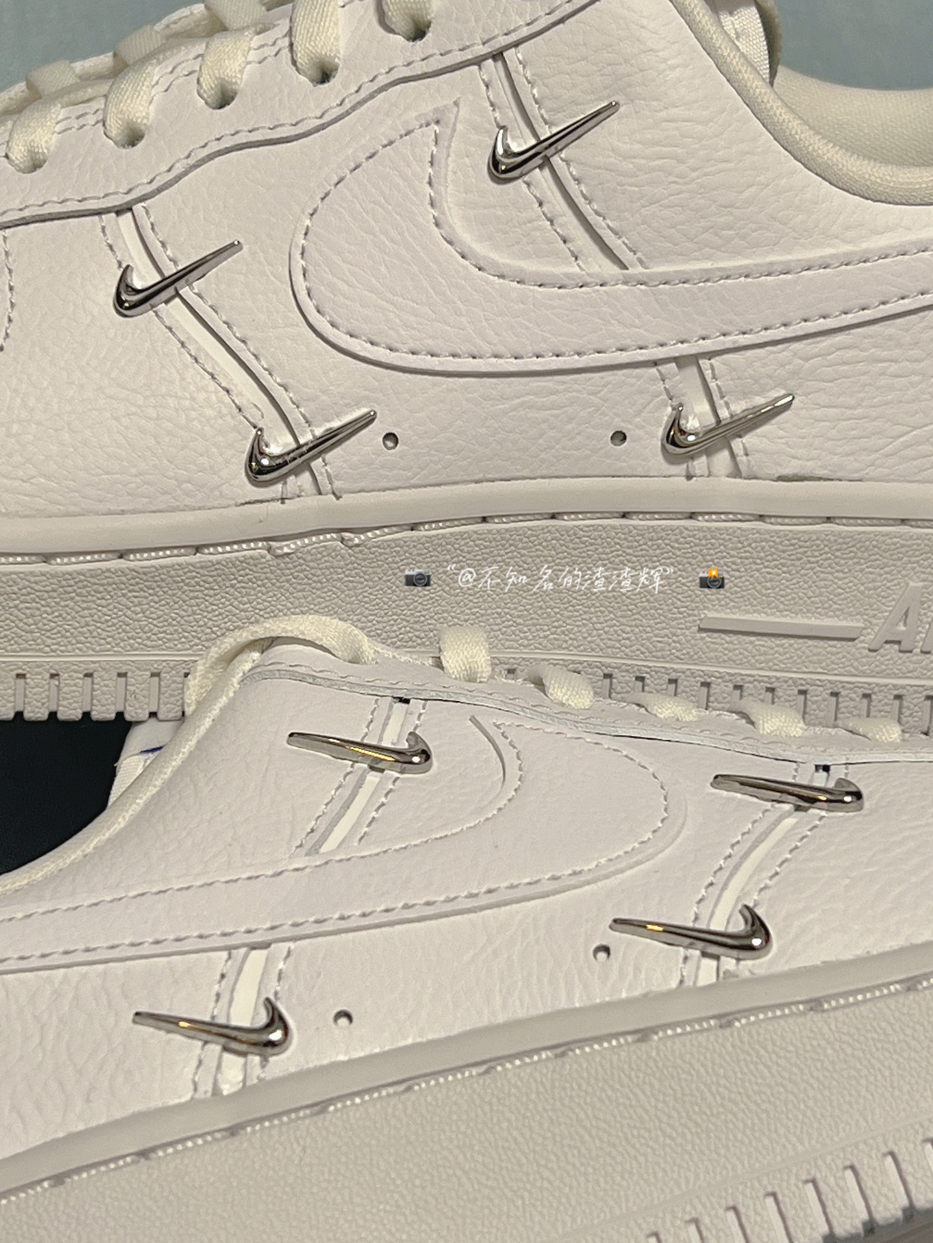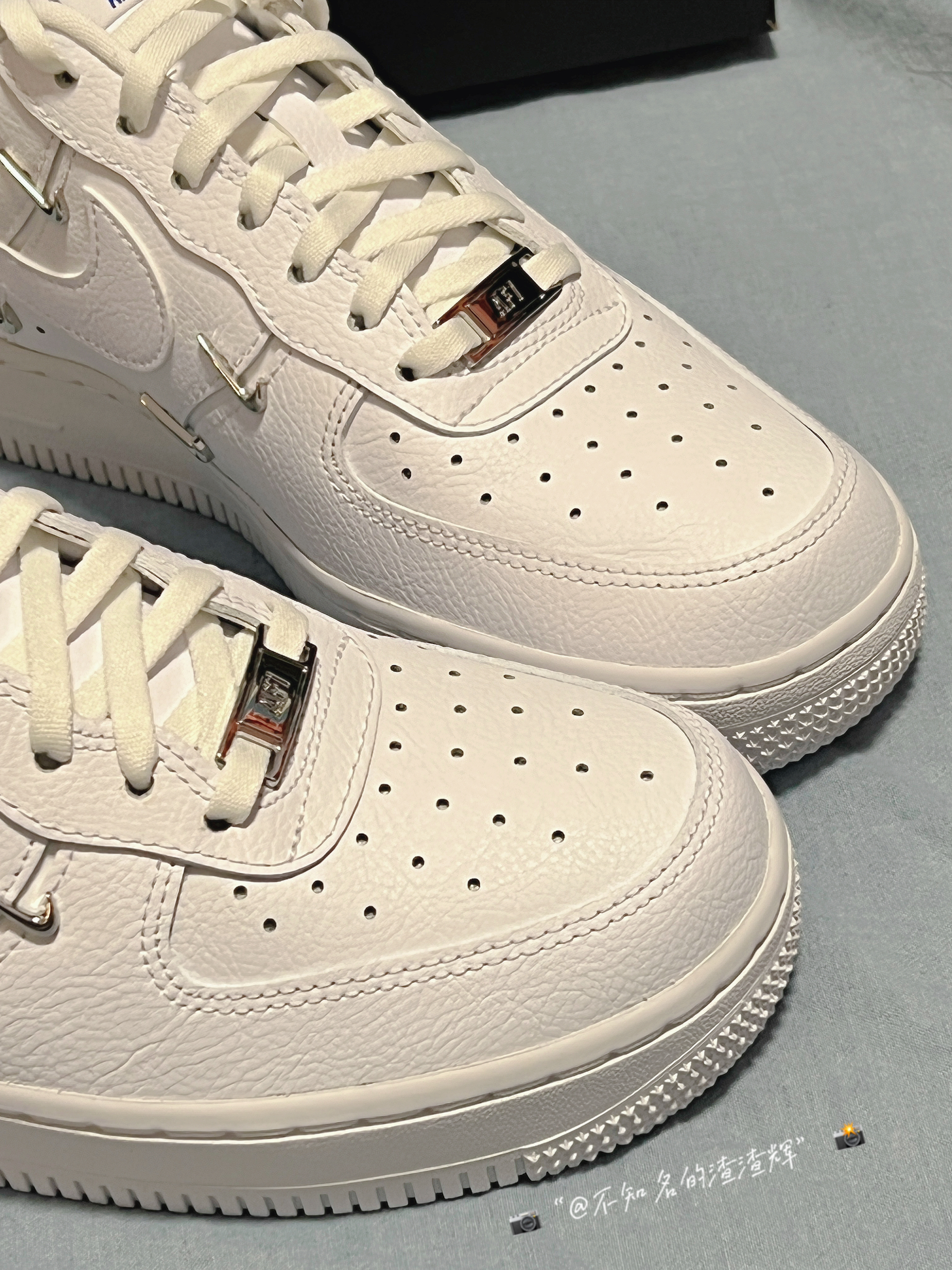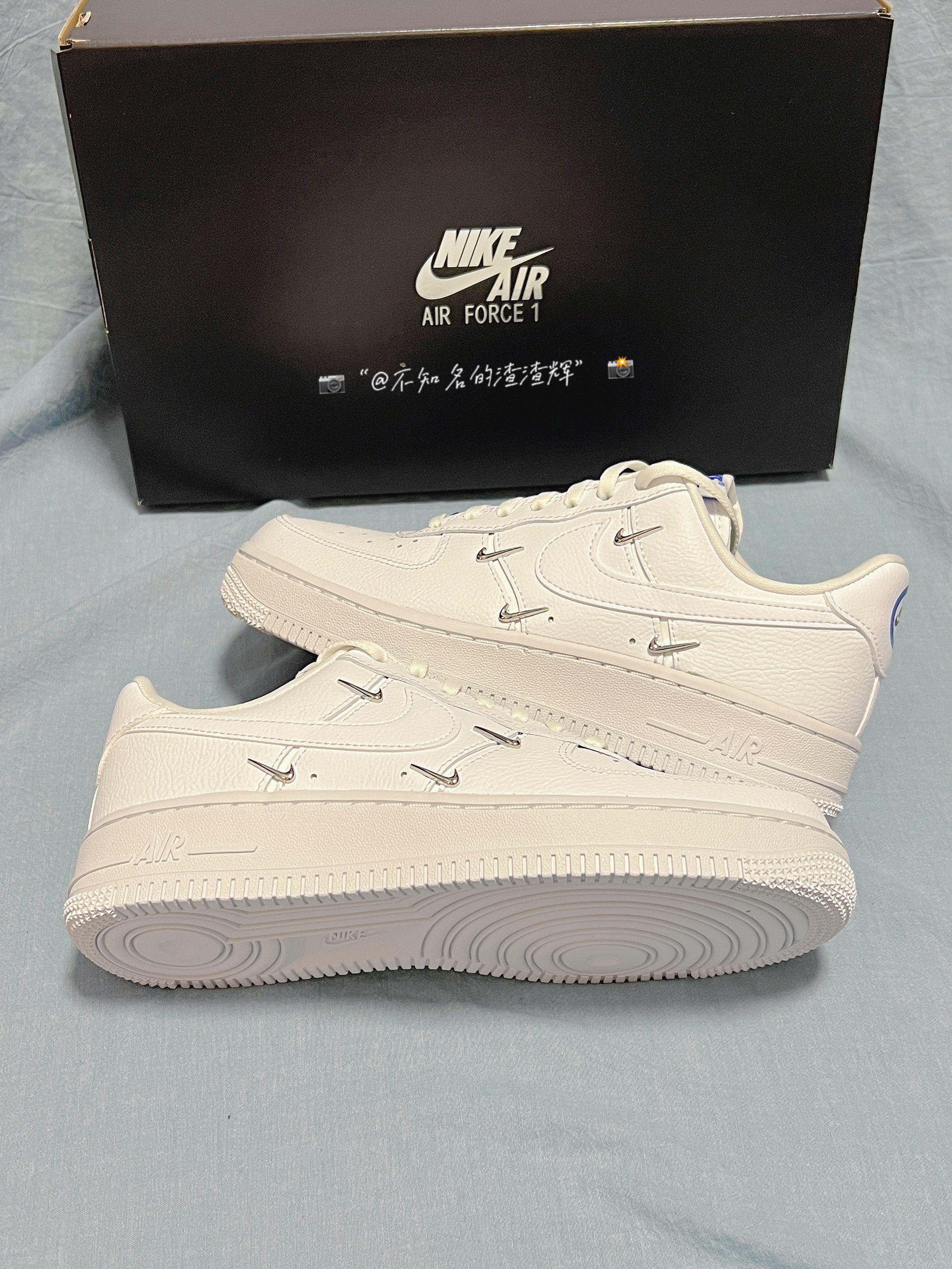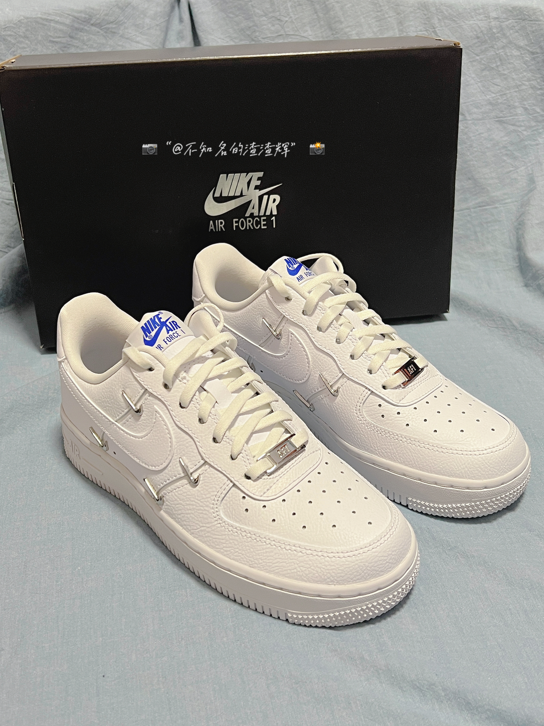 🌟:Nike Air Force 1 Low o7 Lx“Chrome Luxe”四钩纯色 防滑 低帮板鞋 女款白蓝 🌟:这双鞋子整体以白色为主色调,鞋身的四个小钩子也是这双鞋子最大的亮点,鞋舌、后跟都有着蓝色Nike字样,鞋子采用优质皮革材质,质感舒适,中底Air Sole气垫为鞋子带来良好脚感 🌟:超级适合小姐姐穿的宝藏鞋,好搭衣服,脚感也很不错,回头率超高 🌟:尺码推荐:建议买小半码