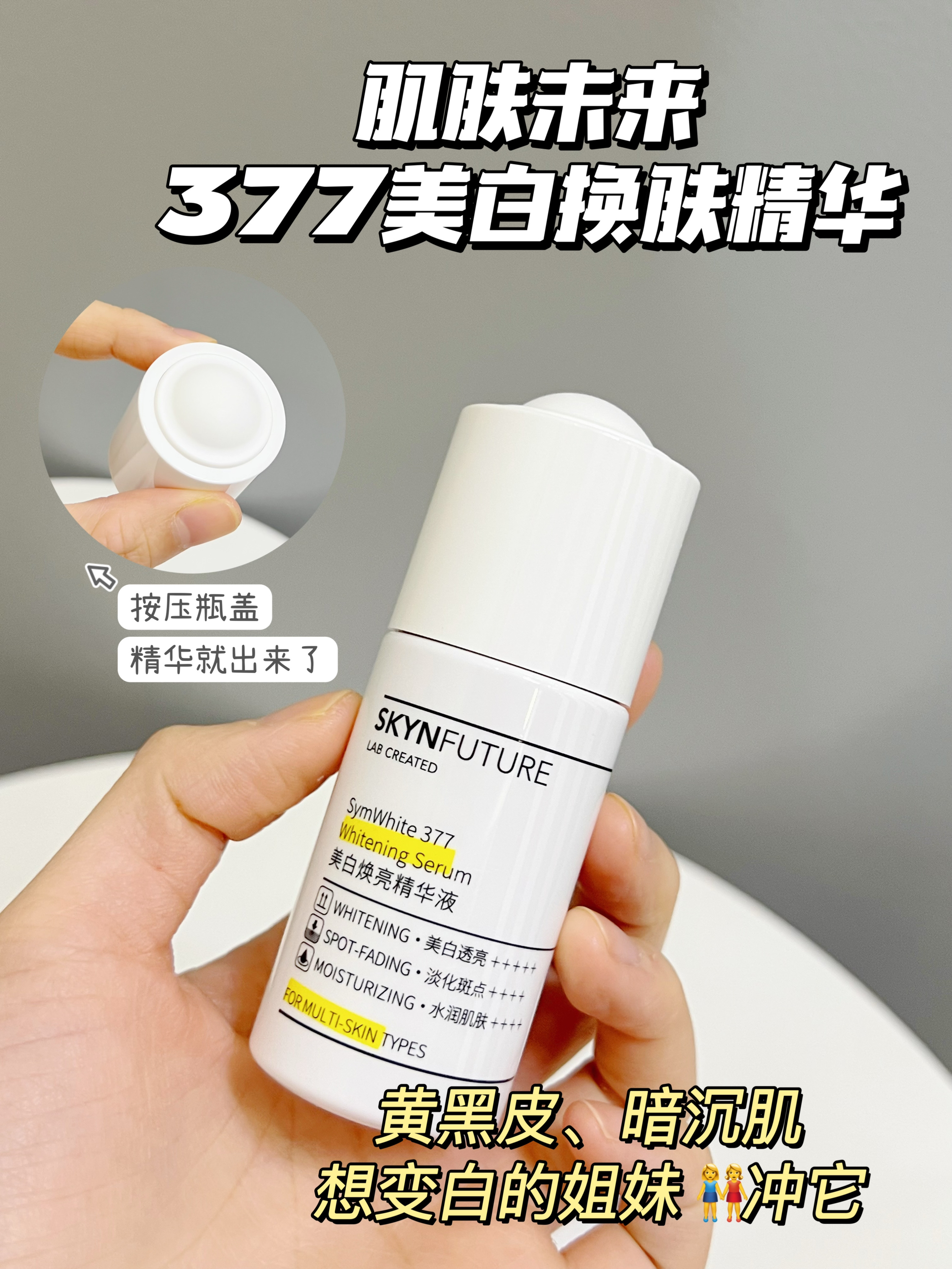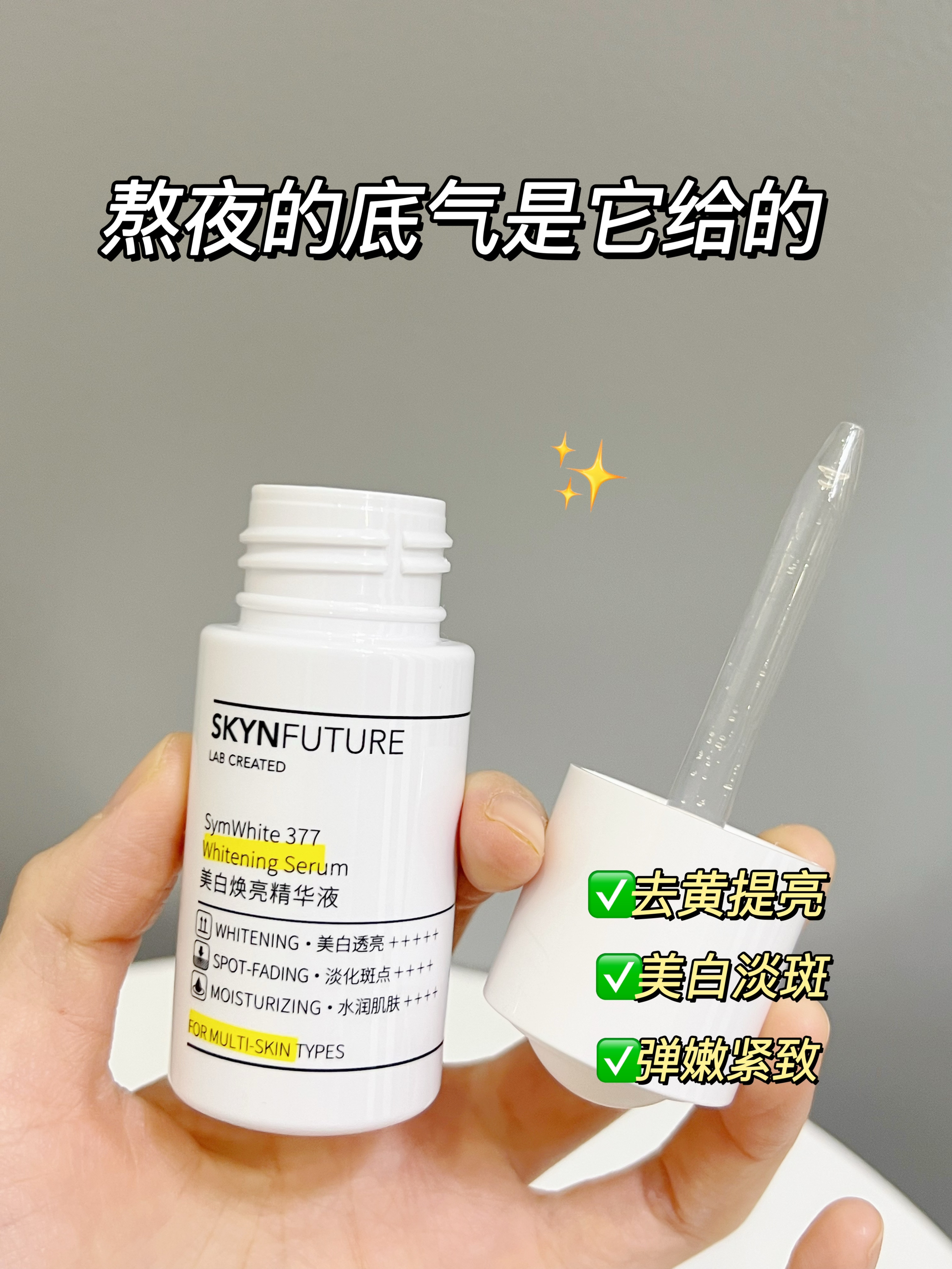 天生黄黑皮!加上我经常熬夜 皮肤蜡黄蜡黄的 看着就像营养不良似的😅 每次一看到别人皮肤白皙透亮 可把我羡慕坏了😭 美白一直以来都我的终极目标! 马上夏天了 我自己可得努力一把 争取和闺蜜一起出去玩卷S她们! 也试过不少的美白产品了 肌肤未来的377美白焕亮精华一直是我的心头爱 这玩意是真能美白啊! 坚持用了一段时间 皮肤白嫩又透亮 看了下成分🔍它是真敢用料啊! ✅0.5%的symwhite377 ...