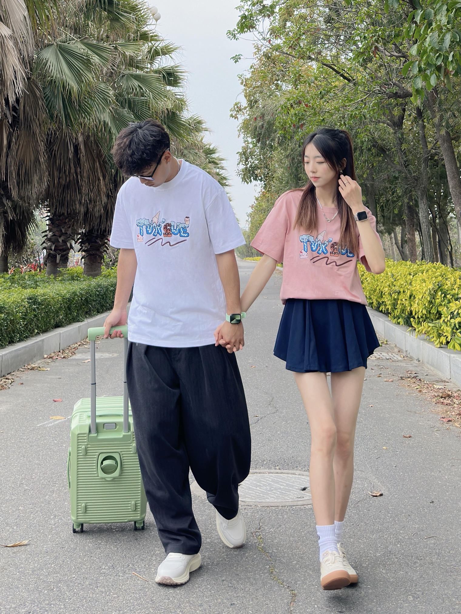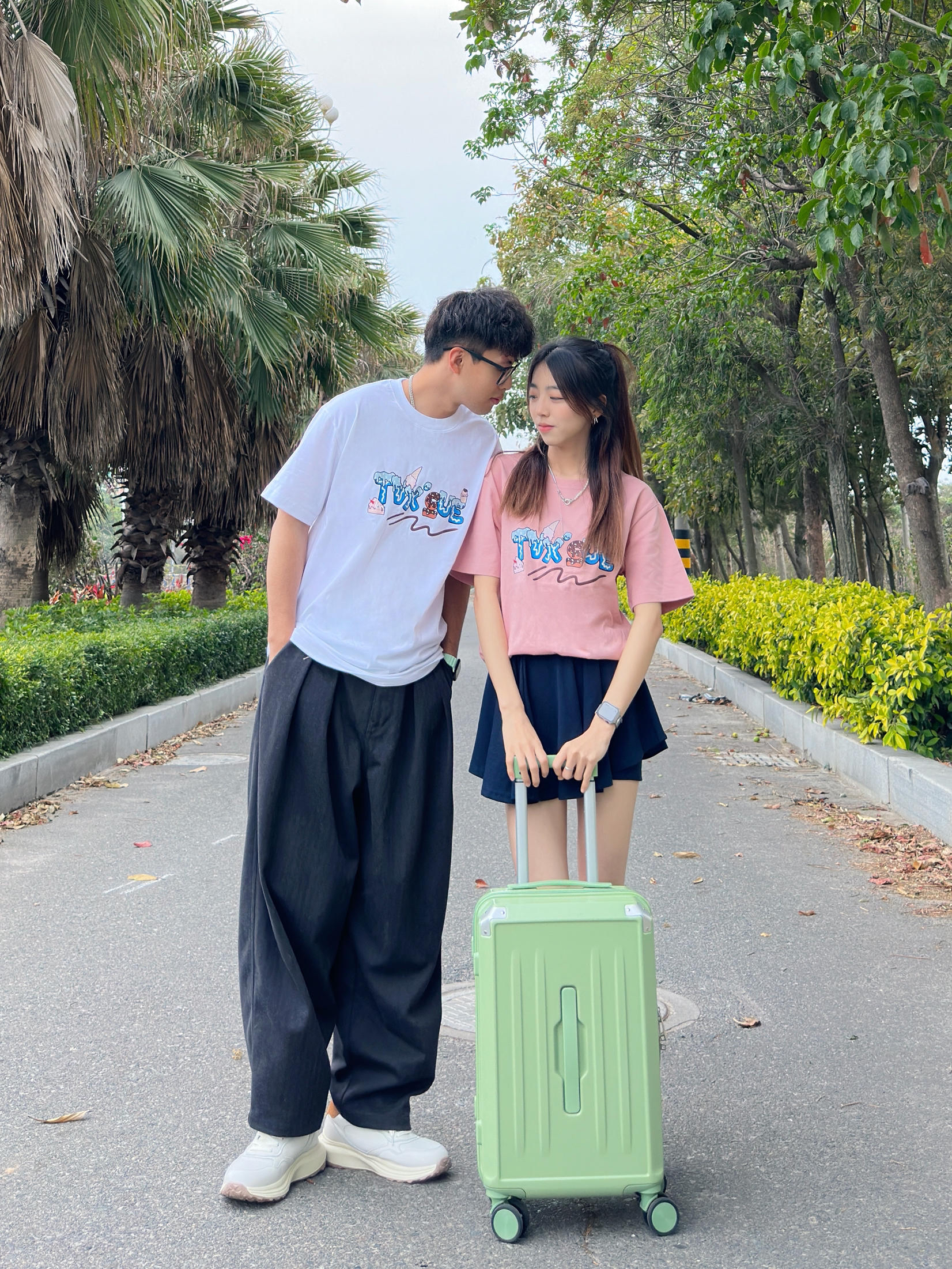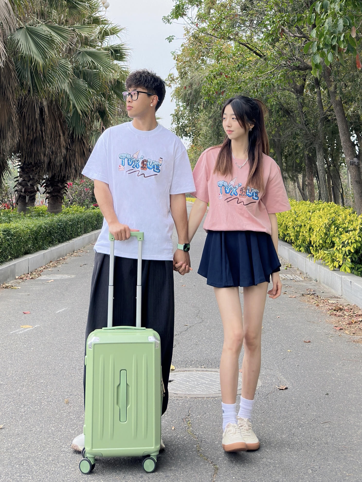 哈喽~小铭宗宗版夏日穿搭来咯~ 👧:168/44 m 👦:182/70 xl 白粉调调的情侣短袖!太适合清爽的夏天啦! 穿上就感觉很有爱呀,而且质地也很舒适~ 搭配🥑牛油果行李箱,出门旅行吸睛搭配✌️ 💡更重要的是,牛油果行李箱带有一个专属use口,不用再为充电问题烦恼啦! 👍还有超级贴心的装水杯的架子,随时想喝水直接拿起来就行啦!
