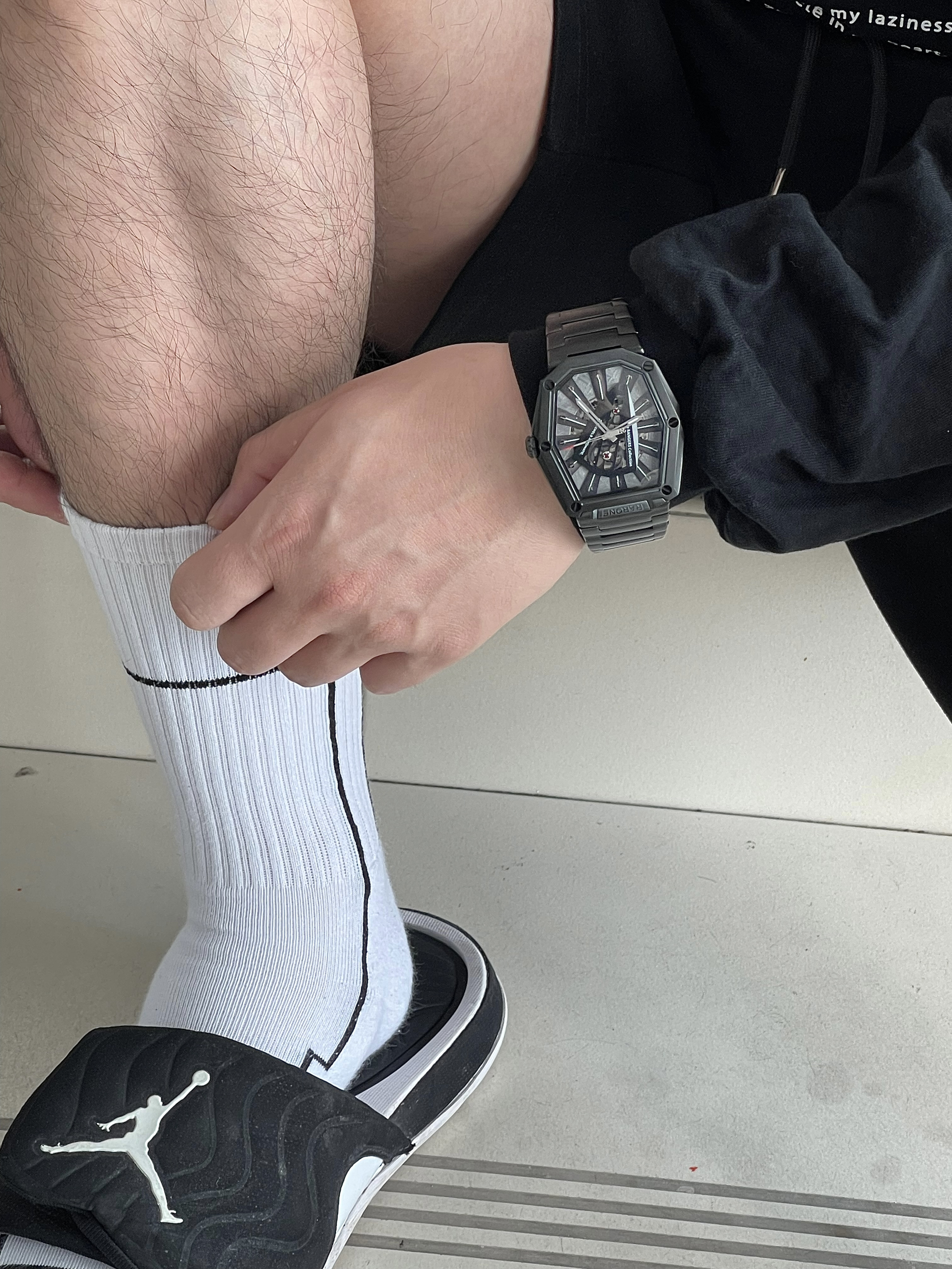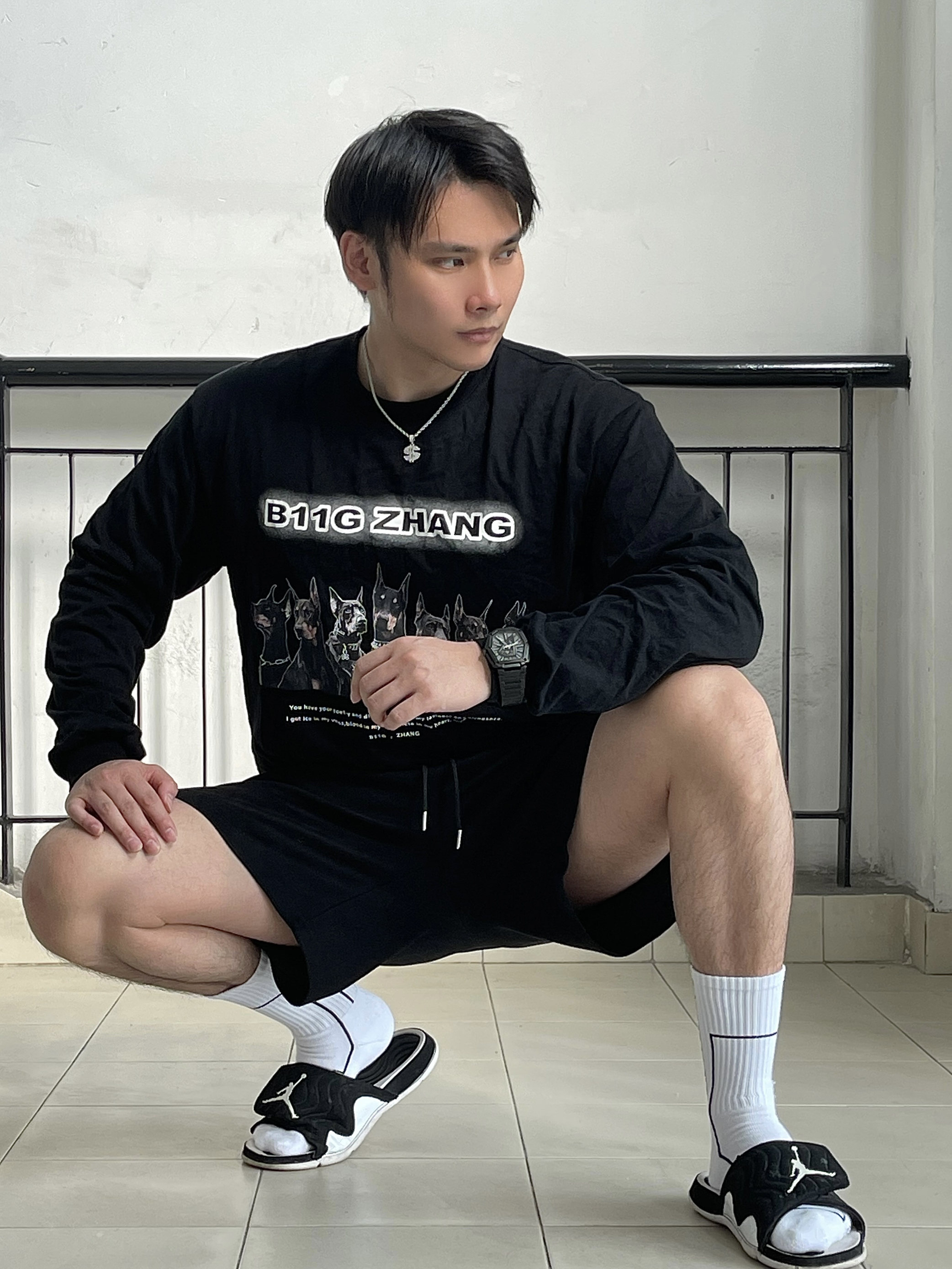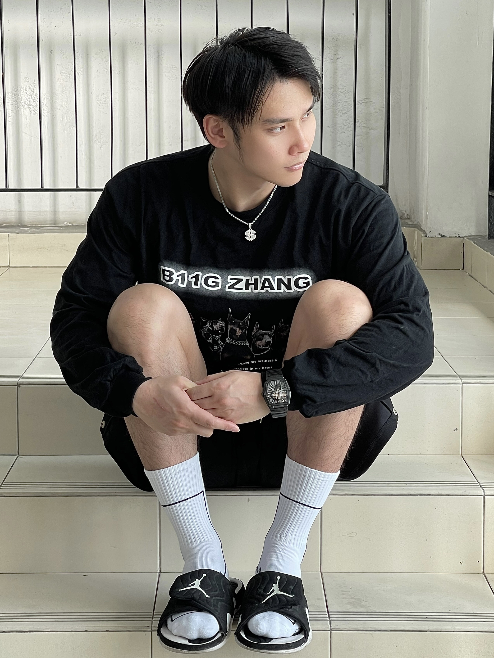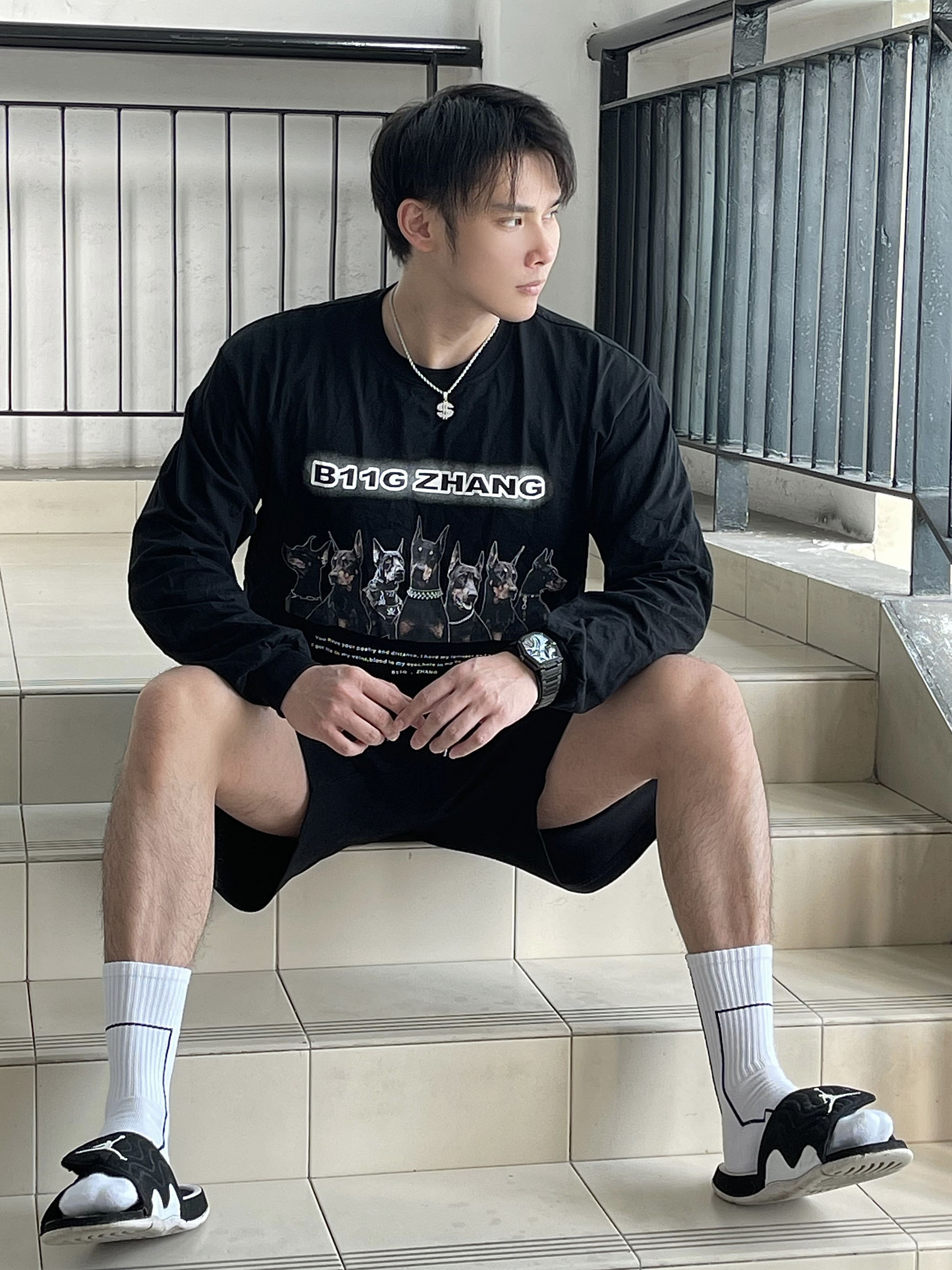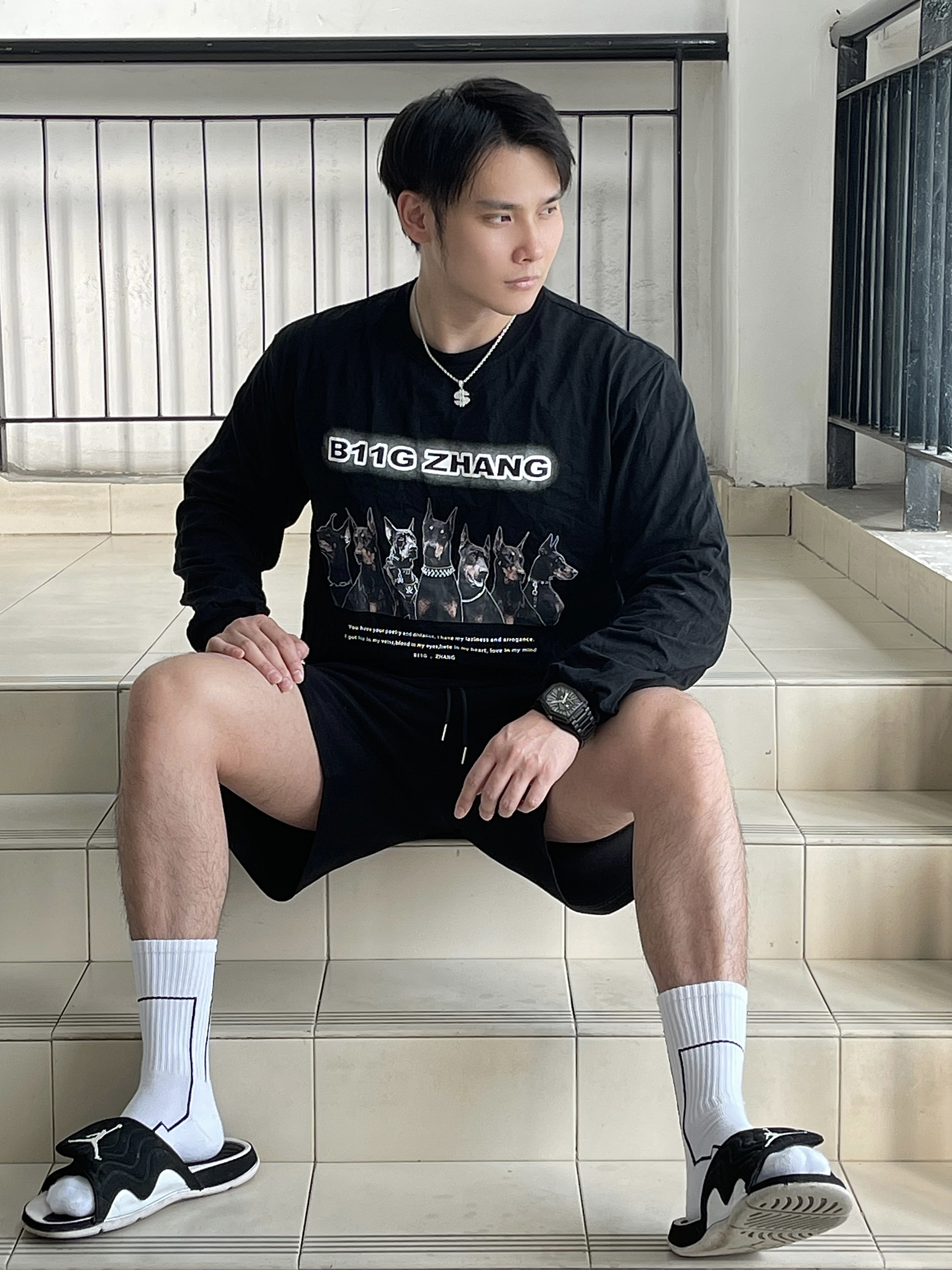 广州的春天,真的挺热的 短袖短裤真的已经可以安排上了 但昼夜温差大,穿上长袖短裤便能舒服一整天 这次,我还是选择黑白的搭配♨️ ➡️👕上身搭配b11g zhang家的重磅狗头印花长袖 ➡️🩳下身是SRME黑色短裤 ➡️🧦SRME白色机能长袜 ➡️👟搭配的是AJ拖鞋 ➡️⌚手表选择RARONE雷诺表 镭骑士(我最近太喜欢的一款机械表) ➡️⛓项链选的是RAWNESS$符号项链 我身高185 体重...