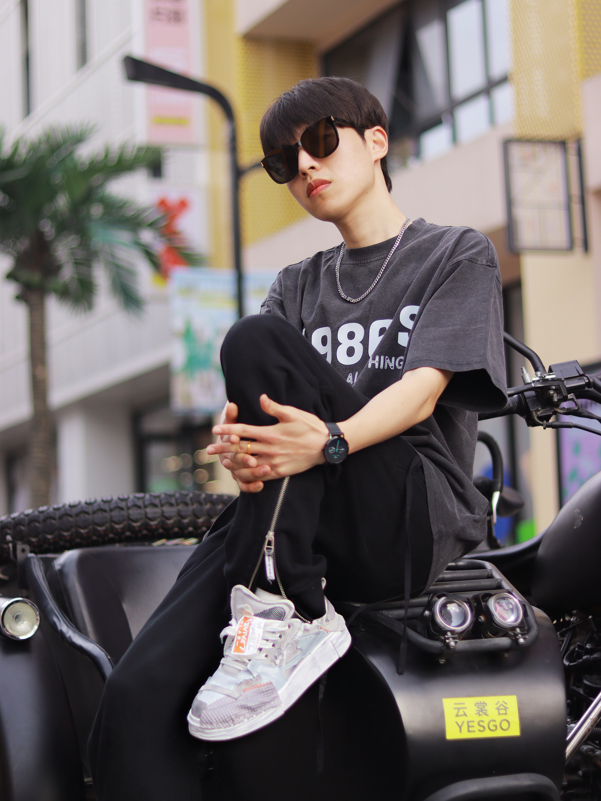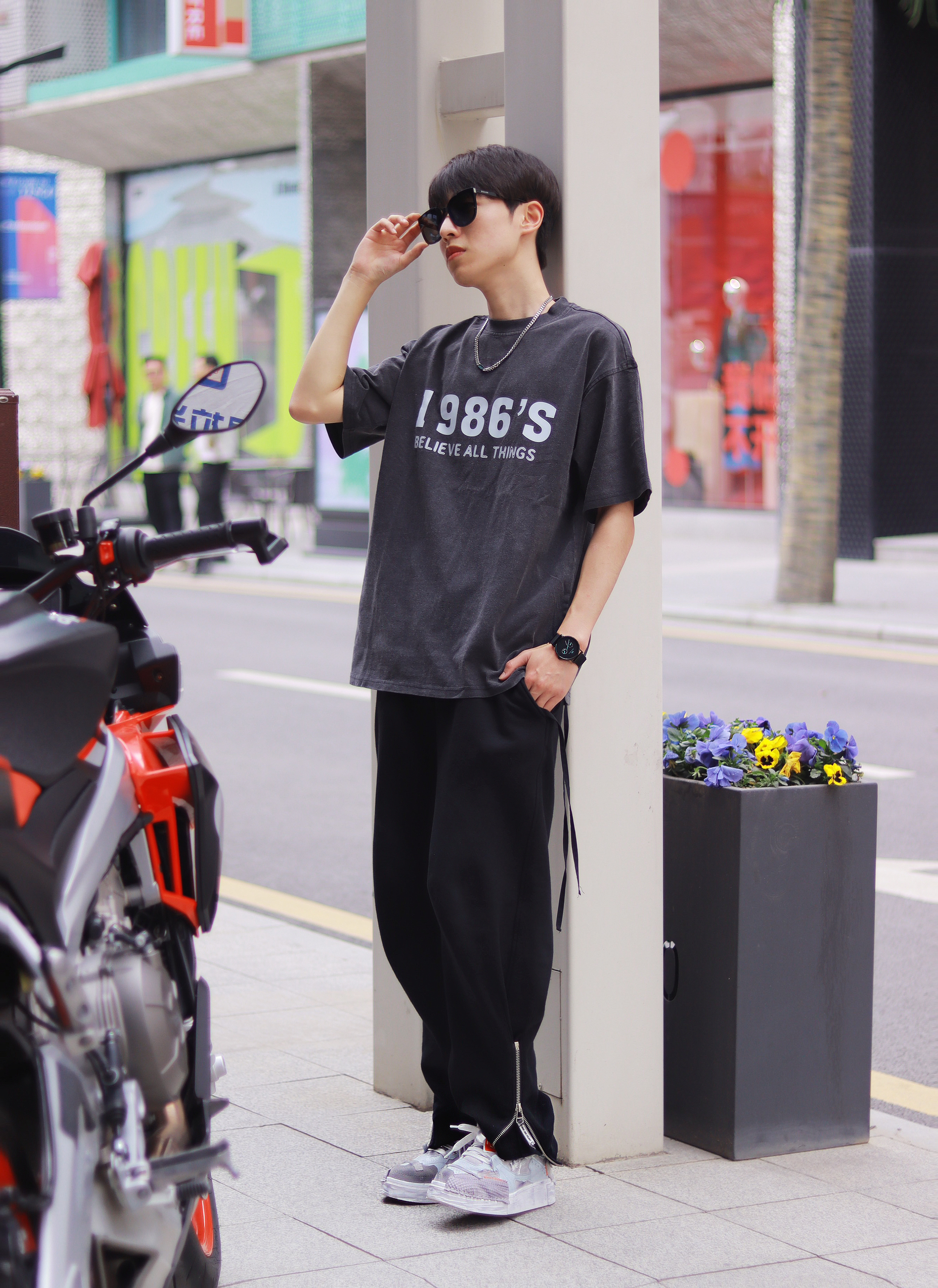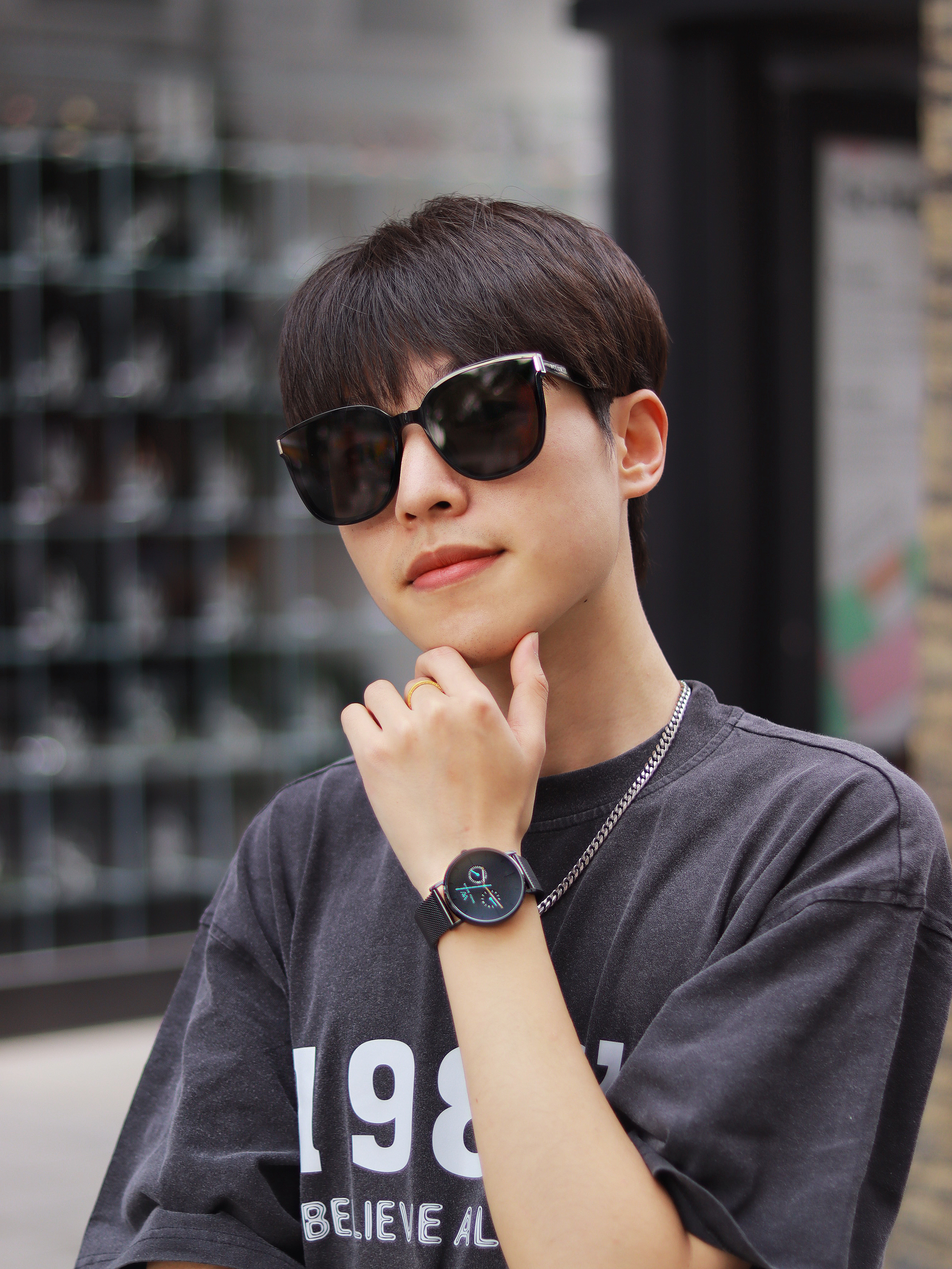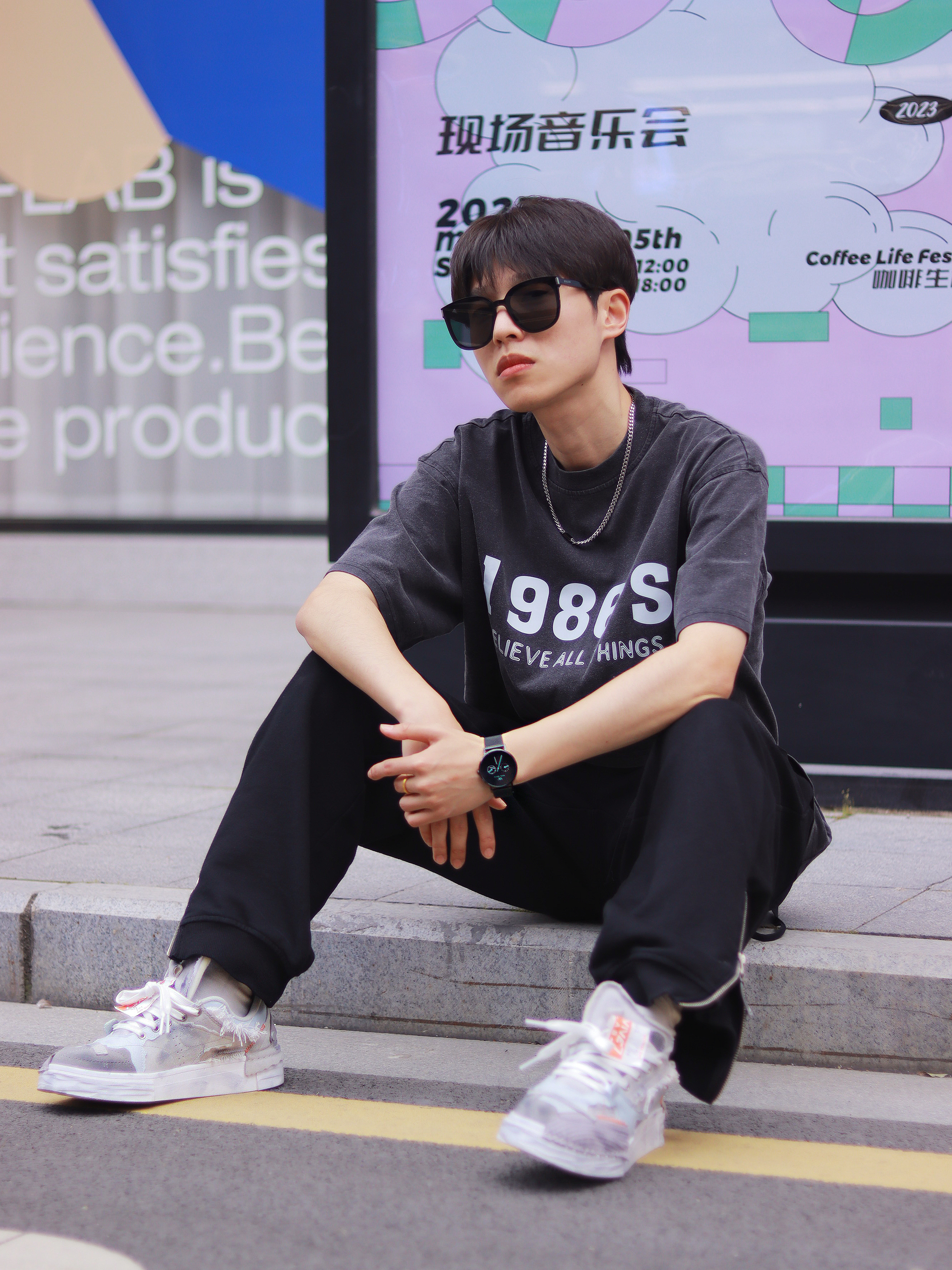 这种基础款混搭真的就是为男高两声定做的好吗? 简约T恤搭配休闲长裤清爽十足!解构风的灰色鞋子是它的运动时尚源泉,拼接撞色的鞋面设计个性感很浓郁,加上防滑耐磨的大底和解构风元素的融合,真的承包我出街的时尚感了! - 个性的潮流腕表是日常搭配的灵魂。 极简风的表盘设计很有未来科技感,配上logo和纯色精钢编织表带,日常搭配的适配度超高的! - 最后就是我新入手的墨镜啦! 新款墨镜框架超大的,用的还是板...