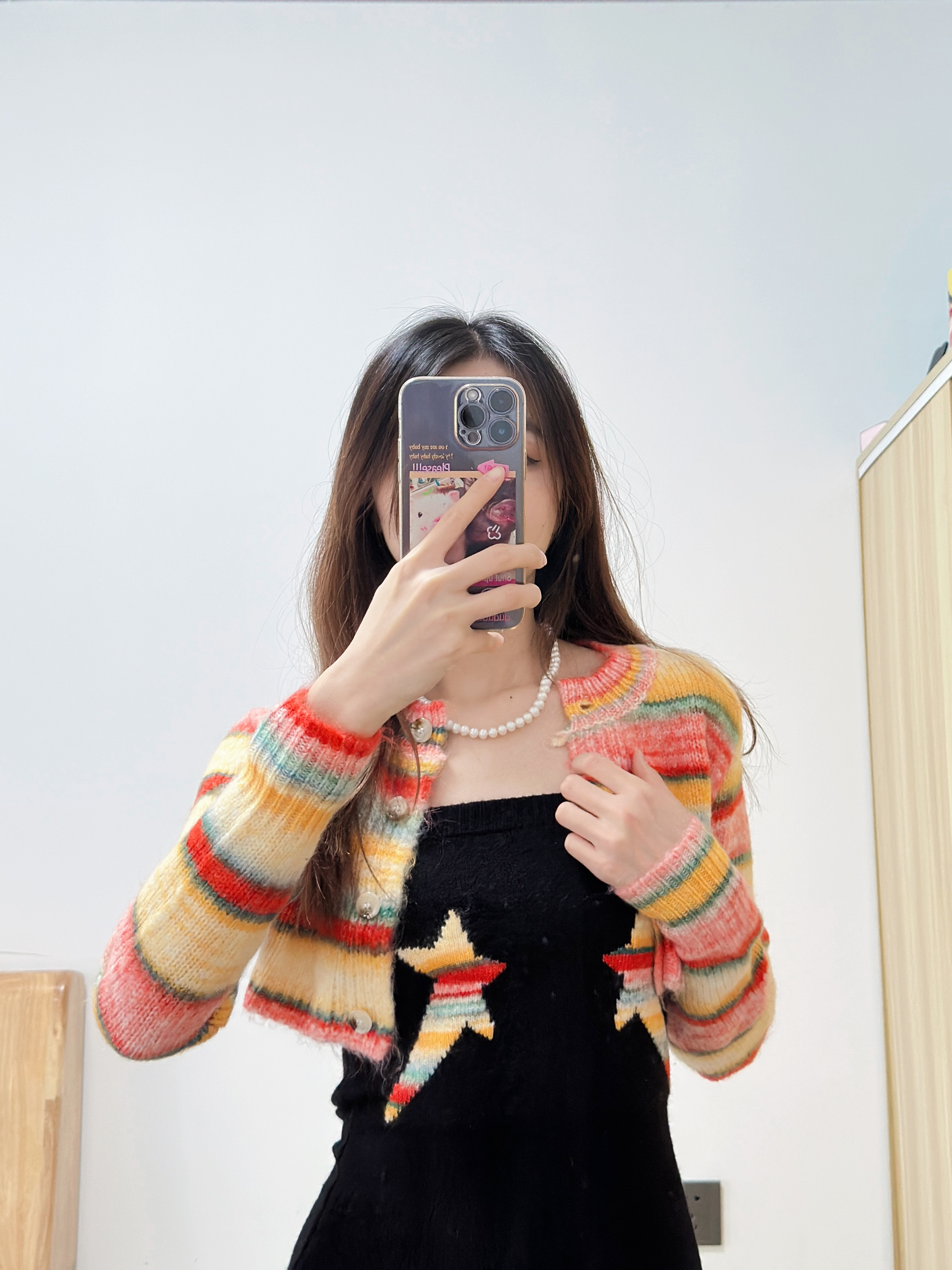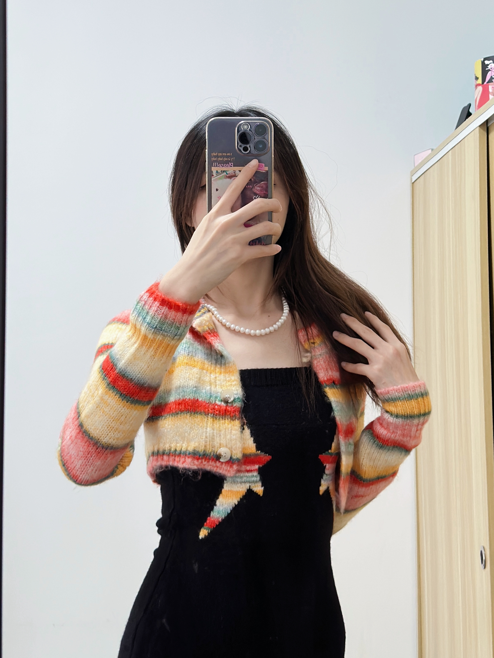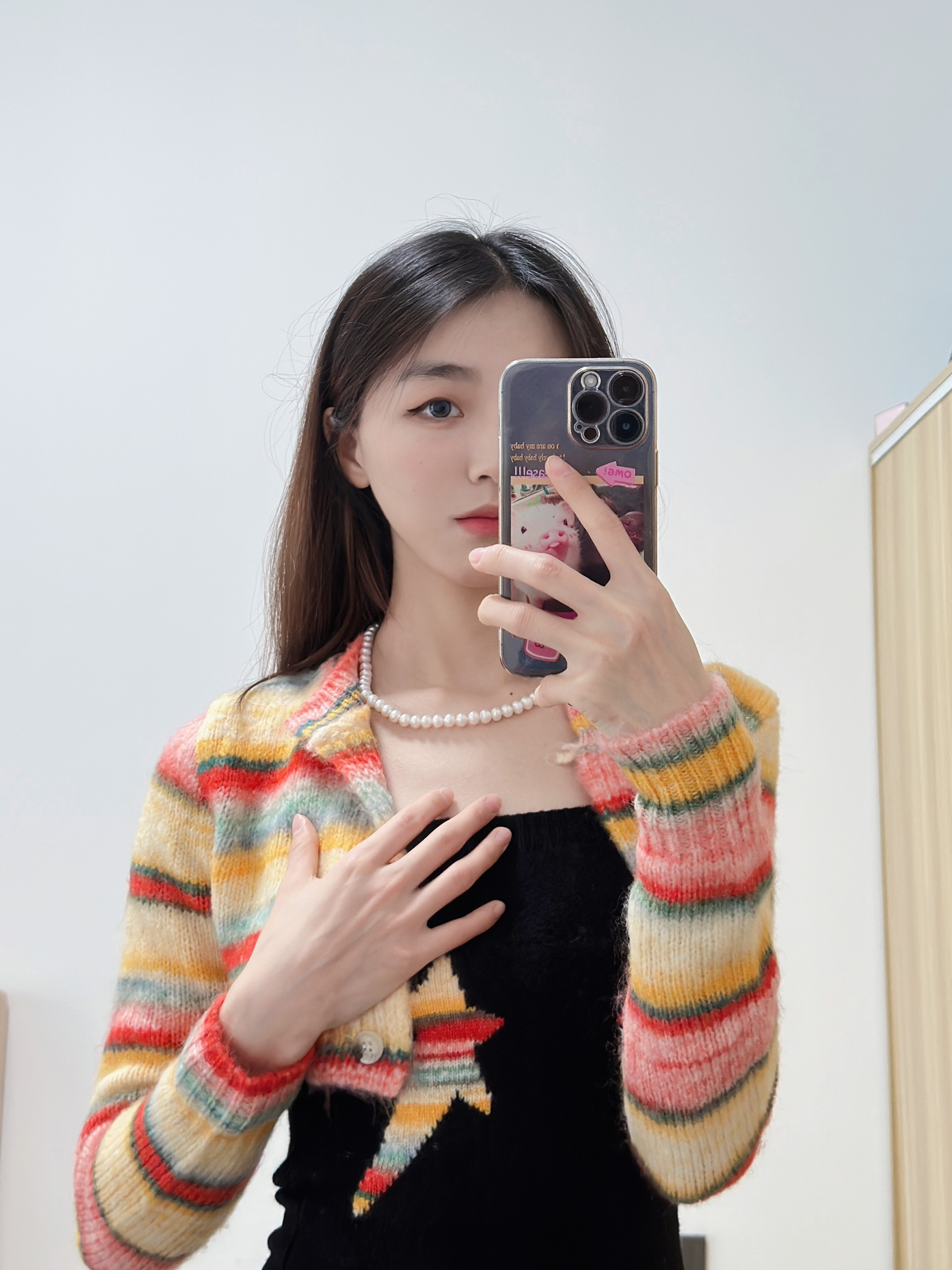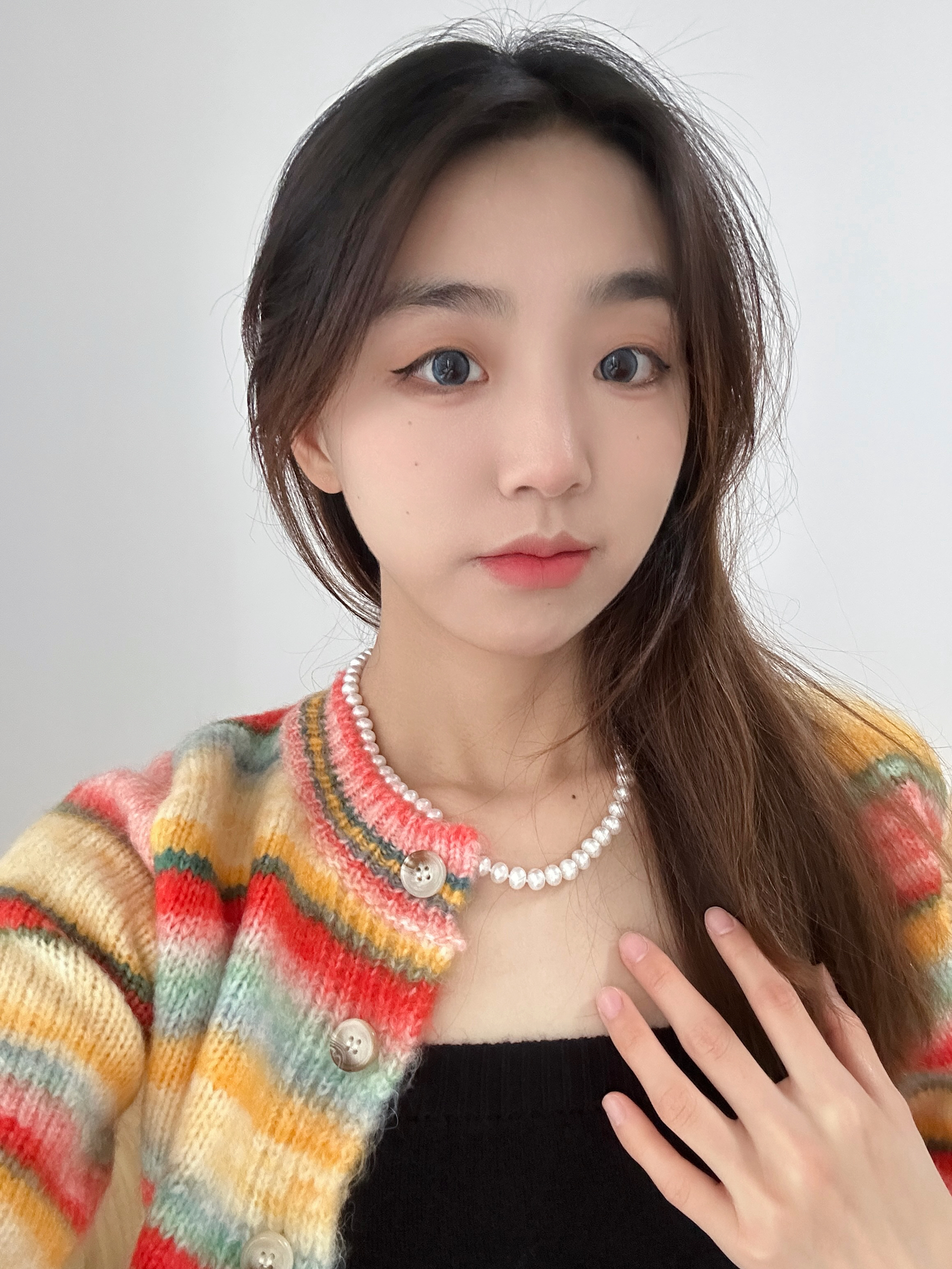 今日份的好物分享来喽~ 今天穿了一件彩虹开衫在搭配内搭黑色的有点韩系的感觉✨ 在搭配上简约的珍珠项链一秒提升穿搭高级感,让人无法忽视的美在✨ 让人一眼就沦陷的珍珠项链,温柔又有气质✨