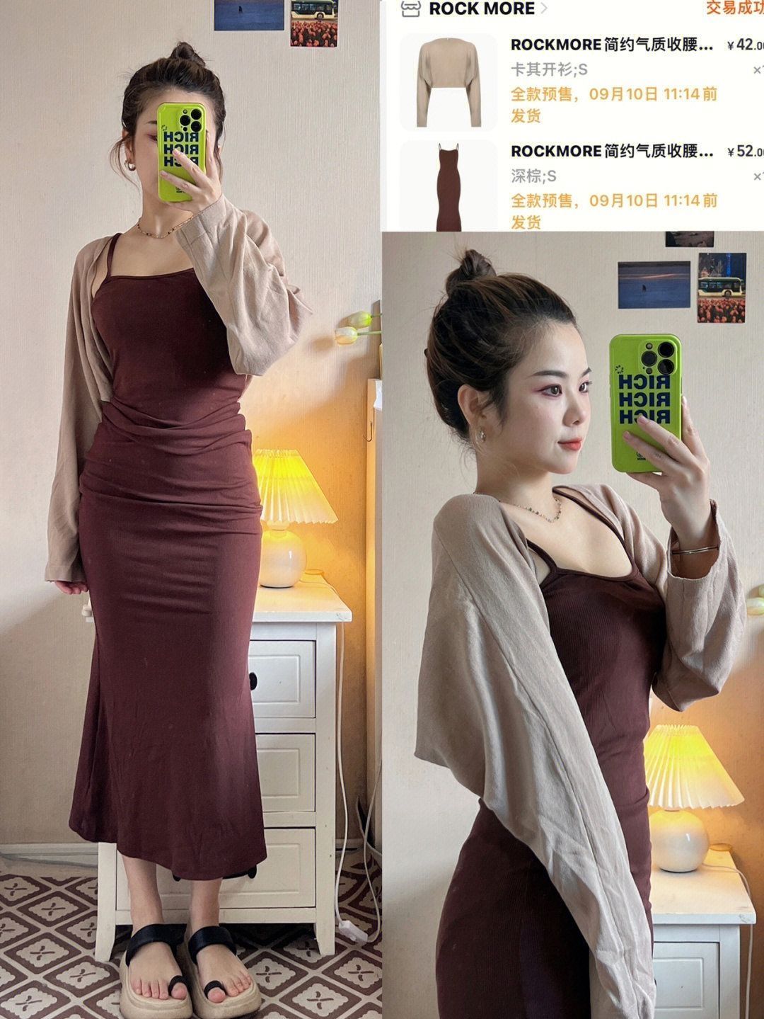 有一说一 这种裙子真的好显身材 好好看! 杏色偏浅 不太显瘦但是意外得好看 有种肉感美女的感觉~
