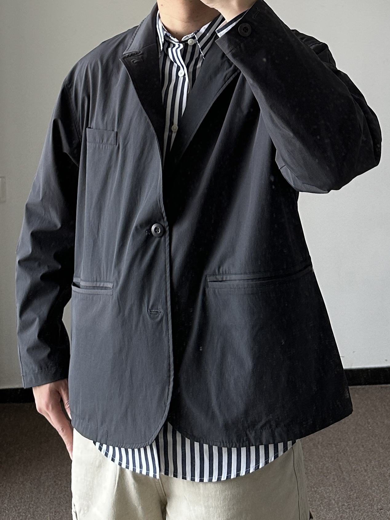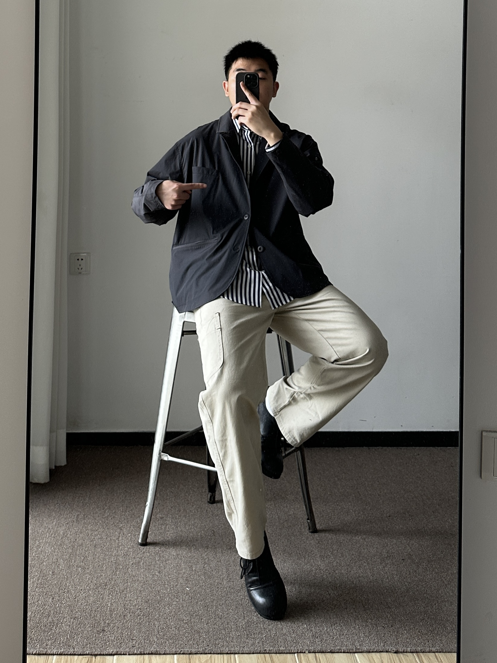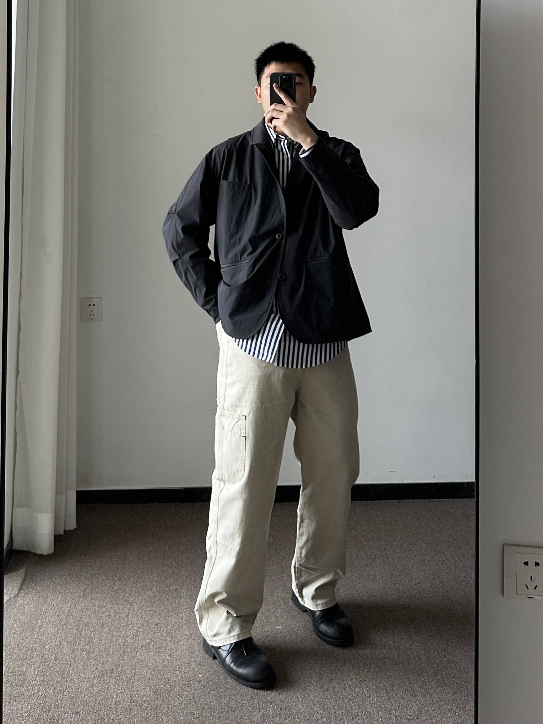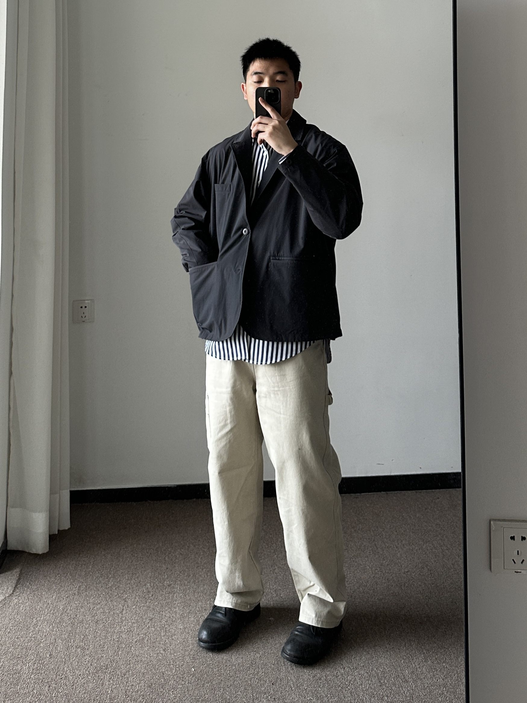 素人也能好看系列~ 174cm/65kg 🧥- 机能西装外套,偏短款。海军蓝条纹衬衫,单穿有难度,内搭不错。 👖- 浅色系伐木裤,微喇版型,自在感🉑。 👟- 复古大头皮鞋。