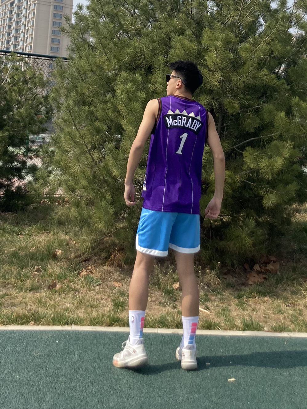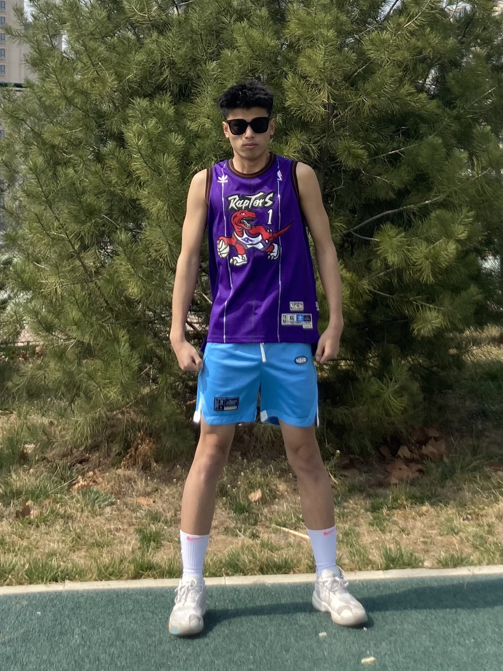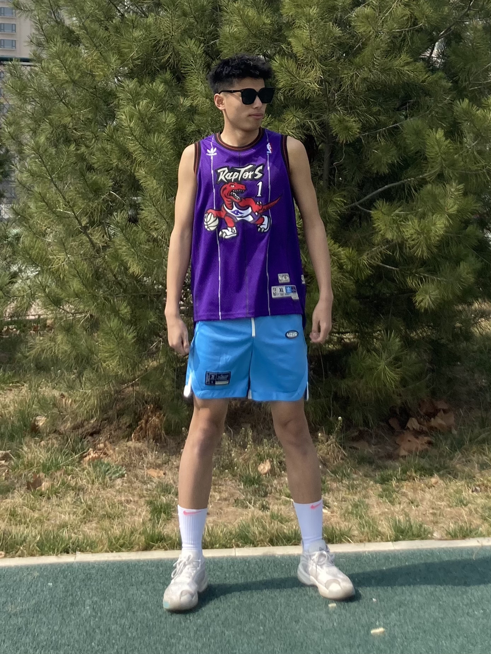 身高|体重:183/57kg 🧍♂️ 穿搭风格:美式运动风格 👔 上衣:猛龙麦迪球衣 👖 下装:UZIS天际蓝短裤